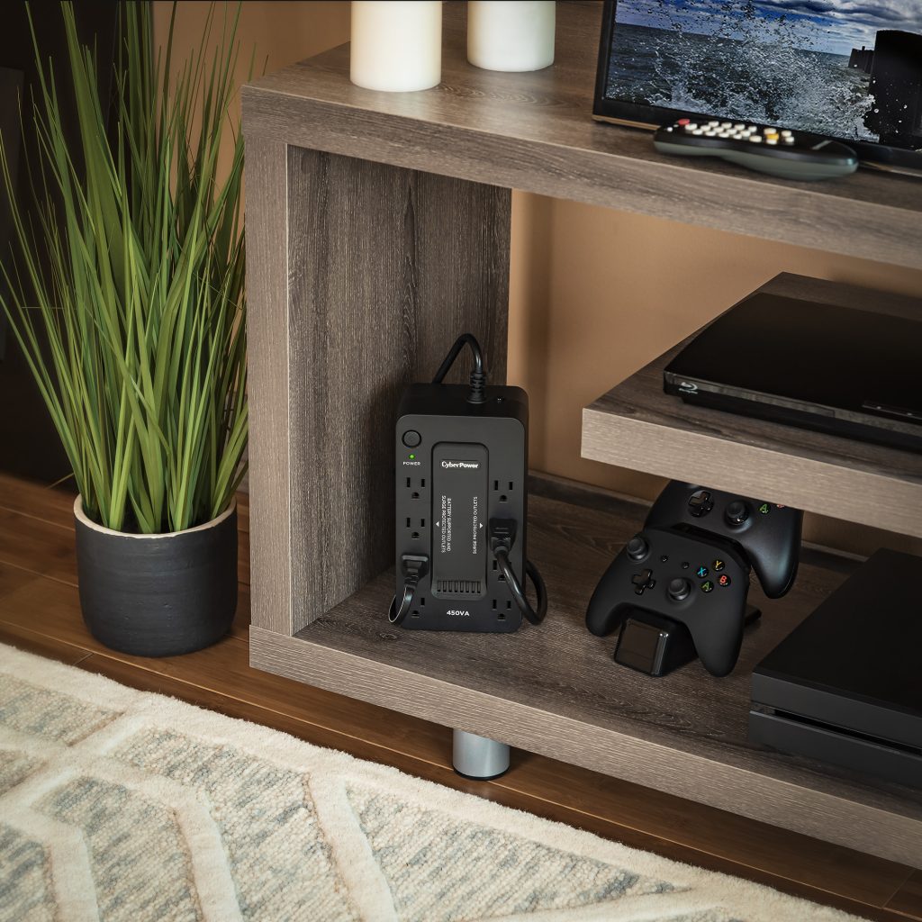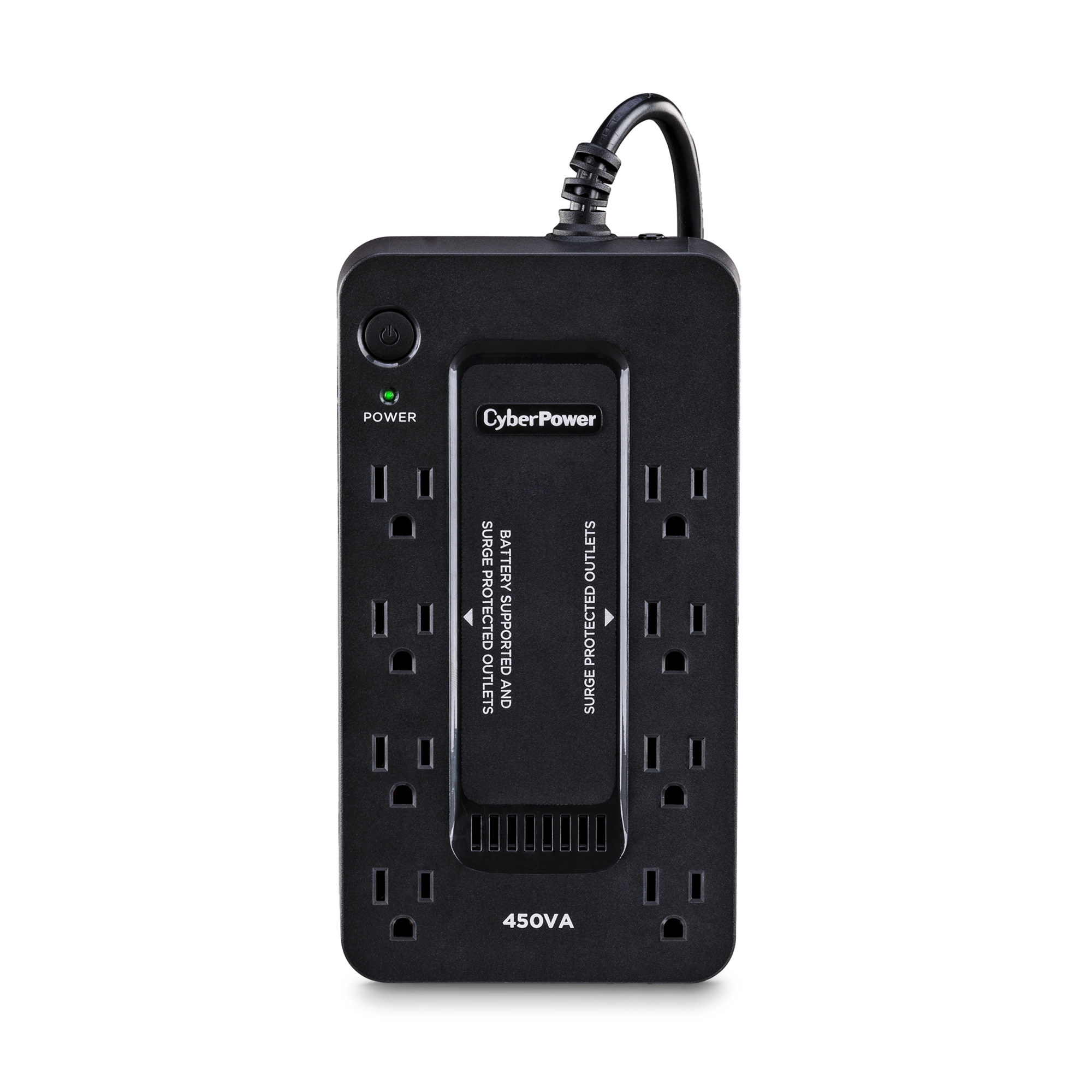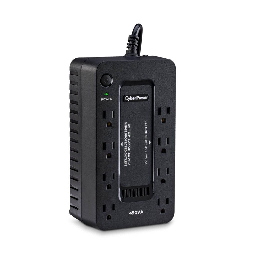The CyberPower SE450B uninterruptible power supply (UPS) system provides surge protection for lightning-induced surges and other power events that can damage electronic equipment. This unit delivers enough battery backup to connected electronics during a utility power failure, so you can perform a proper shutdown to protect against the loss of data and damage to valuable electronics including computers, gaming consoles, and broadband routers. Including a sleek new design, this UPS is perfect for all your home office and entertainment needs.