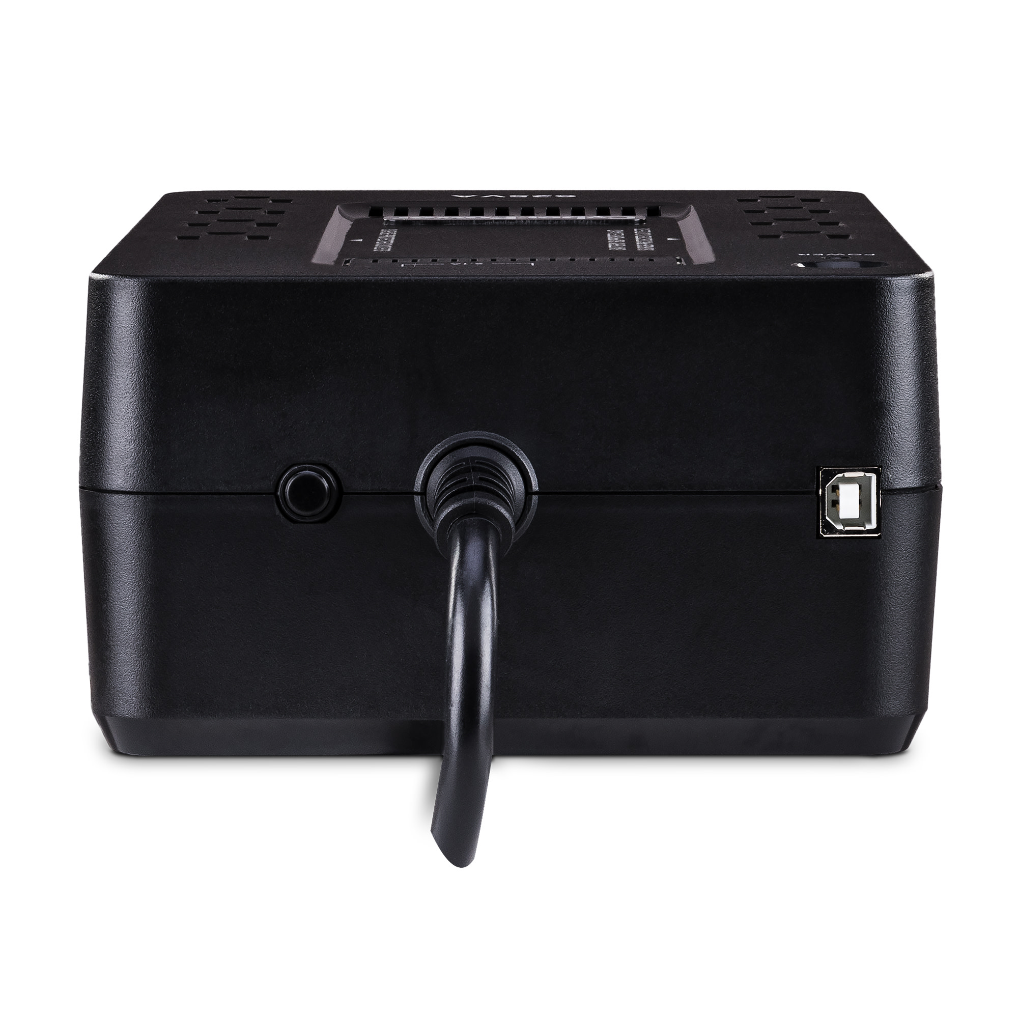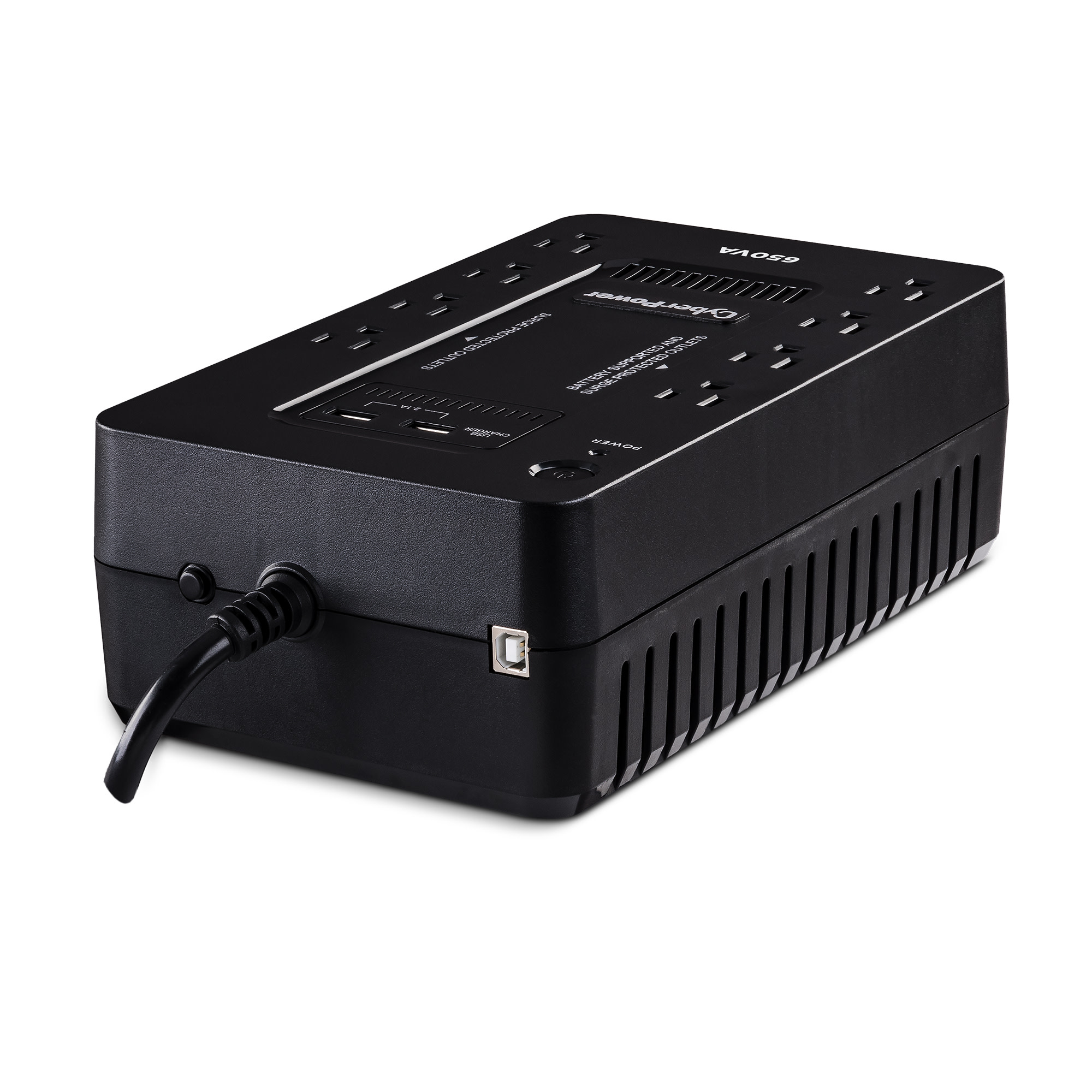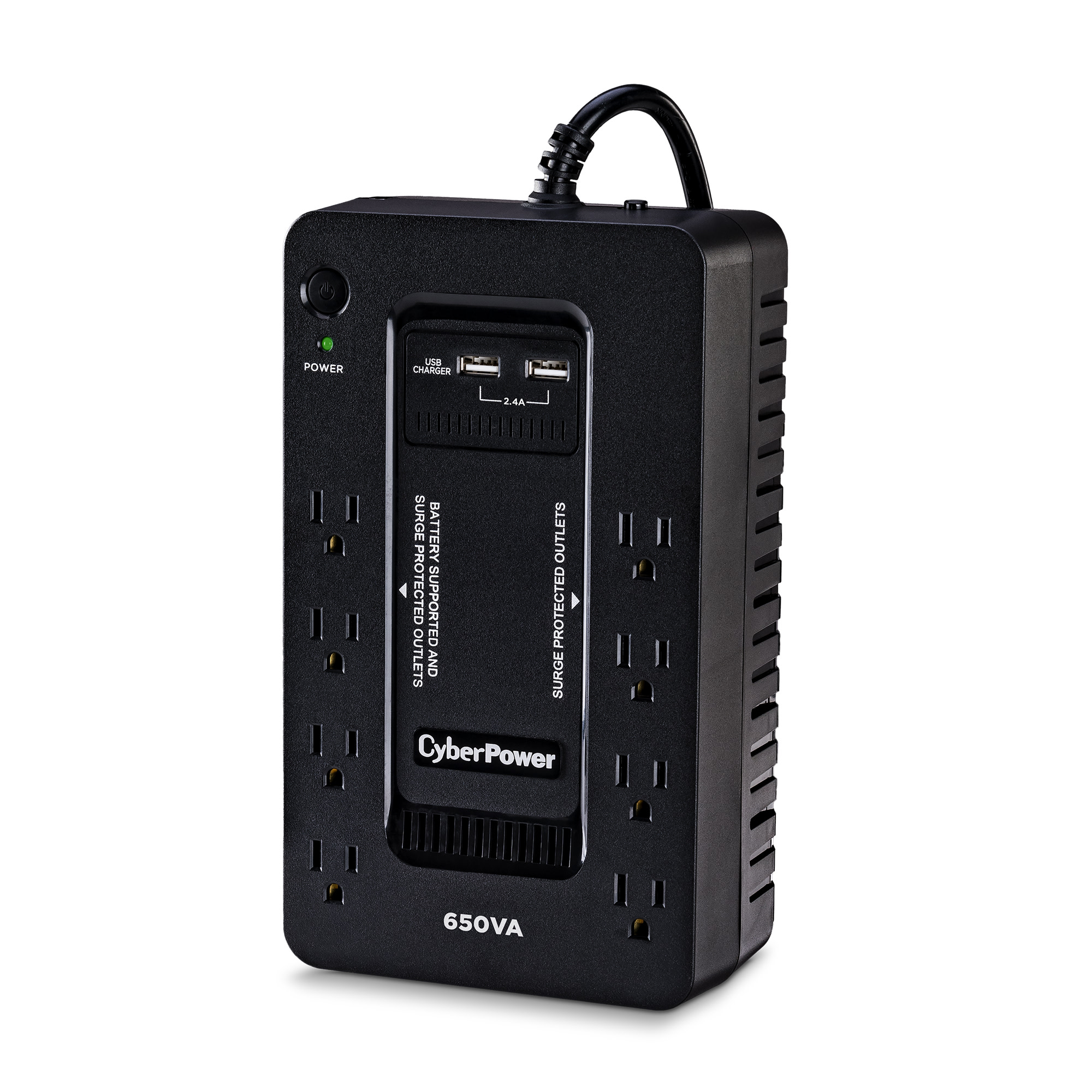 The CyberPower SX650G Battery Backup/ UPS (uninterruptible power supply) system safeguards small office workstations, networking devices and home entertainment systems by providing battery power during power interruptions and surge protection. Data line protection is included for phone/network (RJ11). The HID-compliant USB enables connectivity. The SX650G has a capacity of 650 VA/375 Watts, eight outlets (four widely-spaced) to accommodate large transformer plugs.