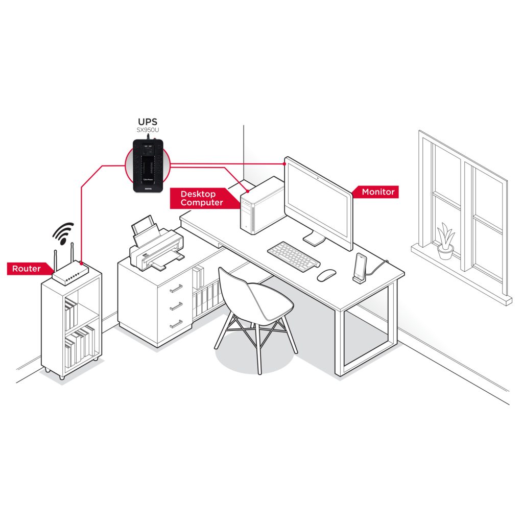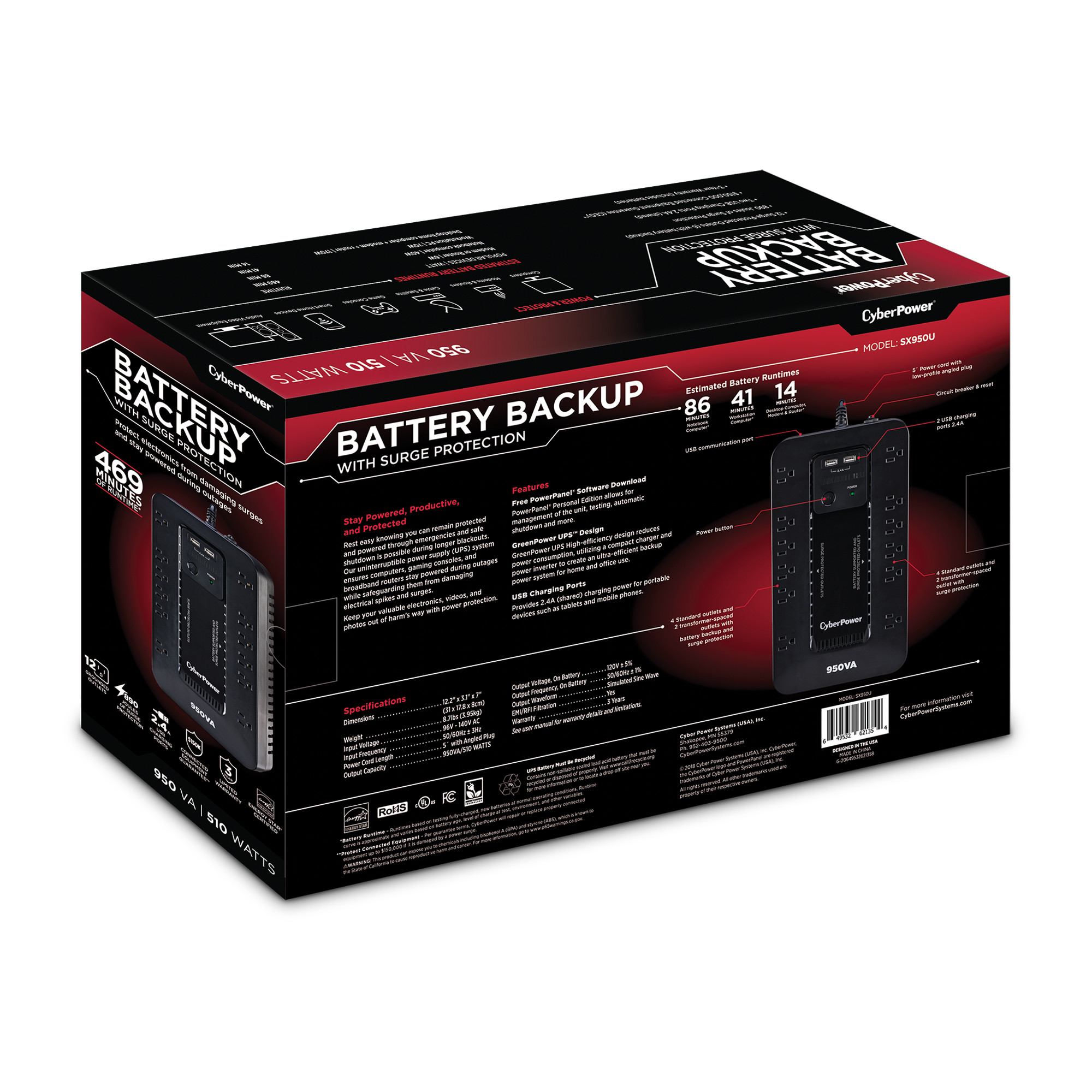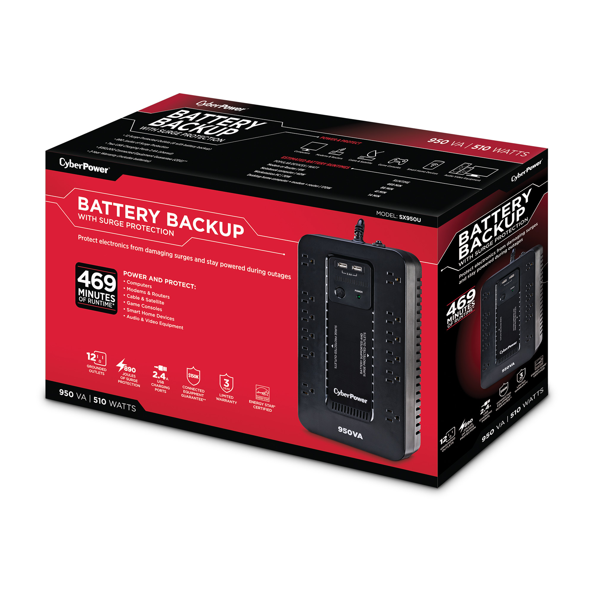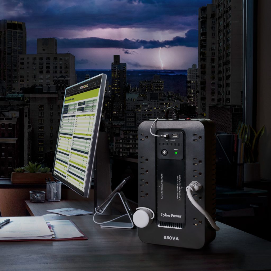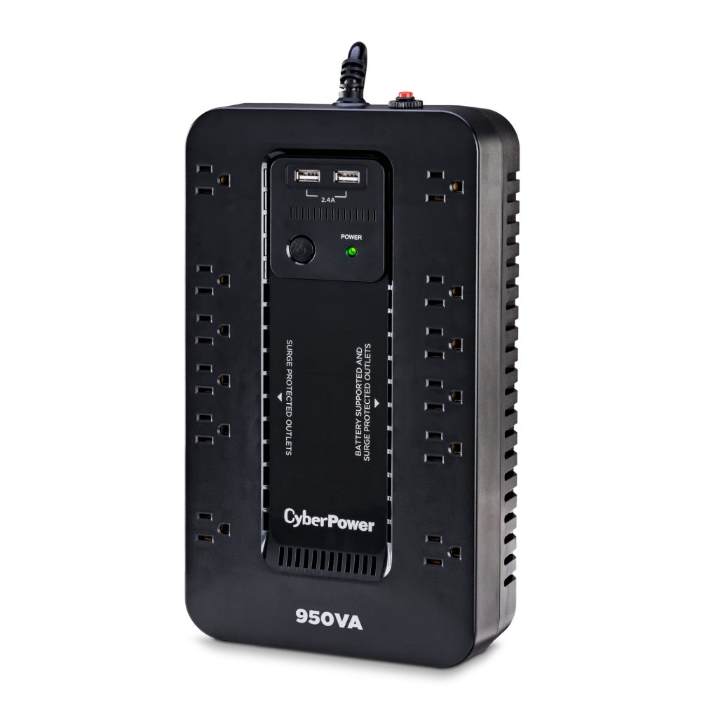 The CyberPower SX950U-FC uninterruptible power supply (UPS) system provides surge protection for lightning-induced surges and other power events that can damage electronic equipment. This unit delivers enough battery backup to connected electronics during a utility power failure, so you can perform a graceful shutdown to protect against the loss of data and damage to valuable electronics including computers, gaming consoles, and broadband routers.
