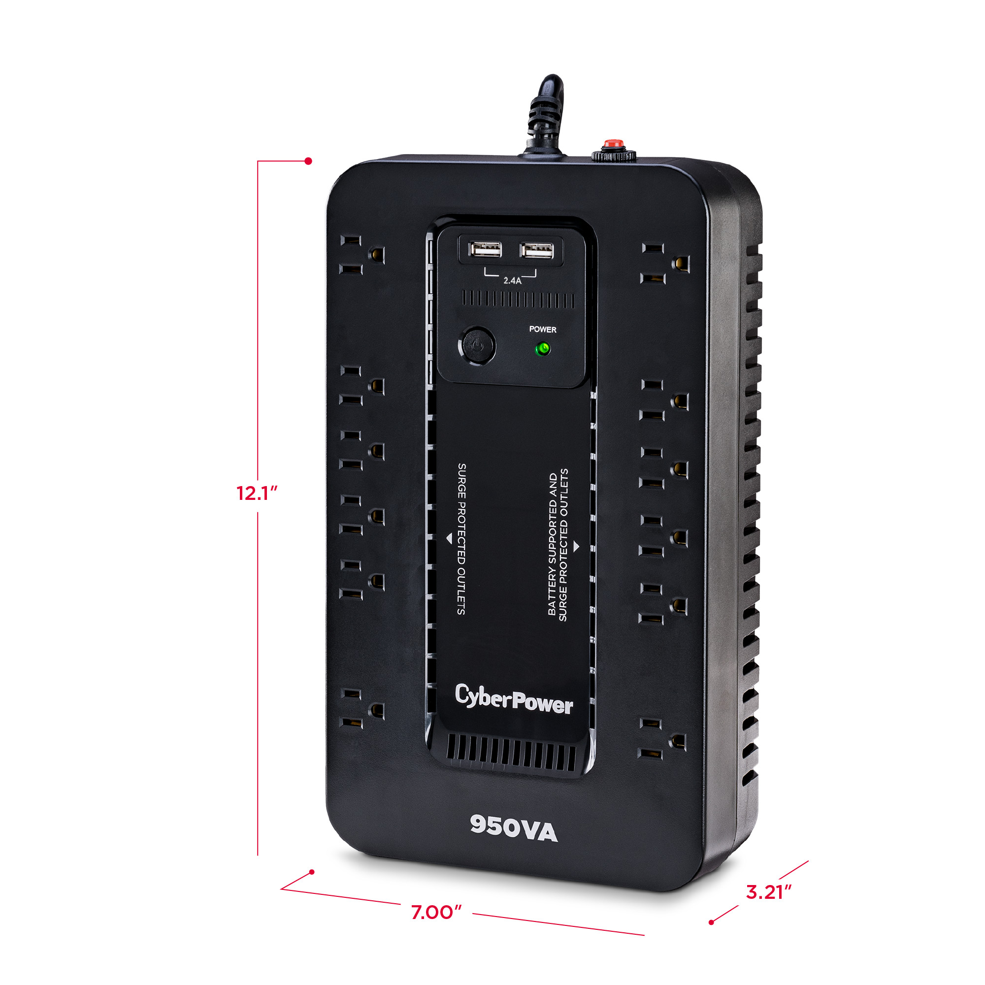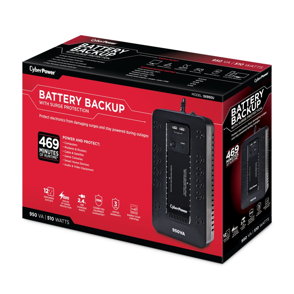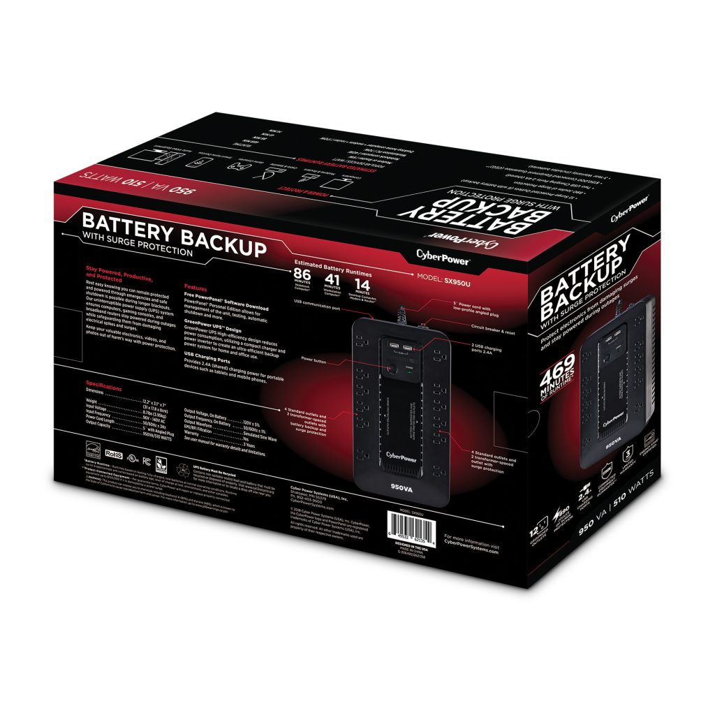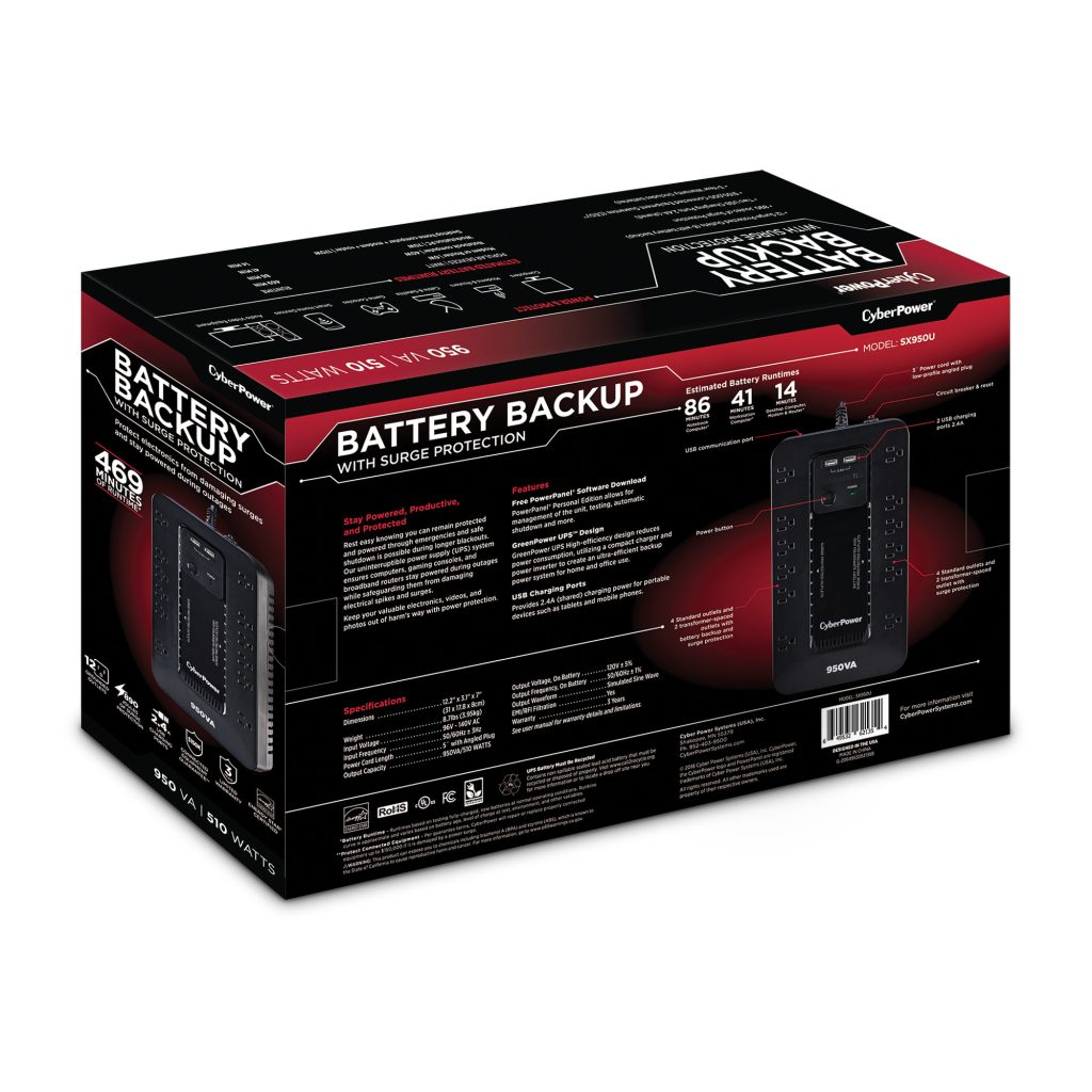 The SX950U has two USB charging ports with 2.4 amp shared total output which gives you a faster charging time. This unit is designed to minimize noise for a quieter work environment and to run efficiently to reduce power consumption. Including a sleek new design, this UPS is perfect for all your home office and entertainment needs.