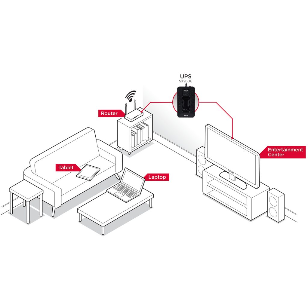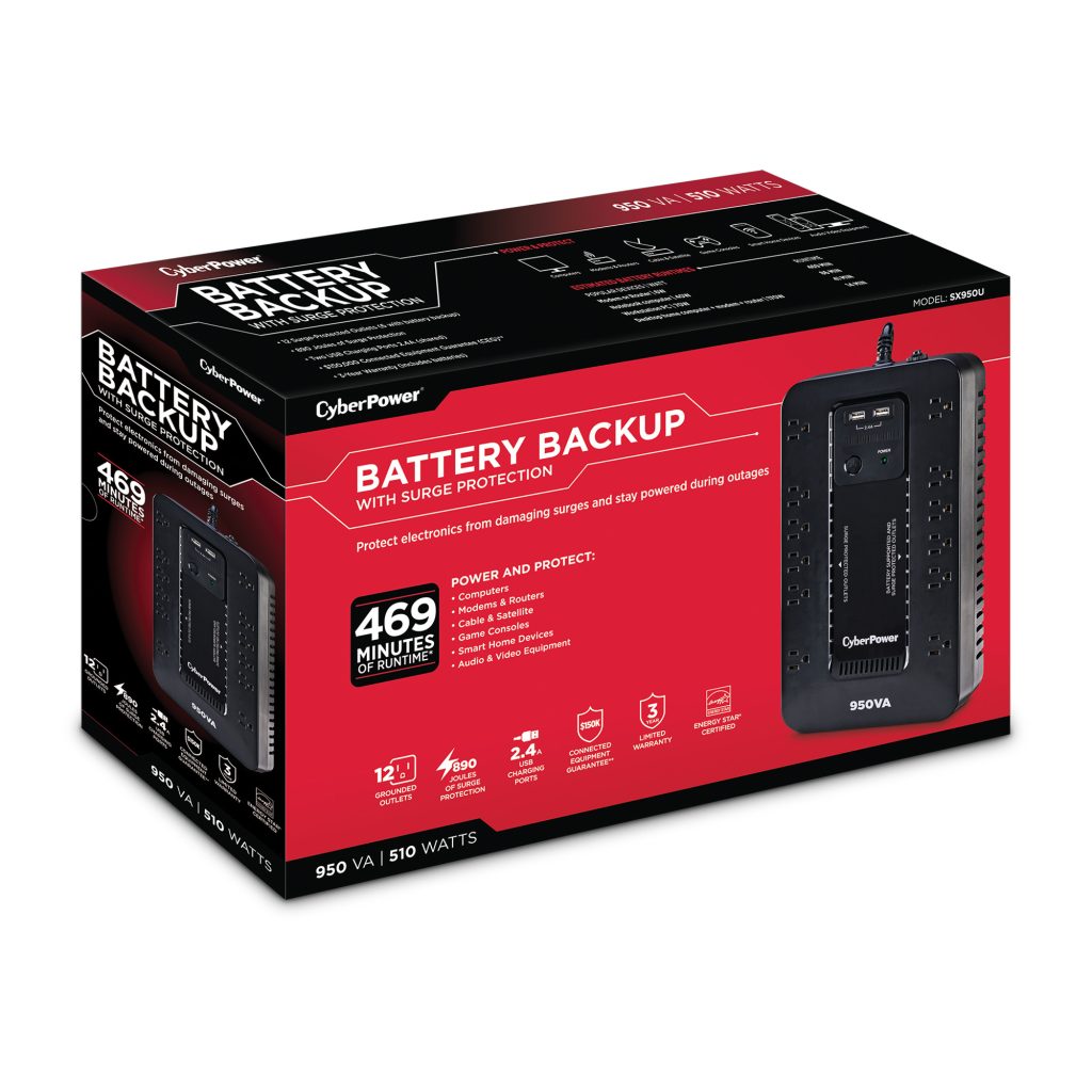 The CyberPower SX950U uninterruptible power supply (UPS) system provides surge protection for lightning-induced surges and other power events that can damage electronic equipment. This unit delivers enough battery backup to connected electronics during a utility power failure, so you can perform a graceful shutdown to protect against the loss of data and damage to valuable electronics including computers, gaming consoles, and broadband routers.