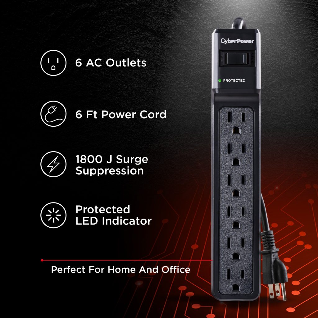 The CyberPower CSB606 surge protector safeguards home and office electronics, like computers, from power spikes and surges. It delivers 1800 joules of protection, featuring 6 outlets and a 6-foot power cord. Equipped with metal oxide varistor (MOV) technology, an EMI/RFI noise filter, and keyhole mounting slots, it ensures reliable performance. The CSB606 includes a Limited Lifetime Warranty and a Connected Equipment Guarantee.
