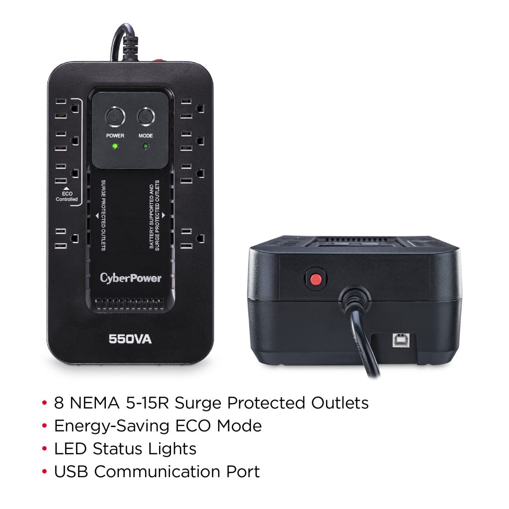 A compact UPS with standby topology, the CyberPower Ecologic EC550G provides battery backup (using simulated sine wave output) and surge protection for desktop computers, workstations, networking devices, and home entertainment systems. During power interruptions, the EC550G offers reliable power protection and battery backup. When the battery backup detects that the computer is off or in sleep mode, computer peripherals connected to the ECO Mode, surge protected outlets will be automatically turned off, reducing power usage and lowering energy costs (USB connection required). The EC550G comes with a three-year warranty (including coverage of batteries) and a $100,000 Connected Equipment Guarantee.
