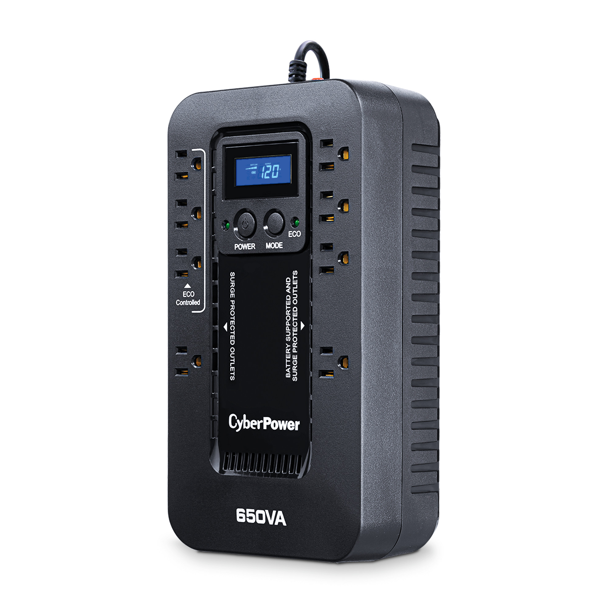 A compact UPS with standby topology, the CyberPower Ecologic EC650LCD provides battery backup (using simulated sine wave output) and surge protection for desktop computers, workstations, networking devices, and home entertainment systems. During power interruptions, the EC650LCD offers reliable power protection and battery backup. When the battery backup detects that the computer is off or in sleep mode, computer peripherals connected to the ECO Mode, surge protected outlets will be automatically turned off, reducing power usage and lowering energy costs (USB connection required). The multifunction LCD provides immediate, detailed information about the UPS battery and power conditions and generates alerts of potential problems before they can affect critical equipment and cause downtime. The EC650LCD comes with a three-year warranty (including coverage of batteries) and a $100,000 Connected Equipment Guarantee.