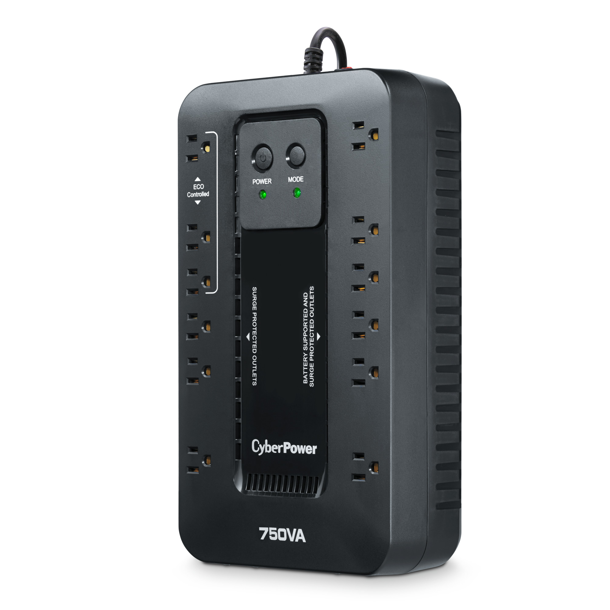 A compact UPS with standby topology, the CyberPower Ecologic EC750G provides battery backup (using simulated sine wave output) and surge protection for desktop computers, workstations, networking devices, and home entertainment systems. During power interruptions, the EC750G offers reliable power protection and battery backup. When the battery backup detects that the computer is off or in sleep mode, computer peripherals connected to the ECO Mode, surge protected outlets will be automatically turned off, reducing power usage and lowering energy costs (USB connection required). The EC750G comes with a three-year warranty (including coverage of batteries) and a $100,000 Connected Equipment Guarantee.