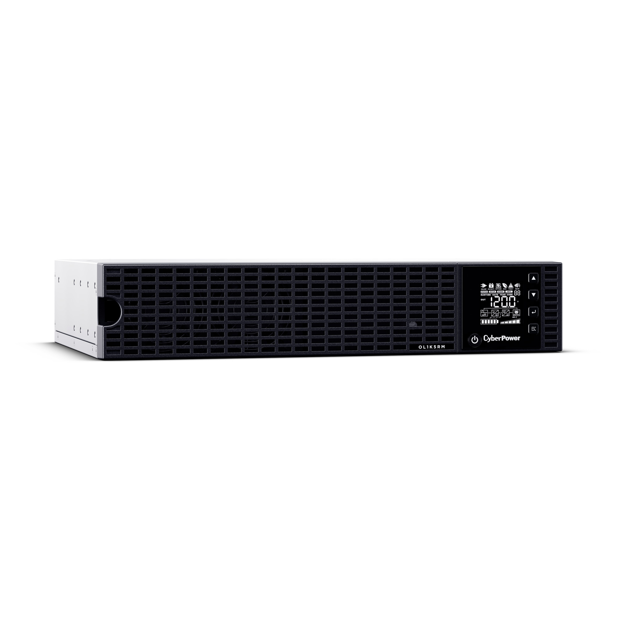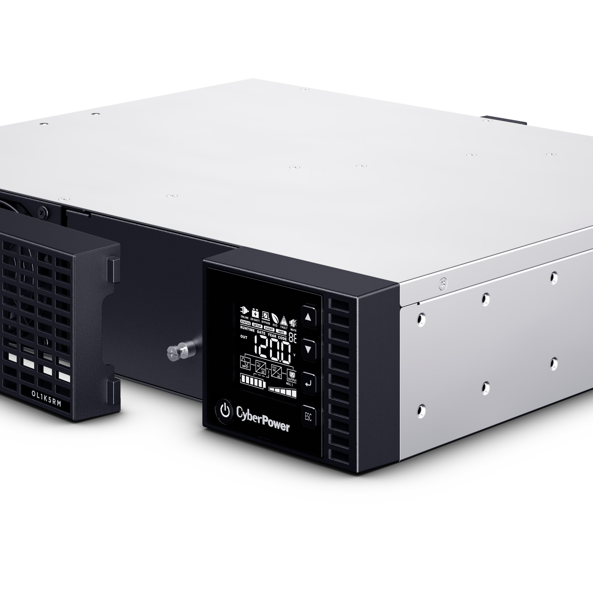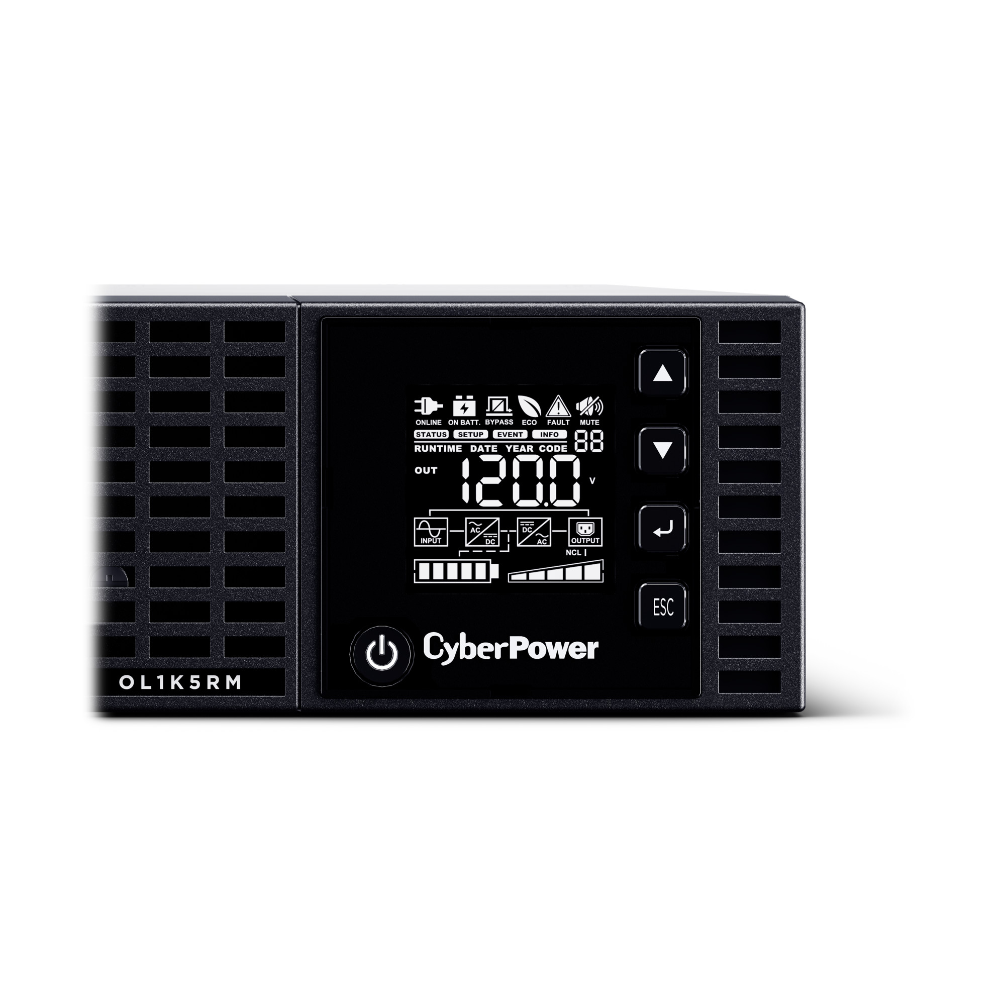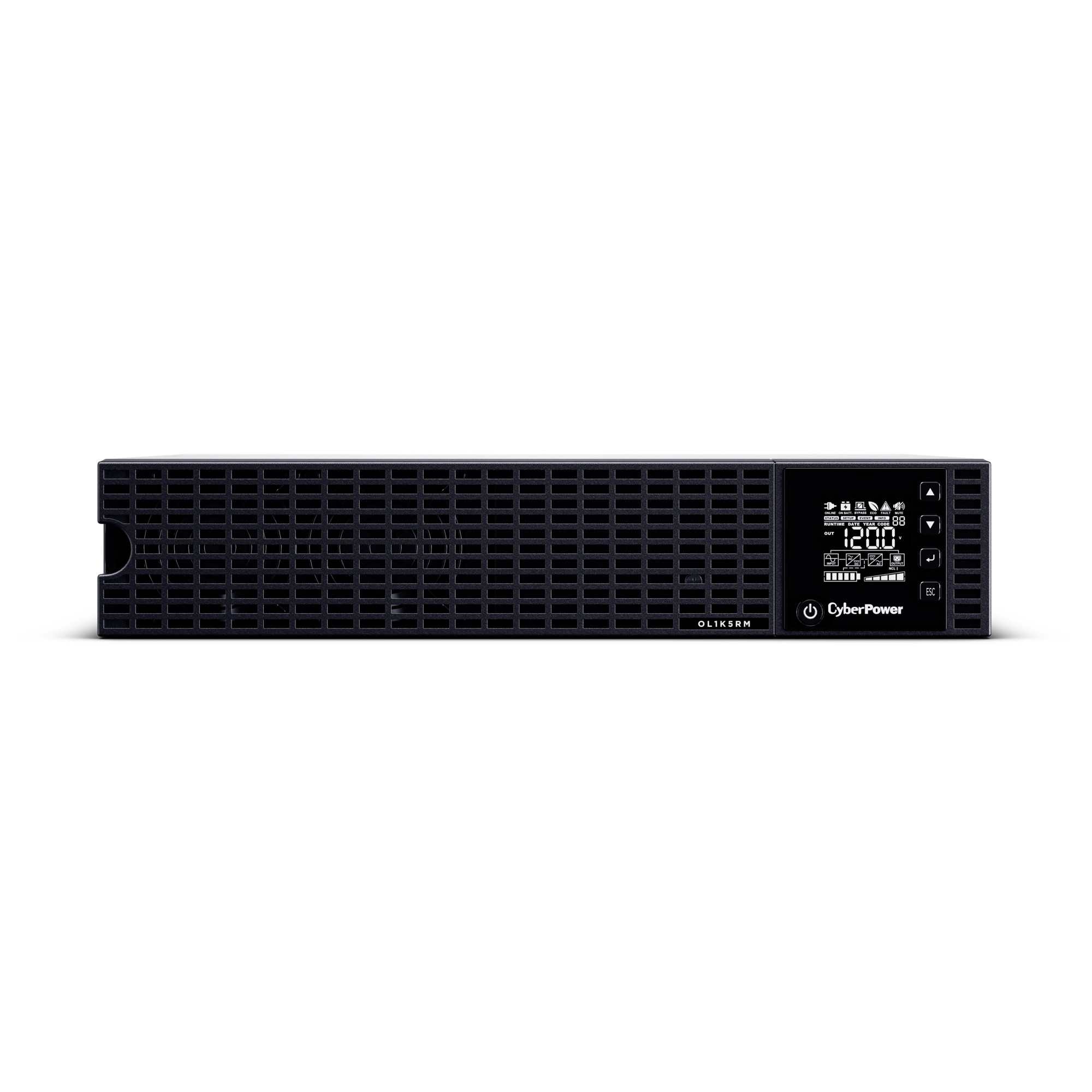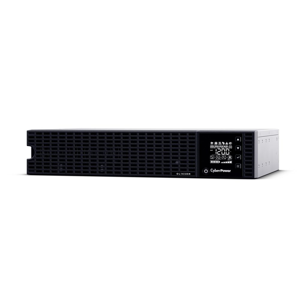 The CyberPower Essential Online OL1K5RM is a rack mounted UPS with double conversion topology. It provides sine wave output to critical applications and equipment that require seamless power correction. The Extended Battery Module (EBM) expands runtime, and Fast Charge Technology restores full backup power faster. This model comes with Smart Battery Management charging technology, and energy-saving GreenPower UPS™ ECO Mode.
