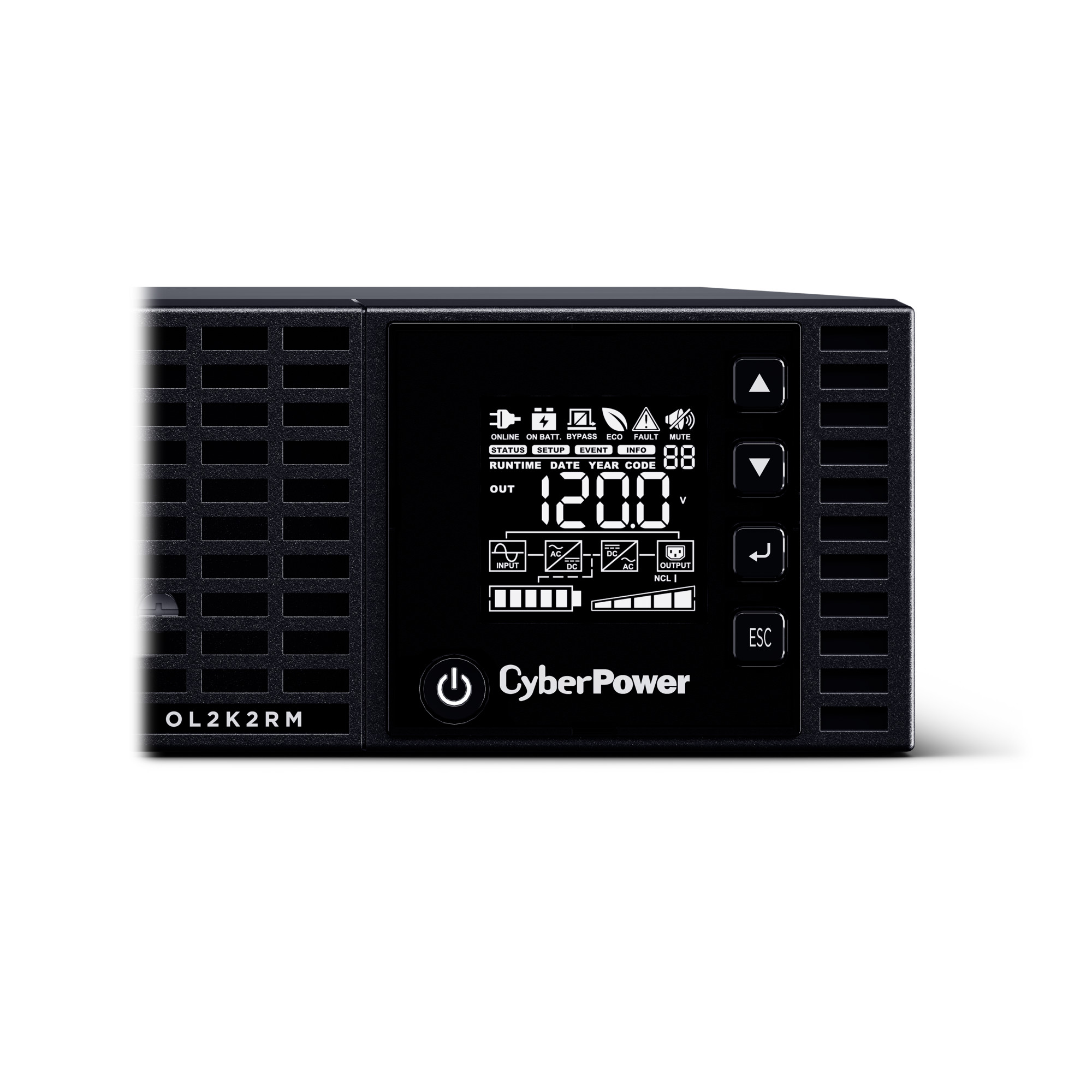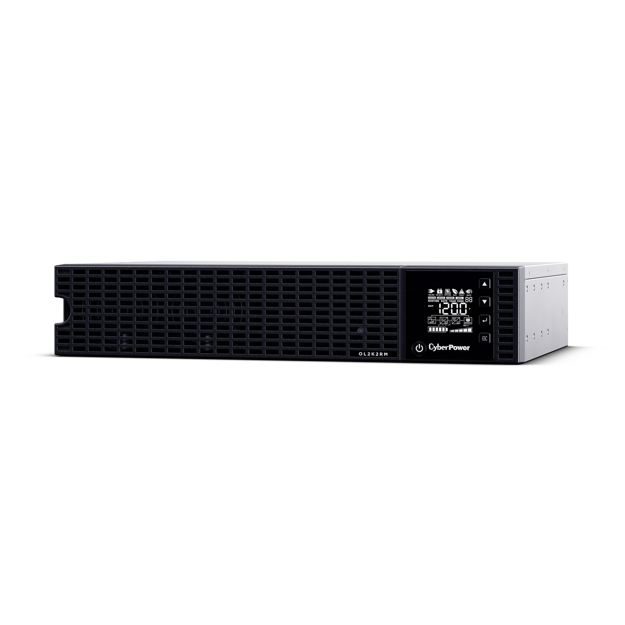 The CyberPower Essential Online OL2K2RM is a rack mounted UPS with double conversion topology. It provides sine wave output to critical applications and equipment that require seamless power correction. The Extended Battery Module (EBM) expands runtime, and Fast Charge Technology restores full backup power faster. This model comes with Smart Battery Management charging technology, and energy-saving GreenPower UPS™ ECO Mode.