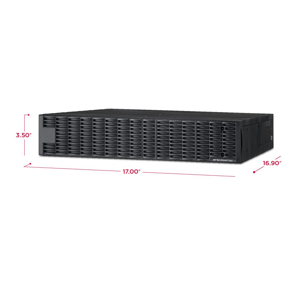 Up to ten EBMs can be added to the UPS, and the module's DC plug-and-play power connectors allow for daisy-chaining additional EBMs to a UPS system. The BP36V60ART2U typically has a UPS charging time of 4 hours (0-90%), regardless of whether one or ten EBMS are installed, and comes with a three-year warranty.