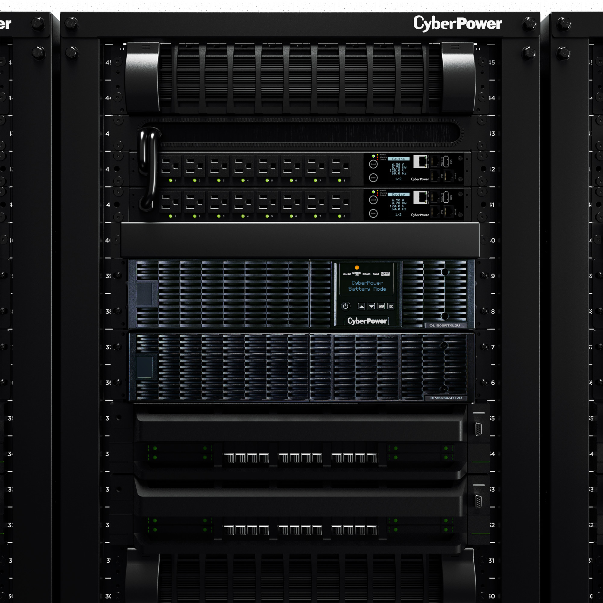 The CyberPower BP36V60ART2U rack/tower convertible Extended Battery Module (EBM), which extends battery runtimes during power outages, is designed for Smart App Online UPS systems OL1000RTXL2U, OL1000RTXL2UN, OL1500RTXL2U and OL1500RTXL2UN. This EBM takes 2U of rack space and can be installed in a rack or tower configuration to match the UPS form factor. It also has a built-in battery charger, providing Fast Charge Technology to quickly restore the backup power supply to full capacity.
