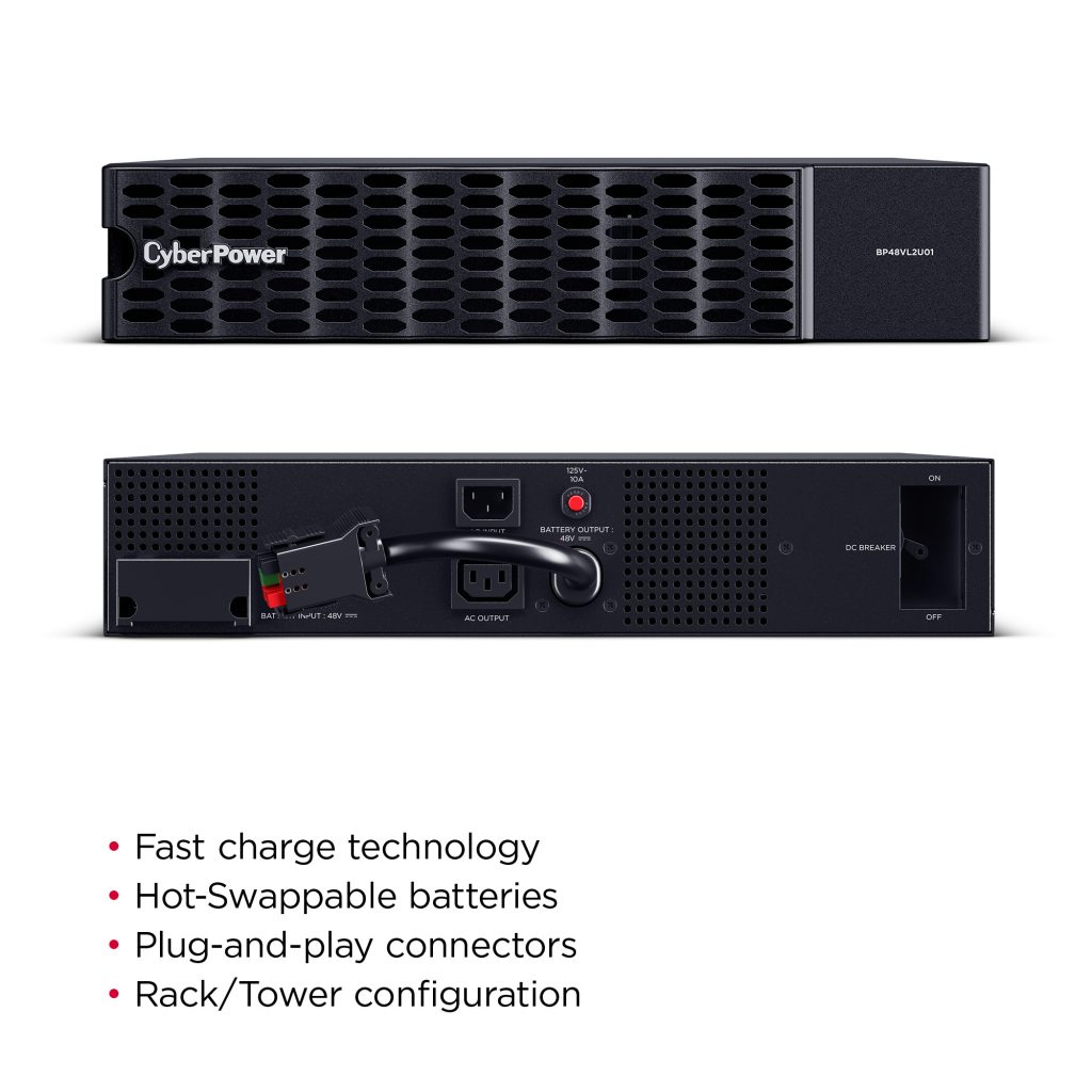 The CyberPower BP48VL2U01 rack/tower convertible Extended Battery Module (EBM) extends battery runtimes during power outages and is designed for CyberPower UPS systems OL3KRTHD.
