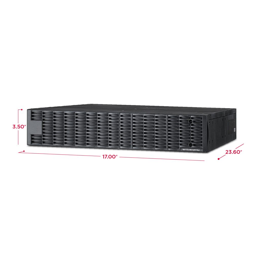 Up to ten EBMs can be added to the UPS, and the module's DC plug-and-play power connectors allow for daisy-chaining additional EBMs to a UPS system. The BP72V60ART2U typically has a UPS charging time of 4 hours (0-90%), regardless of whether one or ten EBMS are installed, and comes with a three-year warranty.