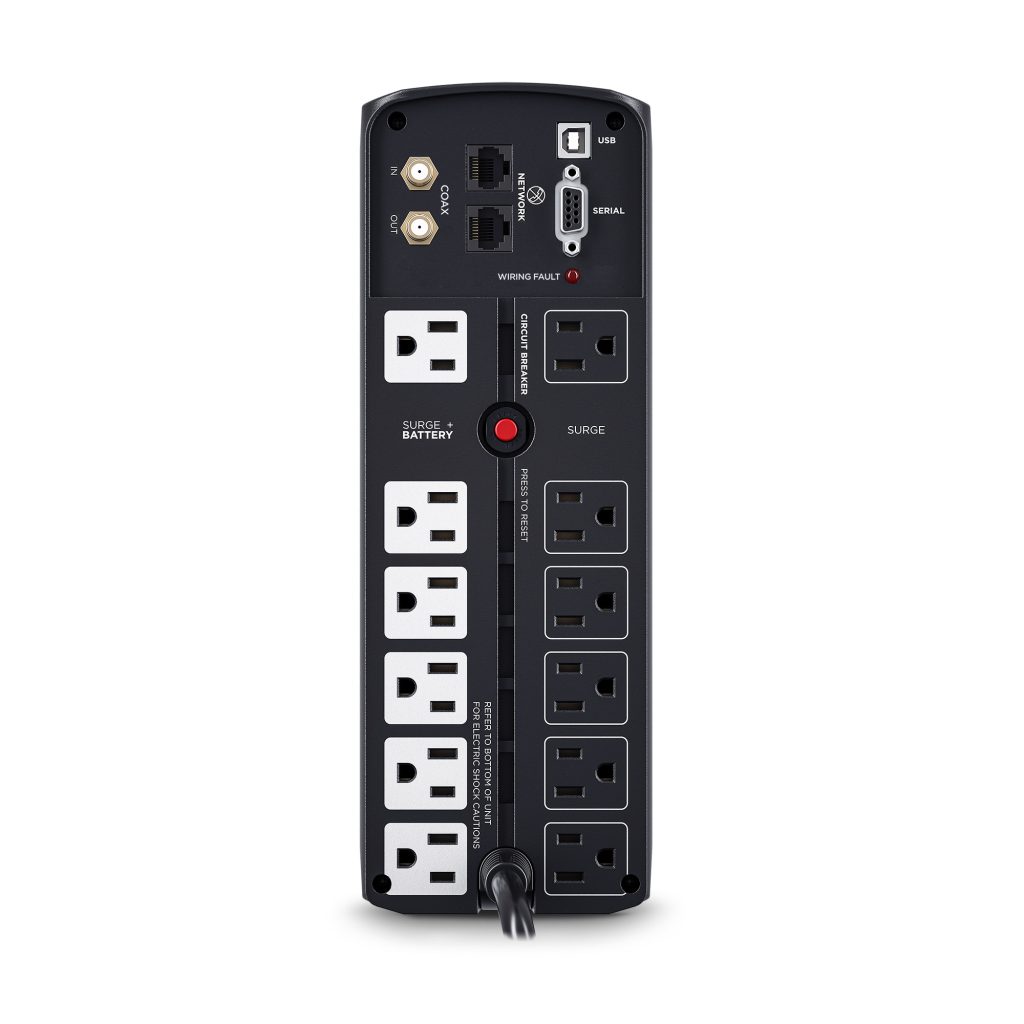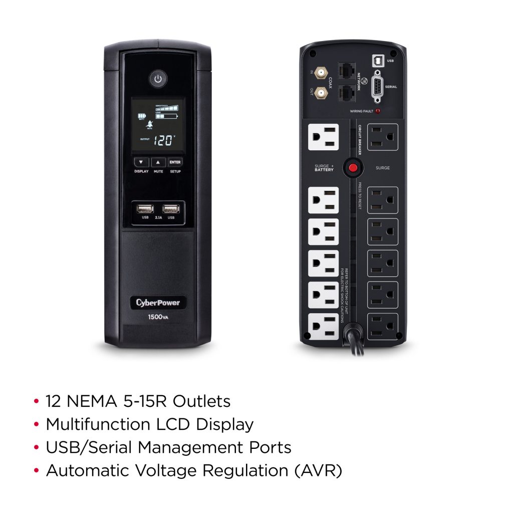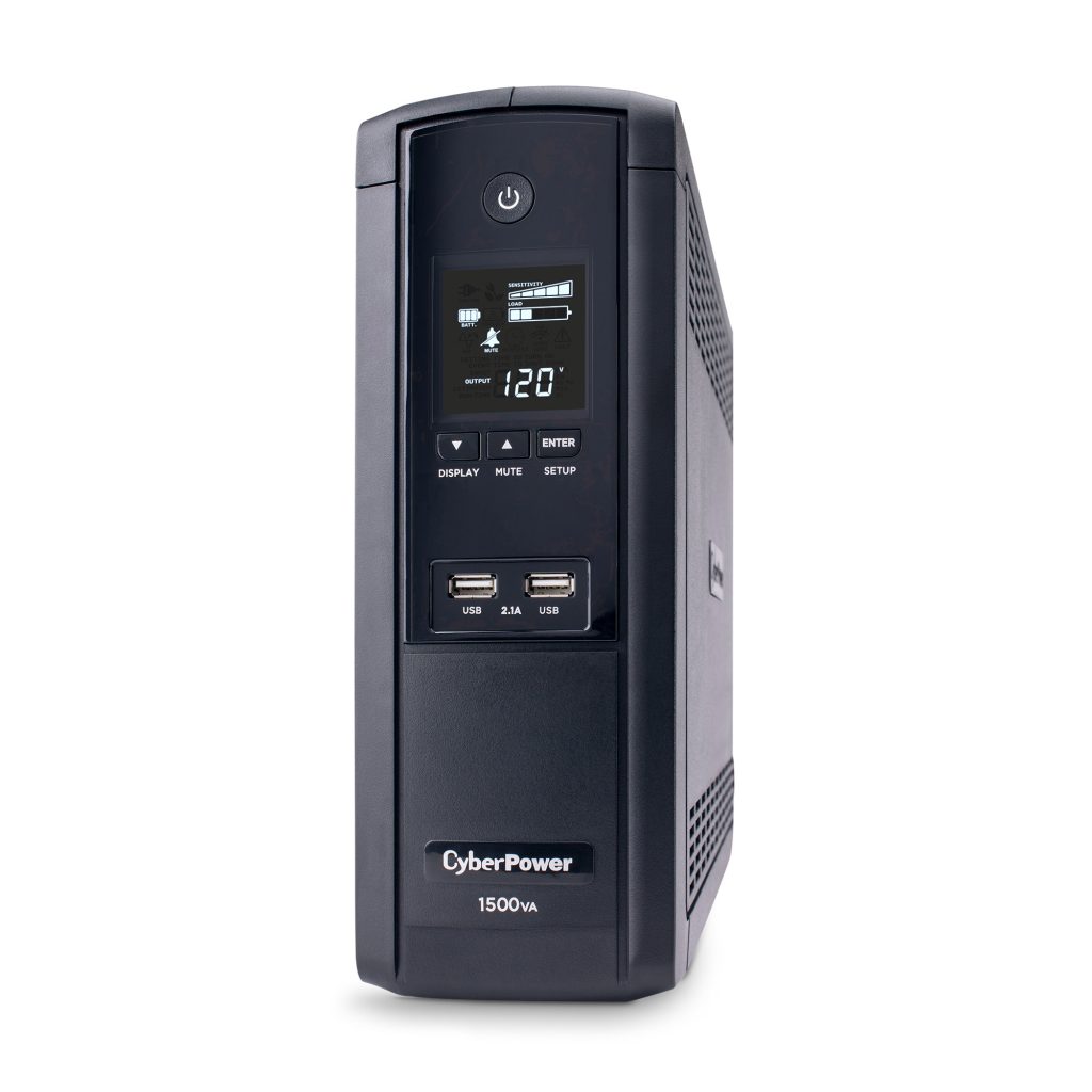 A mini-tower UPS with line interactive topology, the CyberPower Intelligent LCD Series BRG1500AVRLCDTAA provides battery backup (using simulated sine wave output) and surge protection for desktop computers, workstations, networking devices, and home entertainment systems.