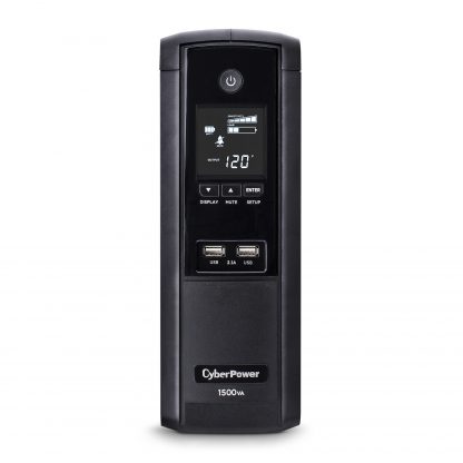 A mini-tower UPS with line interactive topology, the CyberPower Intelligent LCD Series BRG1500AVRLCDTAA provides battery backup (using simulated sine wave output) and surge protection for desktop computers, workstations, networking devices, and home entertainment systems.