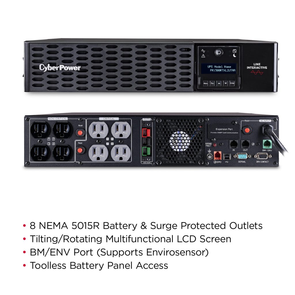 The PR1500RTXL2UTAA is a Smart App Sinewave rack/tower convertible UPS with line-interactive topology, surge protection, and battery backup. CyberPower’s Smart App Sinewave series has sine wave output to eliminate power gaps that can be detected by sensitive equipment and cause unexpected shutdowns.