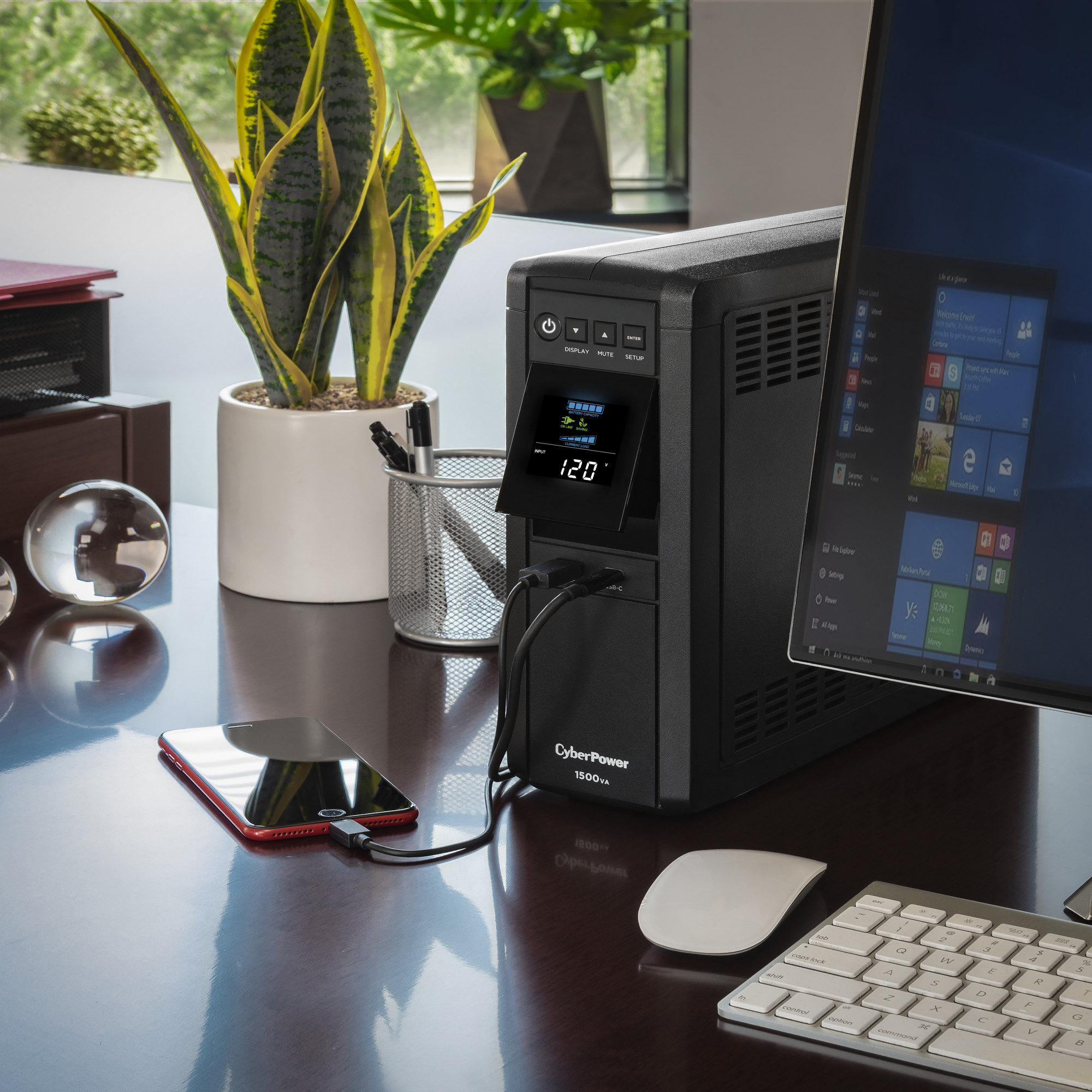 The GX1500U features an advanced multifunction control panel with a color LCD to quickly confirm status and alerts at-a-glance. The screen tilts for easy viewing when the UPS is placed in a low position such as under a desk. Two USB charge ports (one Type-A and one Type-C) power portable devices such as mobile phones and tablets, even during a utility power failure.