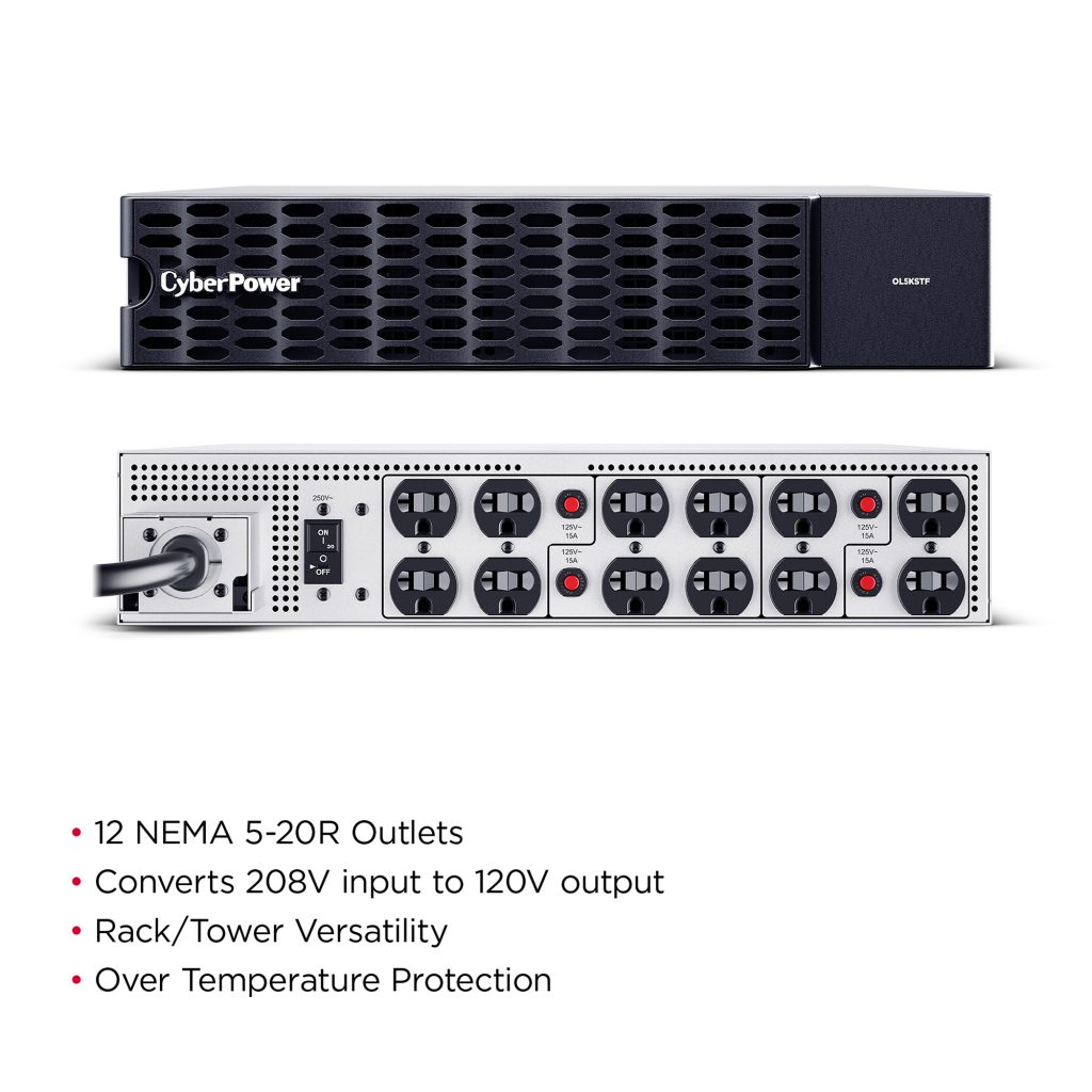 The step-down transformer provides IT managers the ability to support 120 V output requirements. With twelve (12) NEMA 5-20R outlets available, users will have sufficient outlets to connect multiple 120 V devices running at 15 A and/or 20 A. If additional outlets are needed, CyberPower has a number of different Power Distribution Units (PDU) making it easy to address your specific outlet needs. - Rack/Tower Versatility