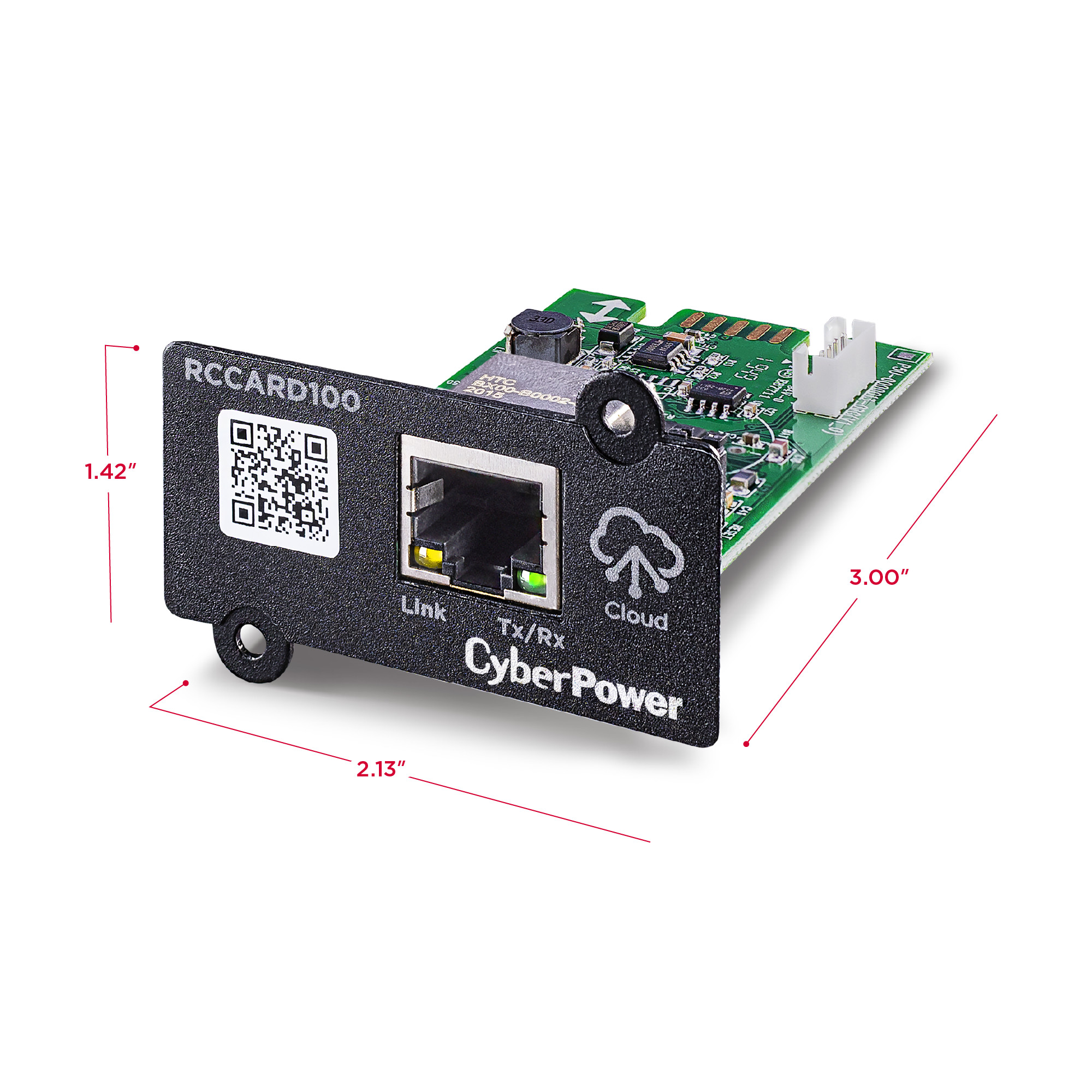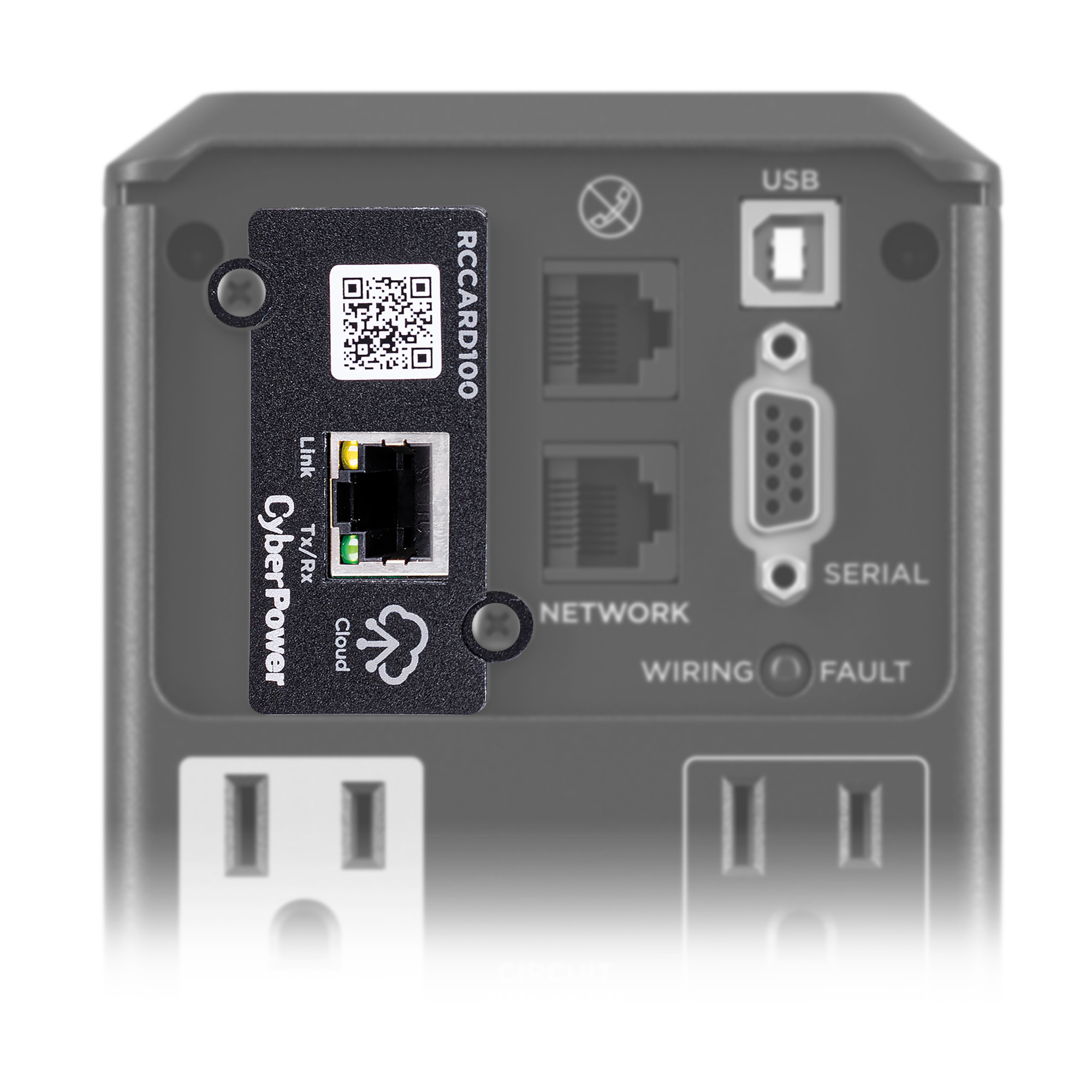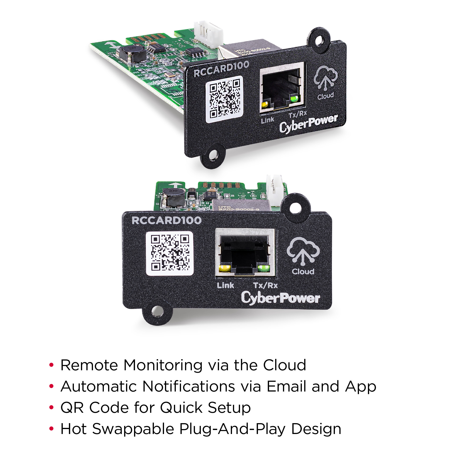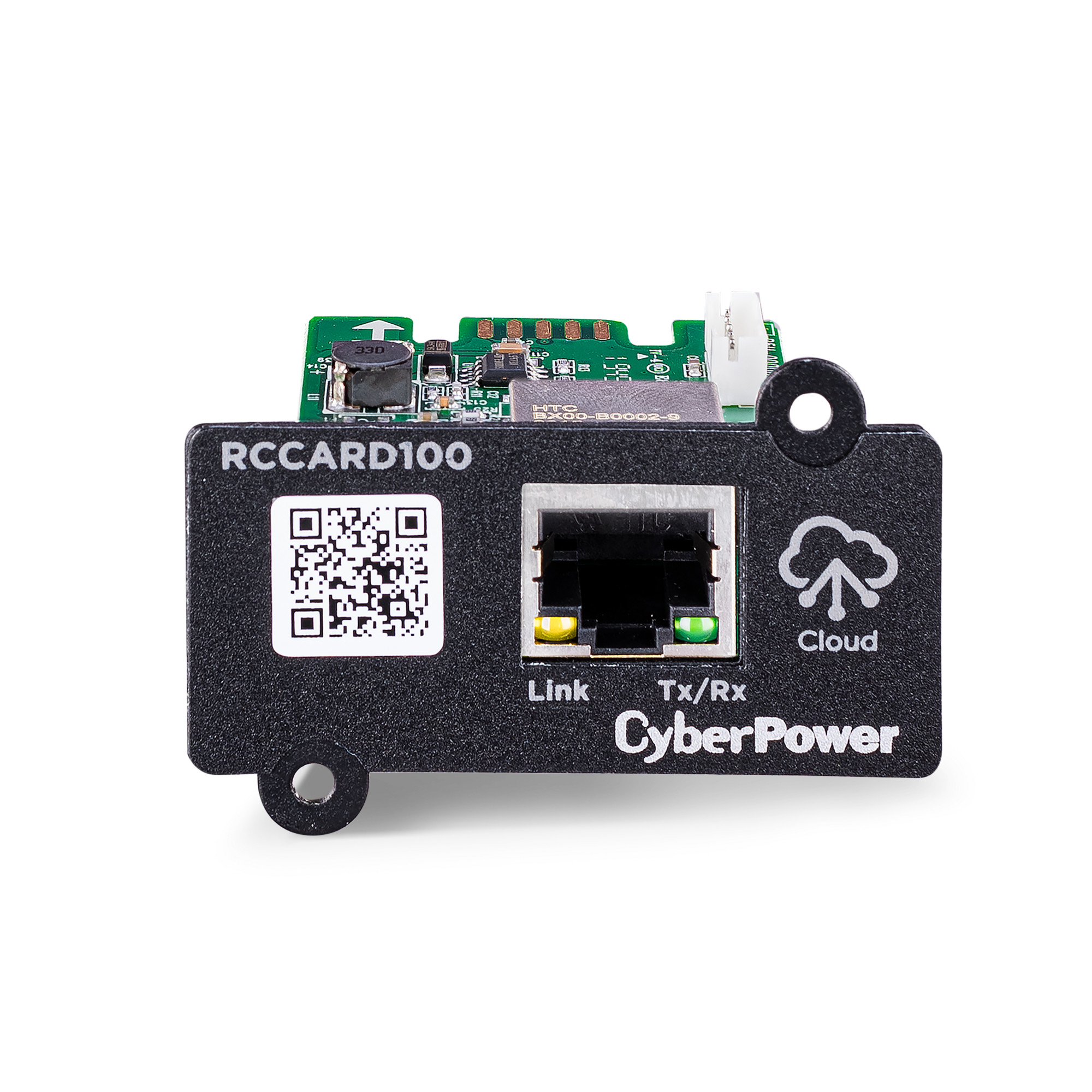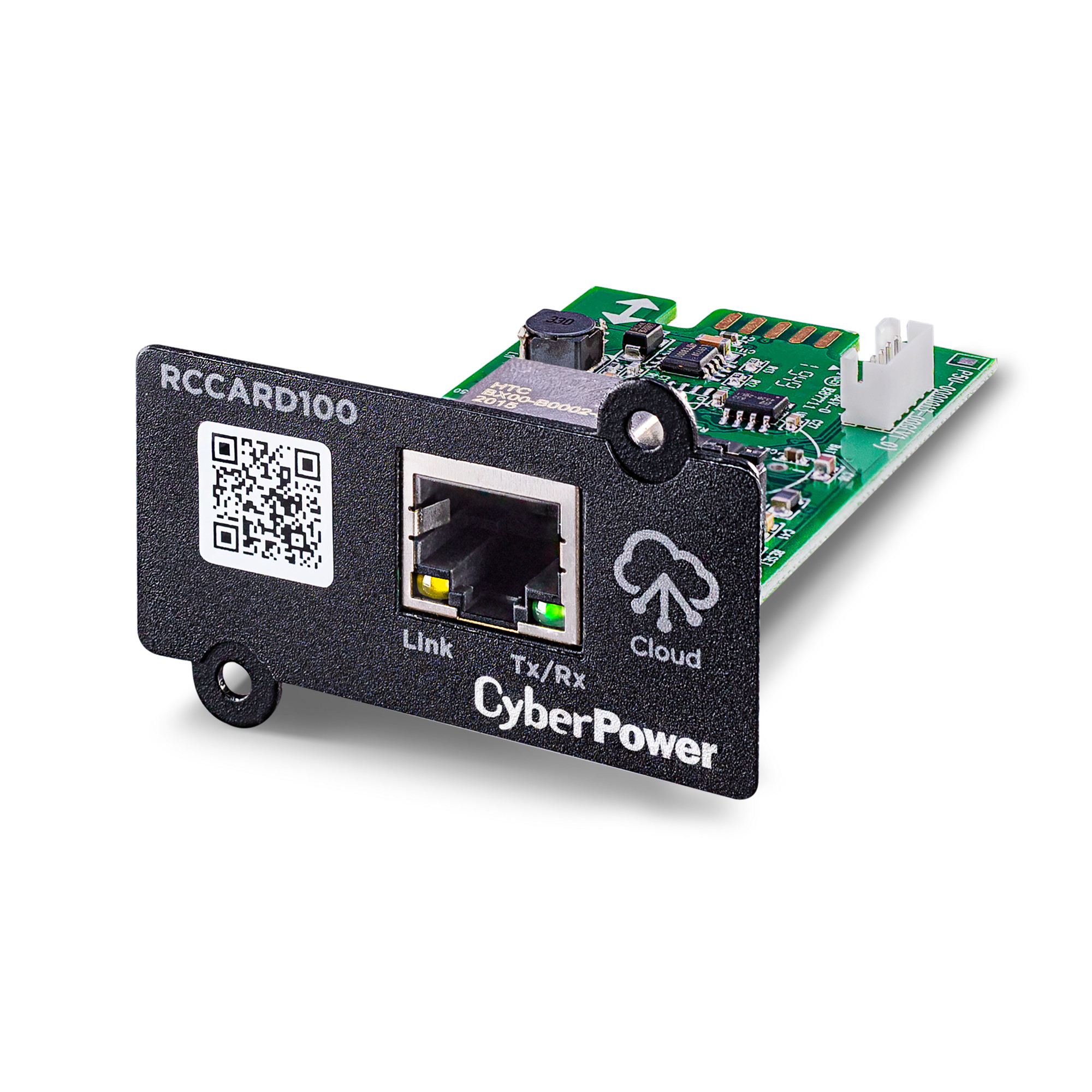 A UPS monitoring card, the CyberPower RCCARD100 monitors the operation of select CyberPower UPS that are setup with PowerPanel® Cloud system. A secure web portal or mobile application is used to remotely monitor a UPS and provide notifications on power events.