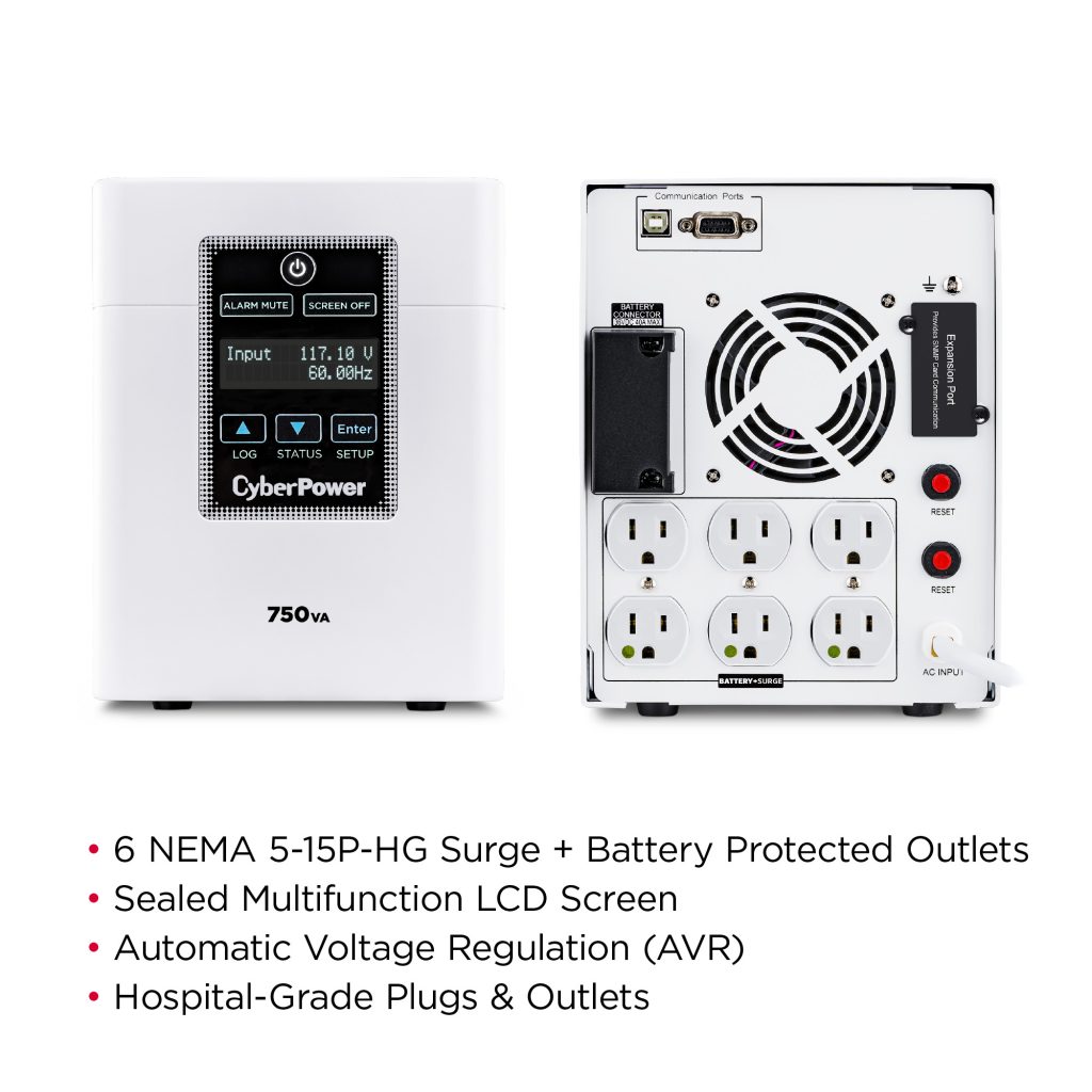 The CyberPower M750L medical-grade UPS delivers clean, consistent backup power to sensitive medical equipment in hospitals and healthcare facilities. Designed for use in patient care vicinities, the M750L has been tested to meet all UL 60601-1 requirements, and includes hospital-grade plugs and outlets. The M750L also includes a built-in isolation transformer to minimize the current leakage and eliminate line noise, a tip-resistant mini-tower design, replaceable batteries, and a sealed, spray-resistant LCD panel.