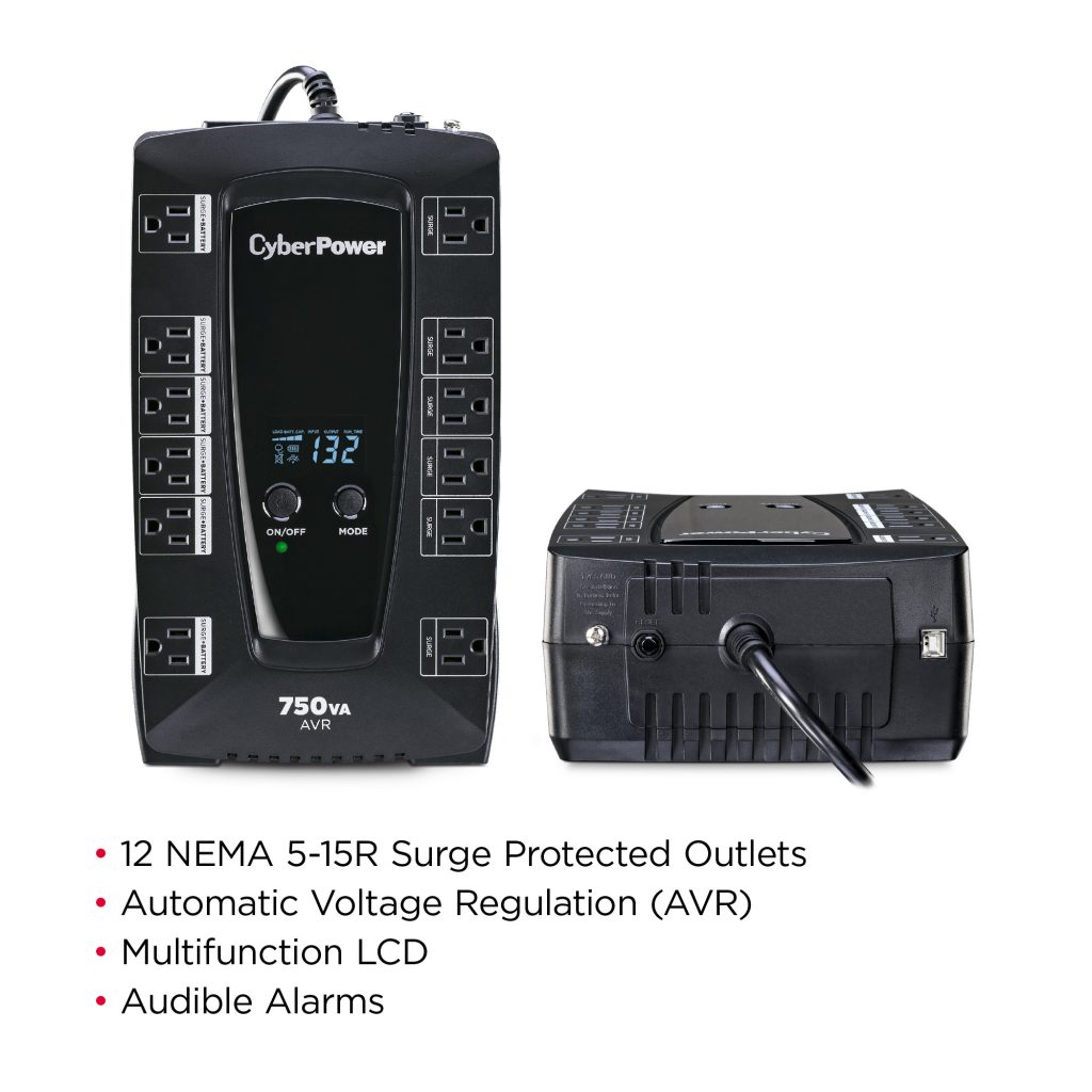 A compact UPS with line interactive topology, the CyberPower AVRG750LCD provides battery backup (using simulated sine wave output) and surge protection for desktop computers, workstations, networking devices, and home entertainment systems. The AVRG750LCD uses Automatic Voltage Regulation (AVR) to correct minor power fluctuations without switching to battery power, which extends battery life. AVR is essential in areas where power fluctuations occur frequently. The AVRG750LCD comes with a three-year warranty (including coverage of batteries) and a $150,000 Connected Equipment Guarantee.