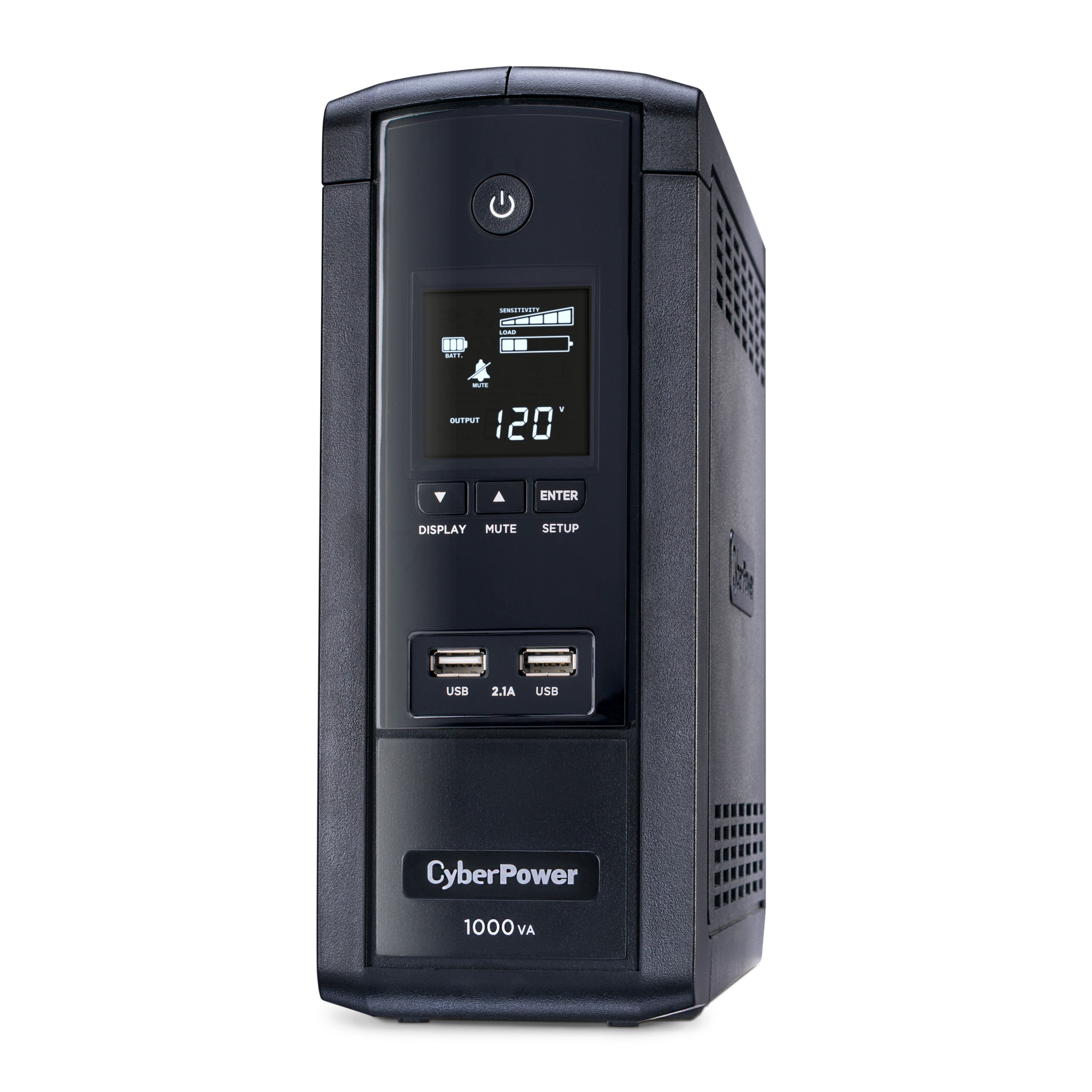 A mini-tower UPS with line interactive topology, the CyberPower Intelligent LCD Series BRG1000AVRLCD provides battery backup (using simulated sine wave output) and surge protection for desktop computers, workstations, networking devices, and home entertainment systems.