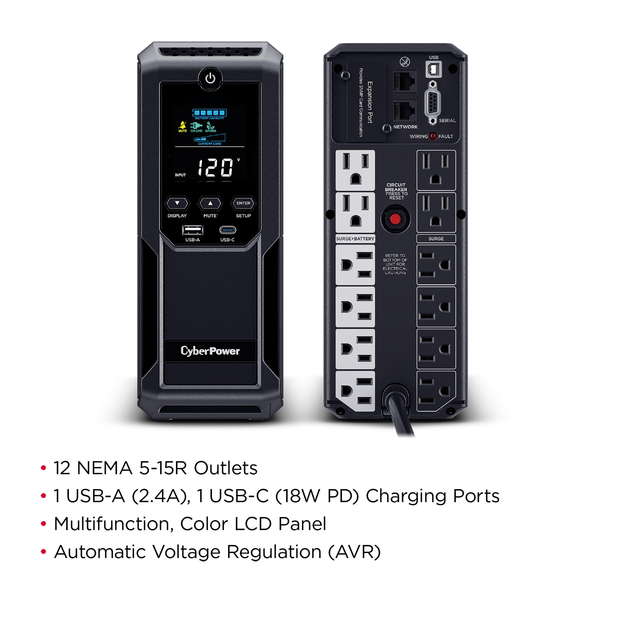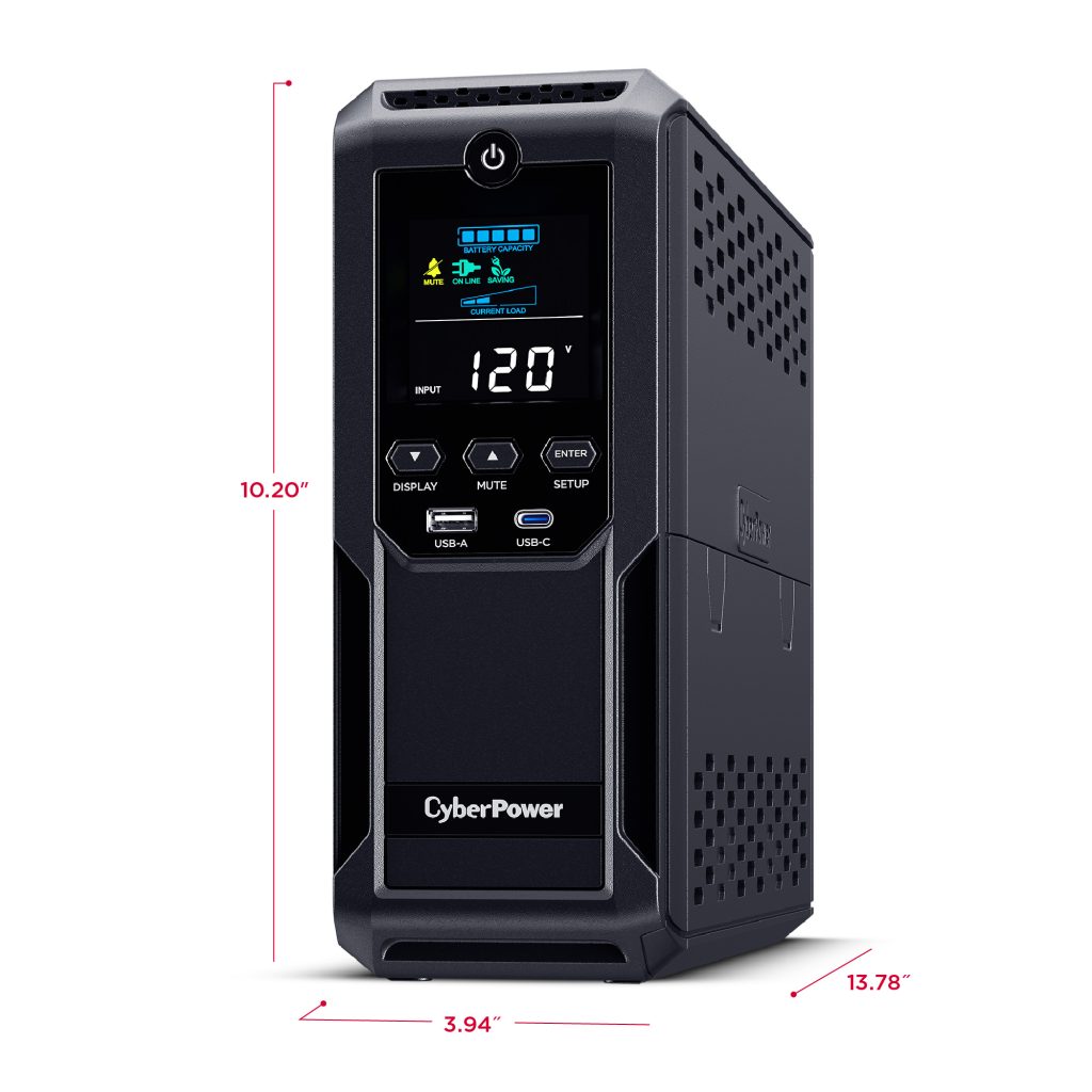 A mini-tower UPS with line interactive topology, the CyberPower Intelligent LCD provides battery backup (using simulated sine wave output) and surge protection for desktop computers, workstations, networking devices, and home entertainment systems. The BRG1500AVRLD2 uses Automatic Voltage Regulation (AVR) to correct minor power fluctuations without switching to battery power, which extends battery life. AVR is essential in areas where power fluctuations occur frequently. The BRG1500AVRLD2 comes with a five year warranty (including coverage of batteries) and a $500,000 Connected Equipment Guarantee.
