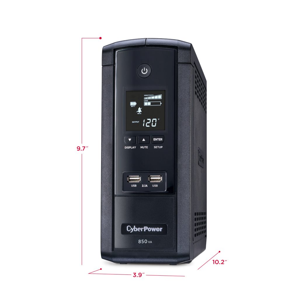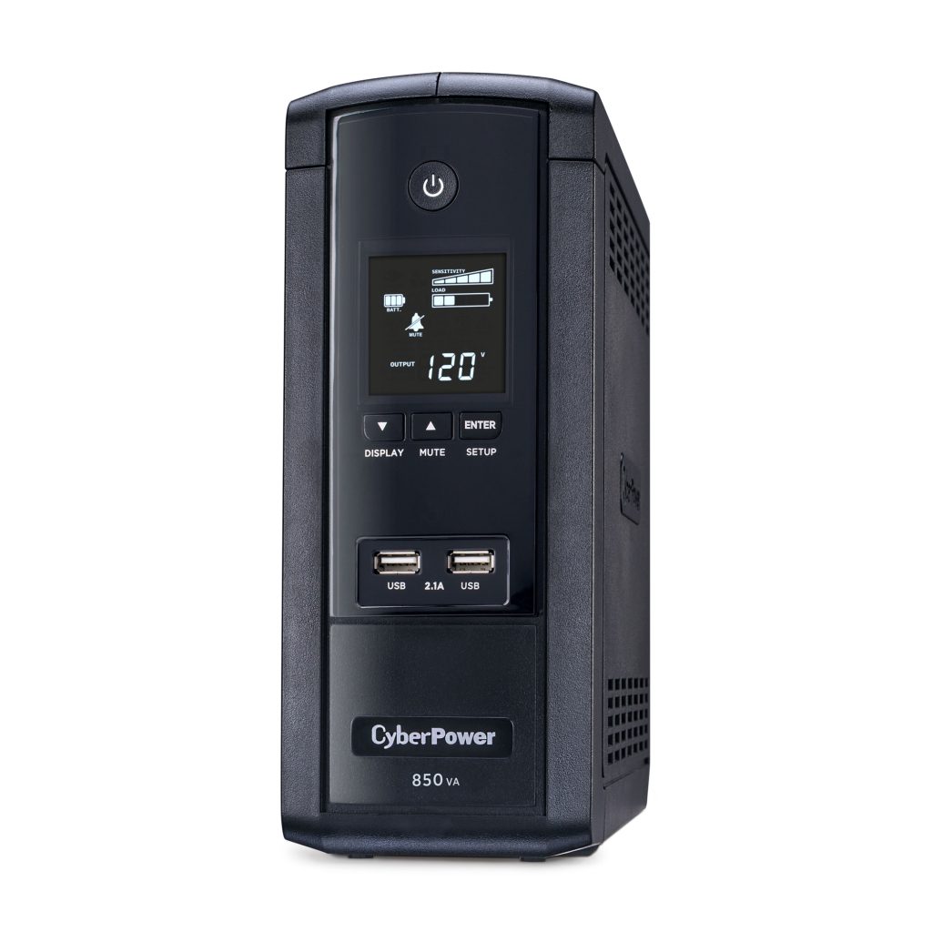 A mini-tower UPS with line interactive topology, the CyberPower Intelligent LCD Series BRG850AVRLCD provides battery backup (using simulated sine wave output) and surge protection for desktop computers, workstations, networking devices, and home entertainment systems.