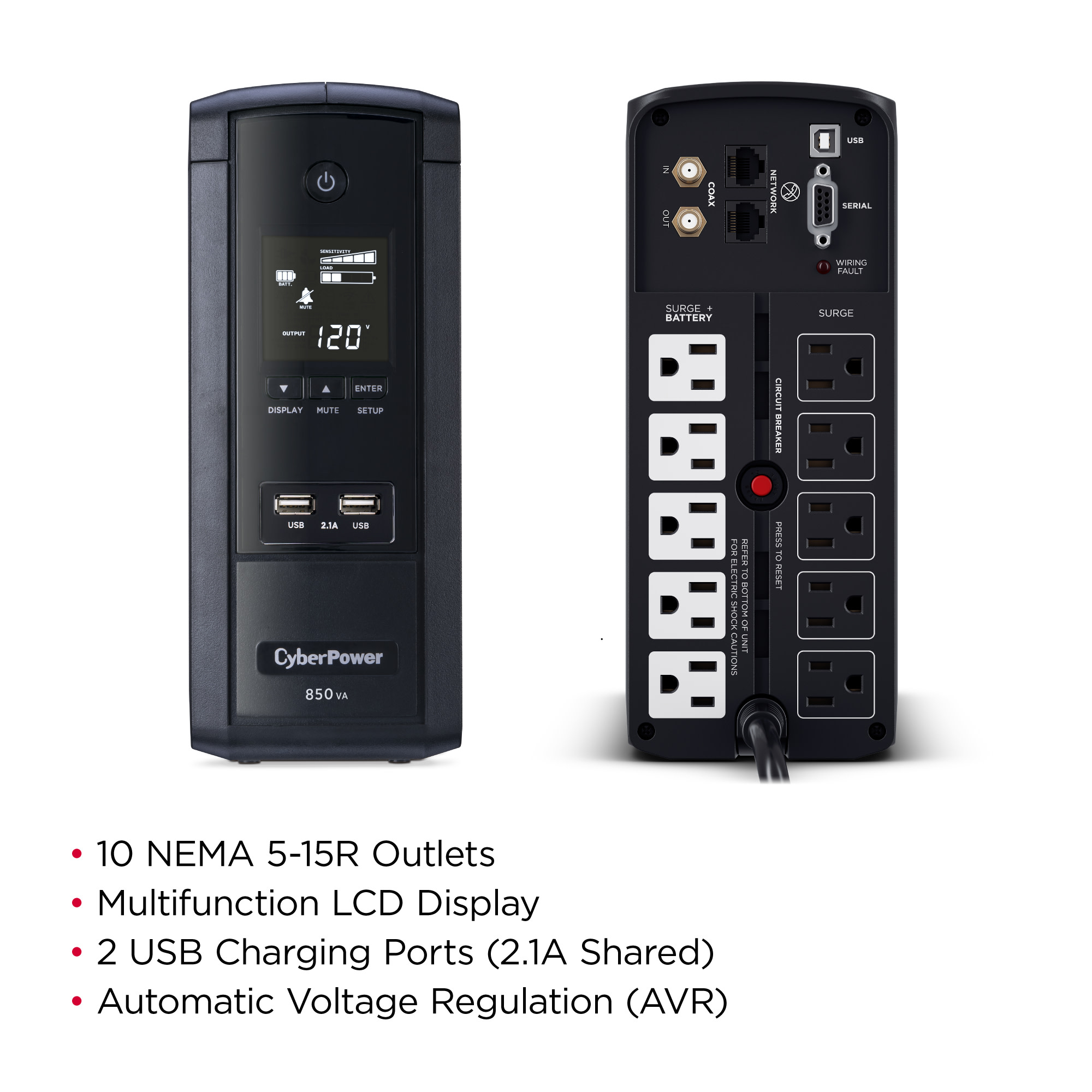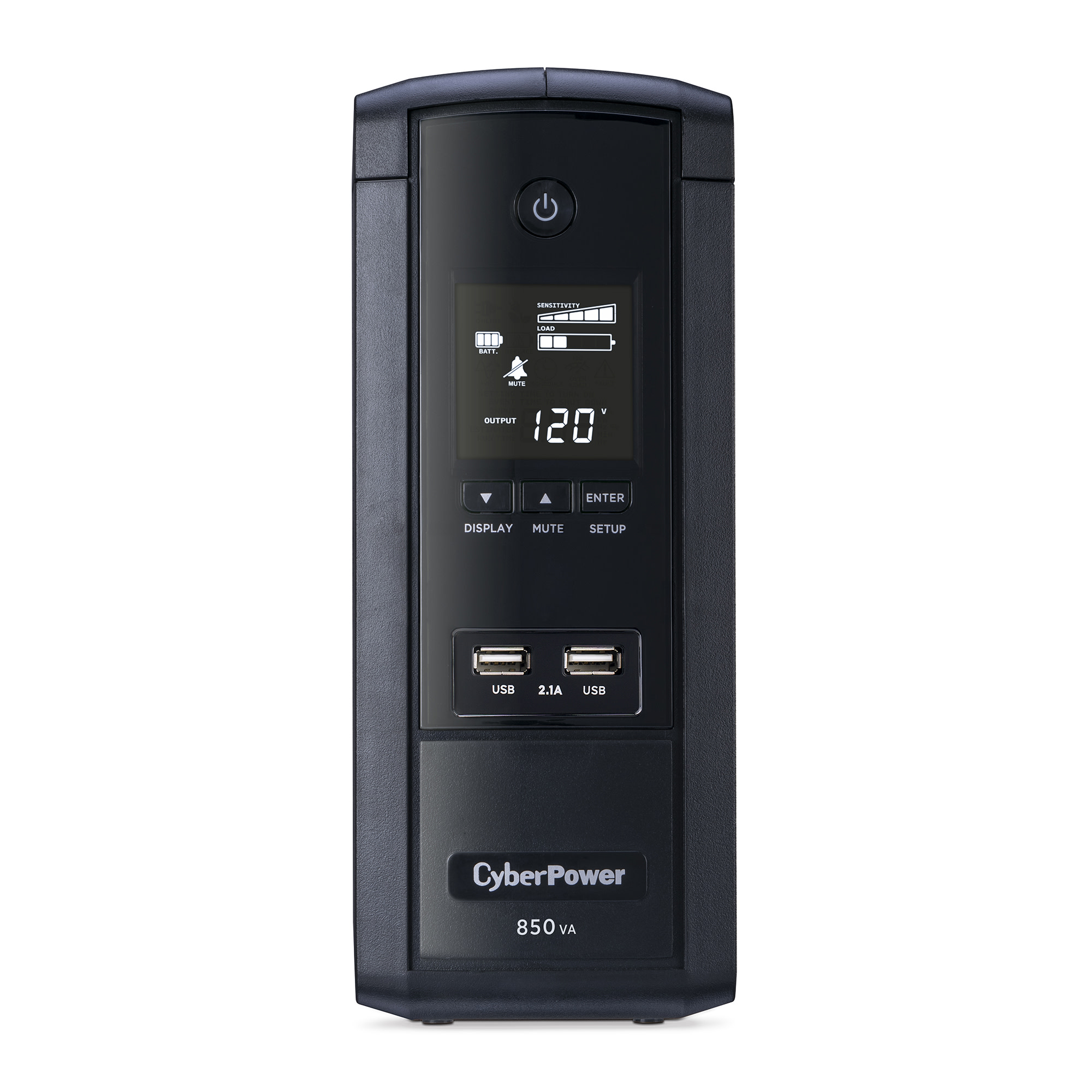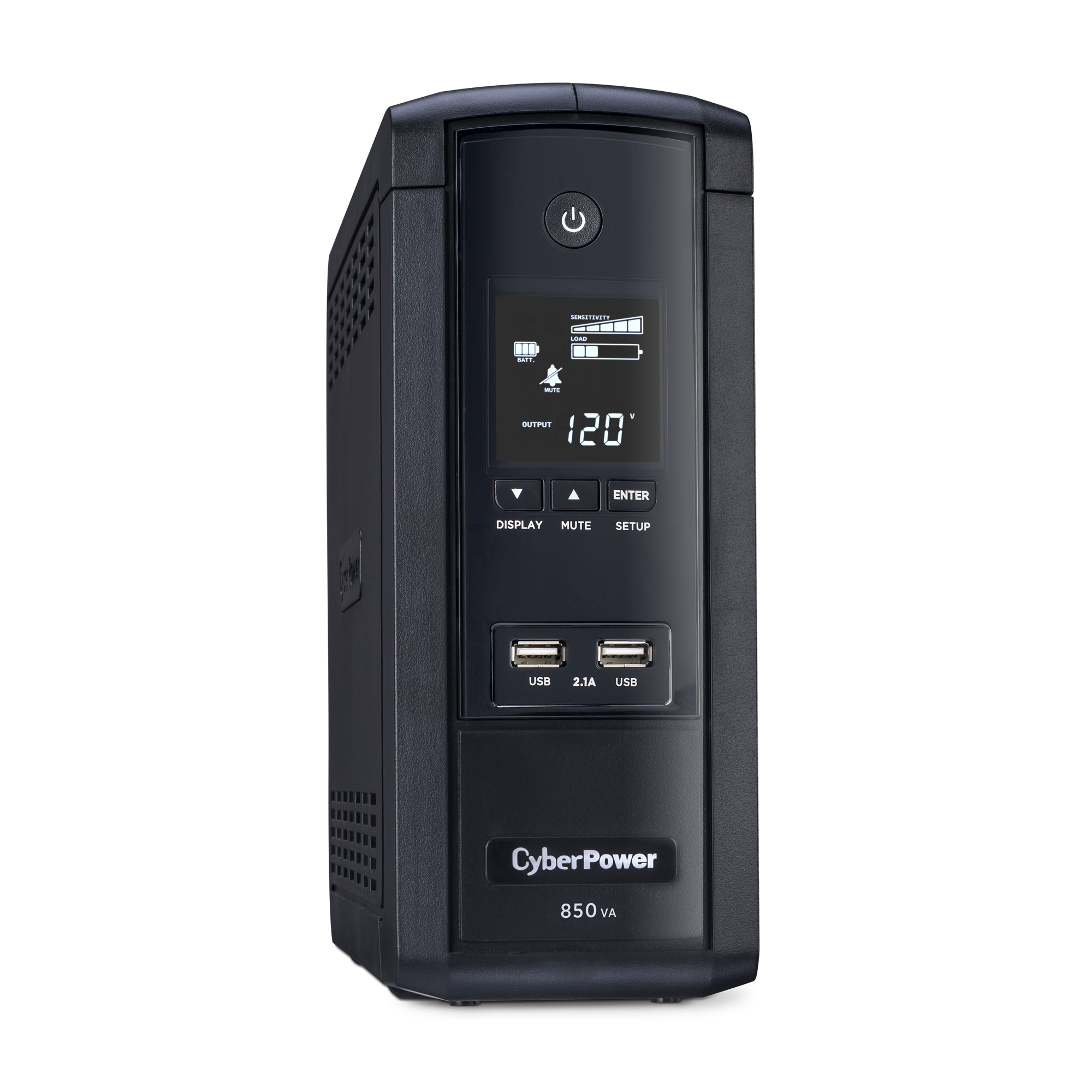 A mini-tower UPS with line interactive topology, the CyberPower Intelligent LCD Series BRG850AVRLCD provides battery backup (using simulated sine wave output) and surge protection for desktop computers, workstations, networking devices, and home entertainment systems.