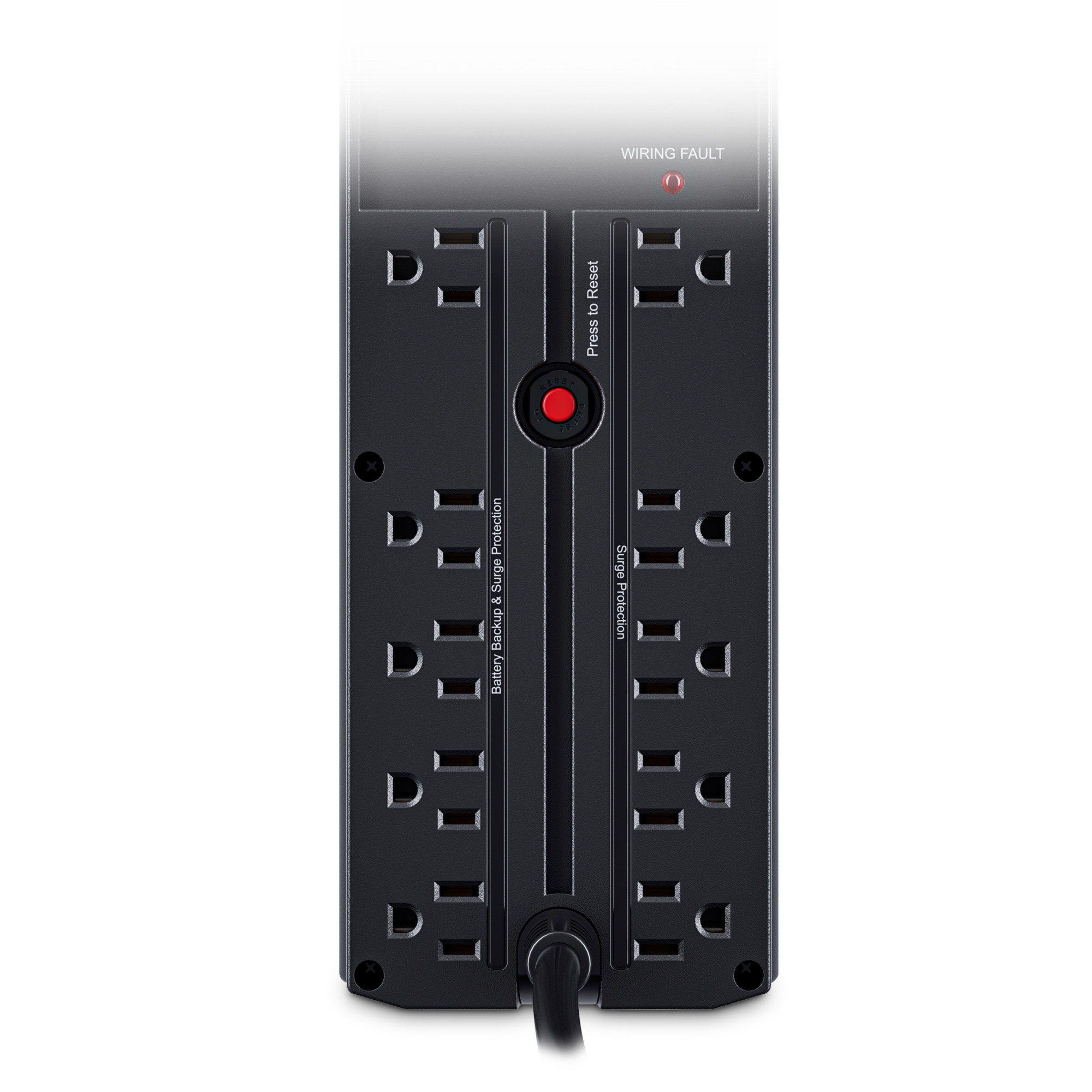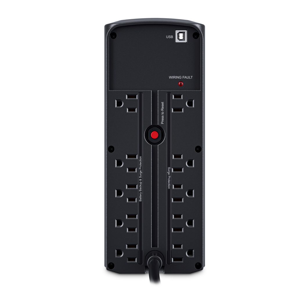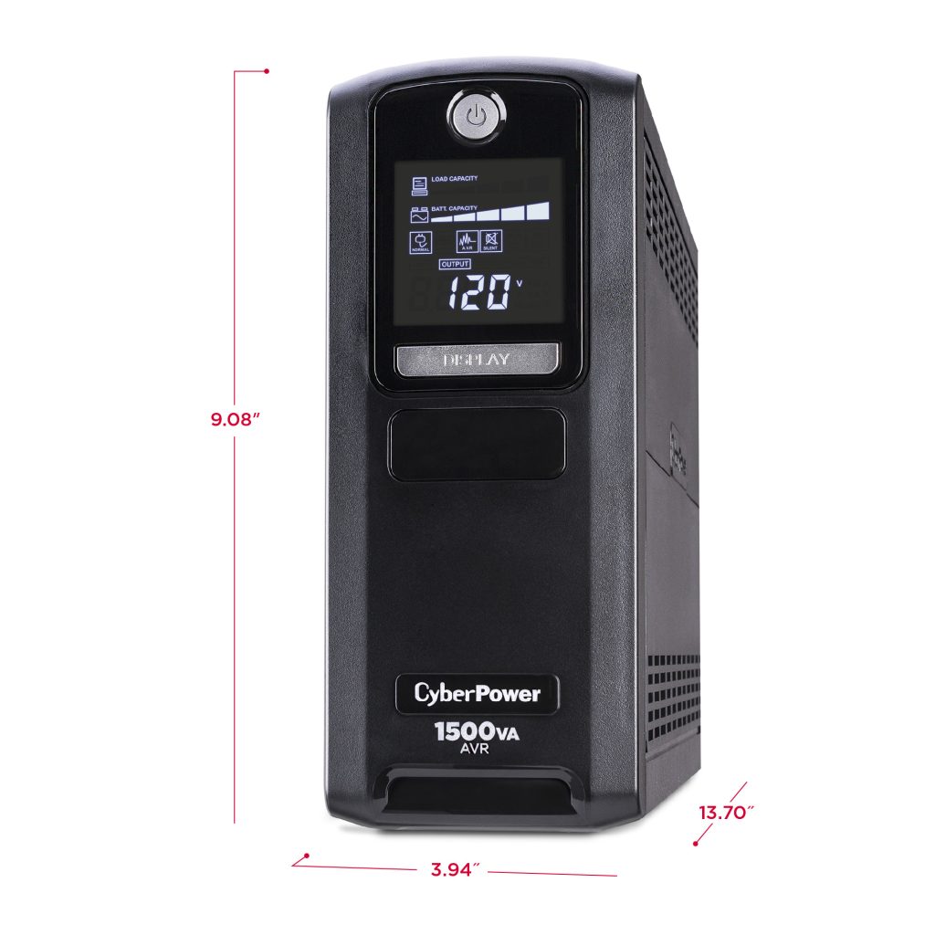 The CyberPower CP1500GAVR mini-tower UPS provides battery backup and surge protection for common home and office electronics. The CP1500GAVR is black and features an LCD control panel to quickly confirm operating status and alerts at-a-glance. Additional features include 10 grounded outlets (5 are surge protected only, 5 provide battery backup and surge protection), a 6 foot power cord, and it comes with a three-year limited warranty (including coverage of batteries) and a $500,000 Connected Equipment Guarantee.