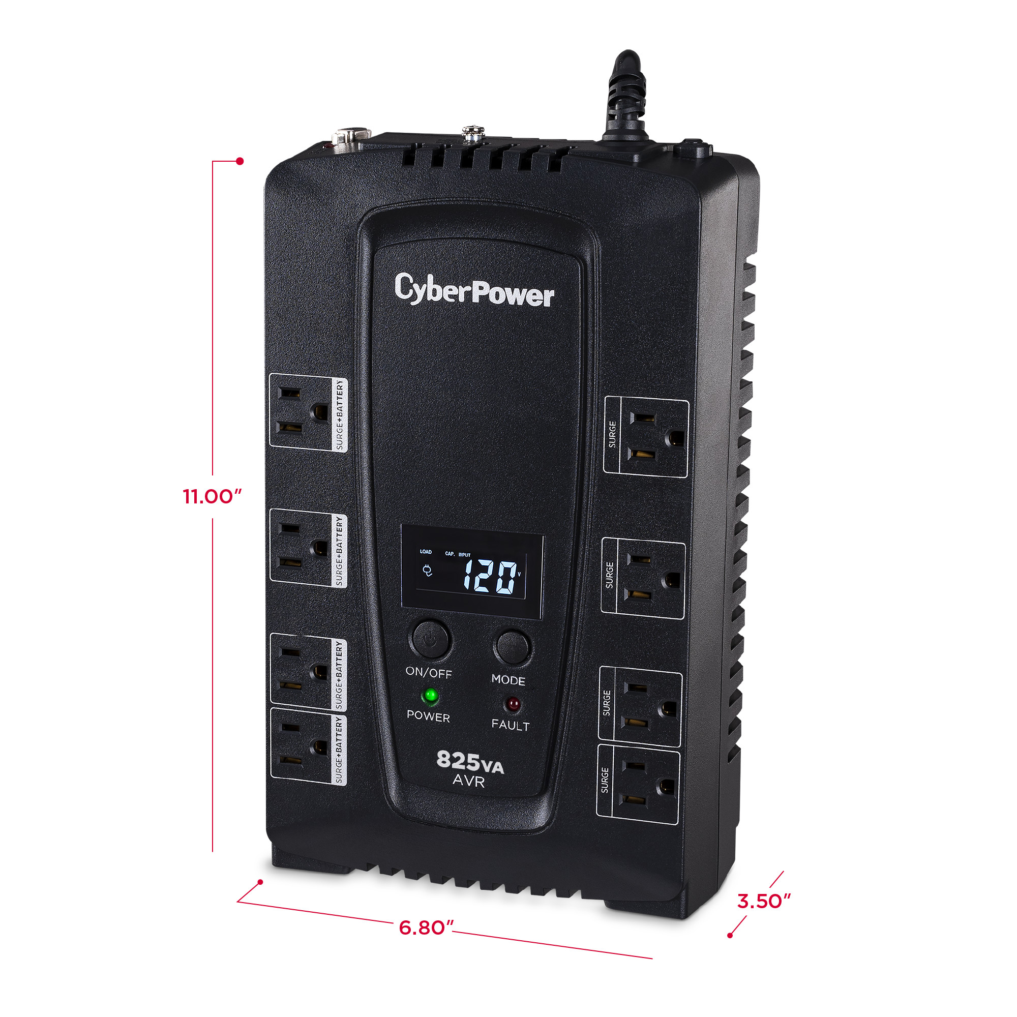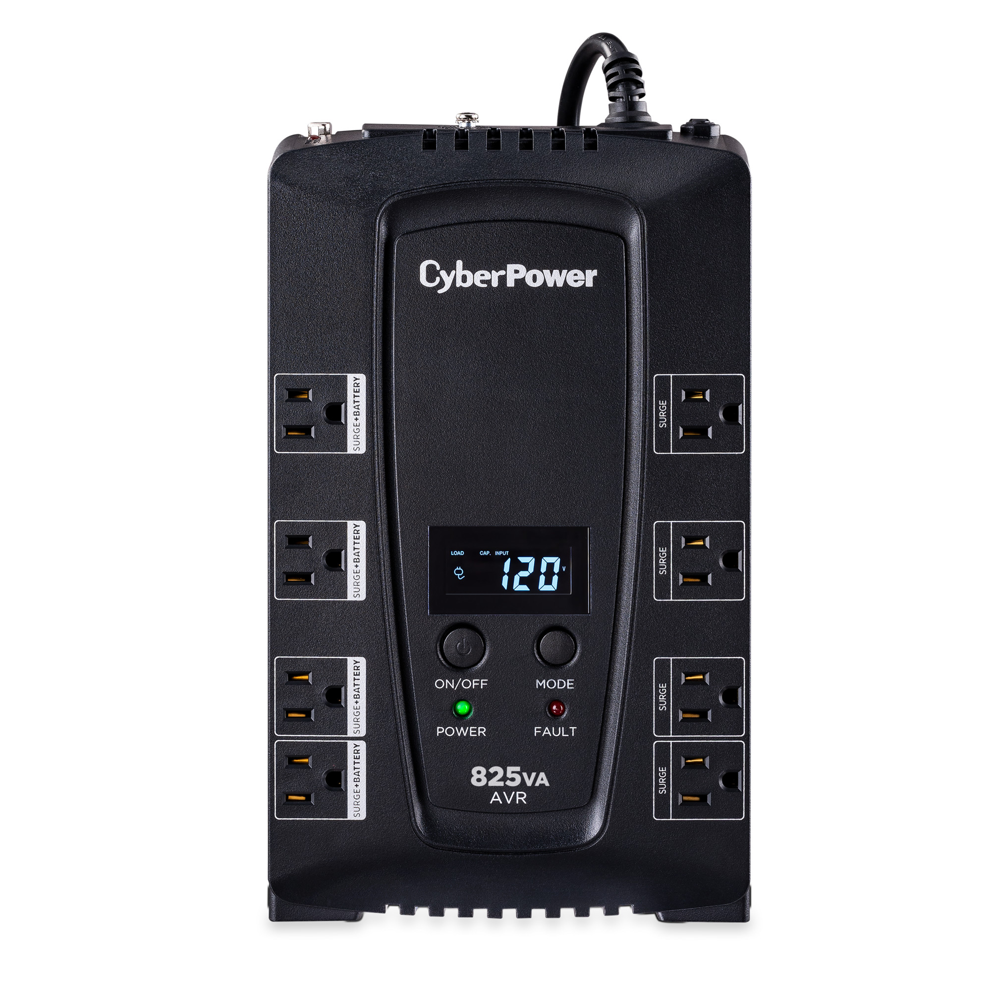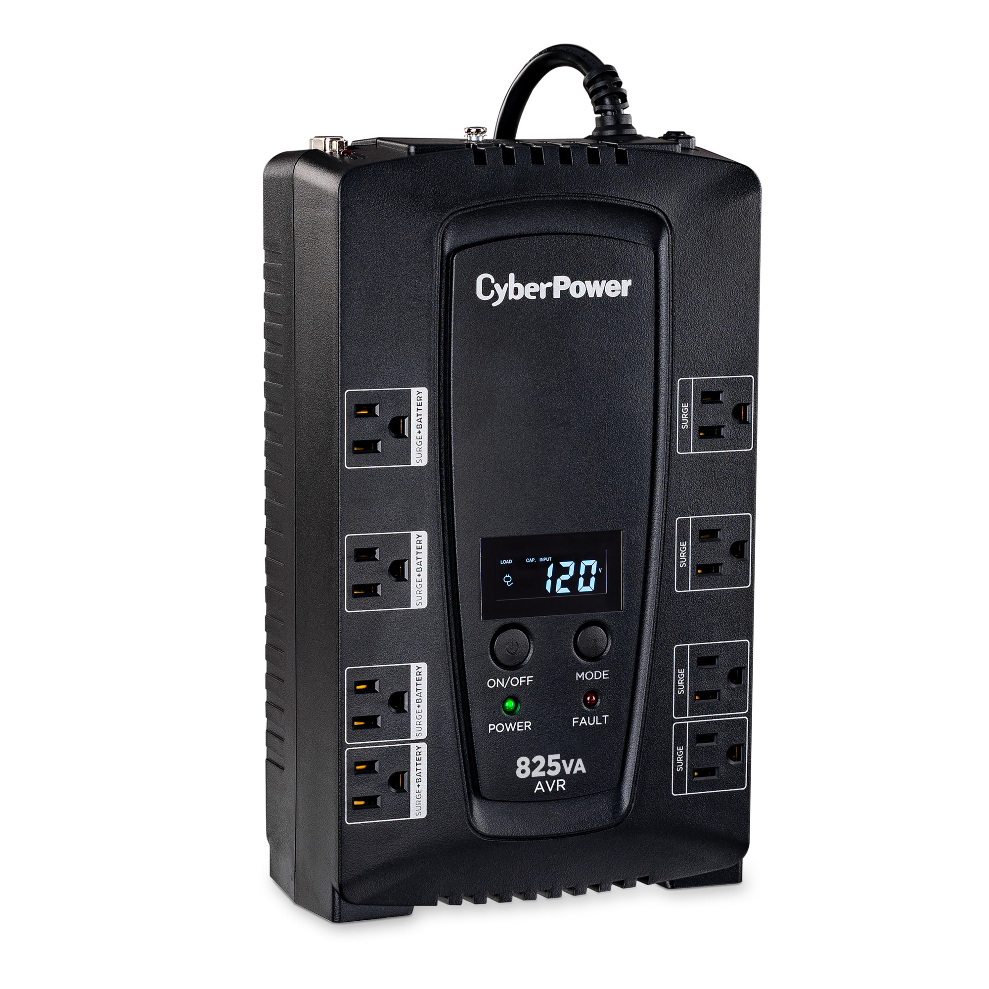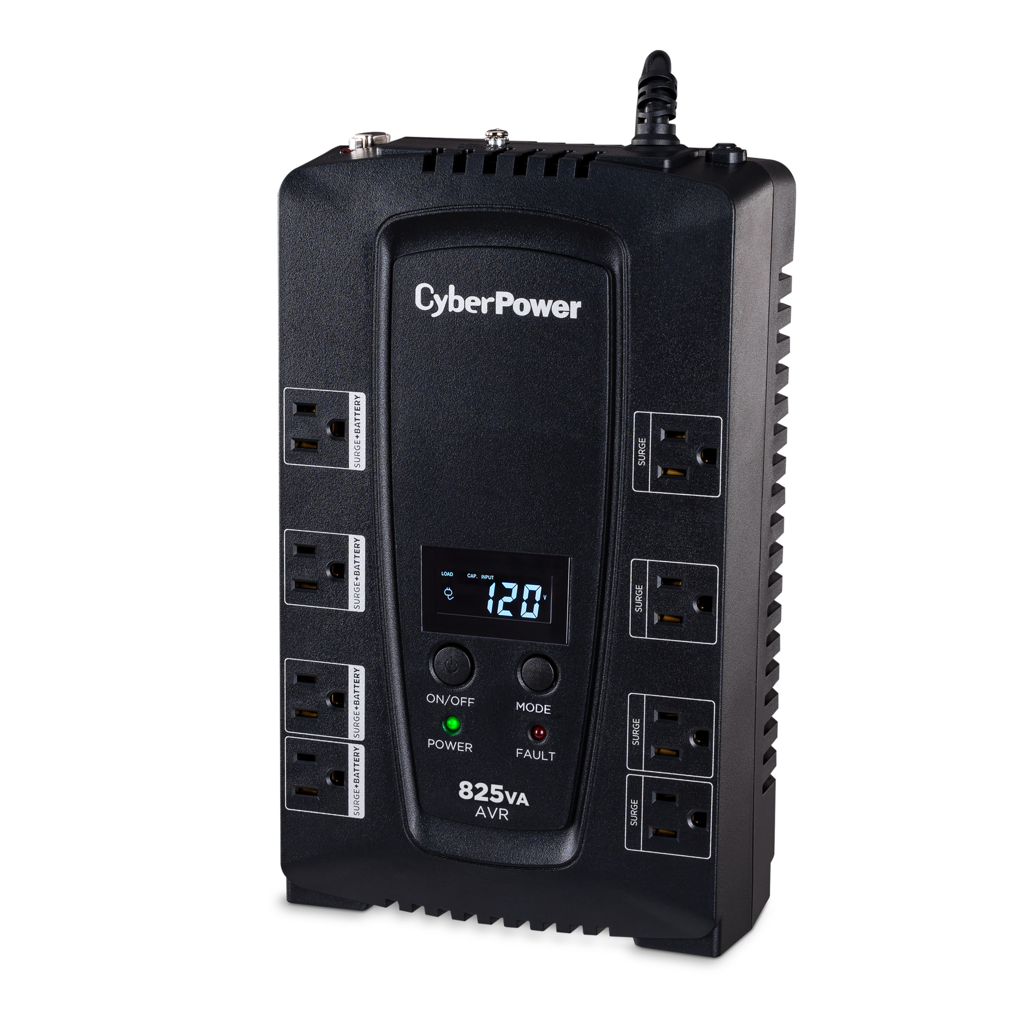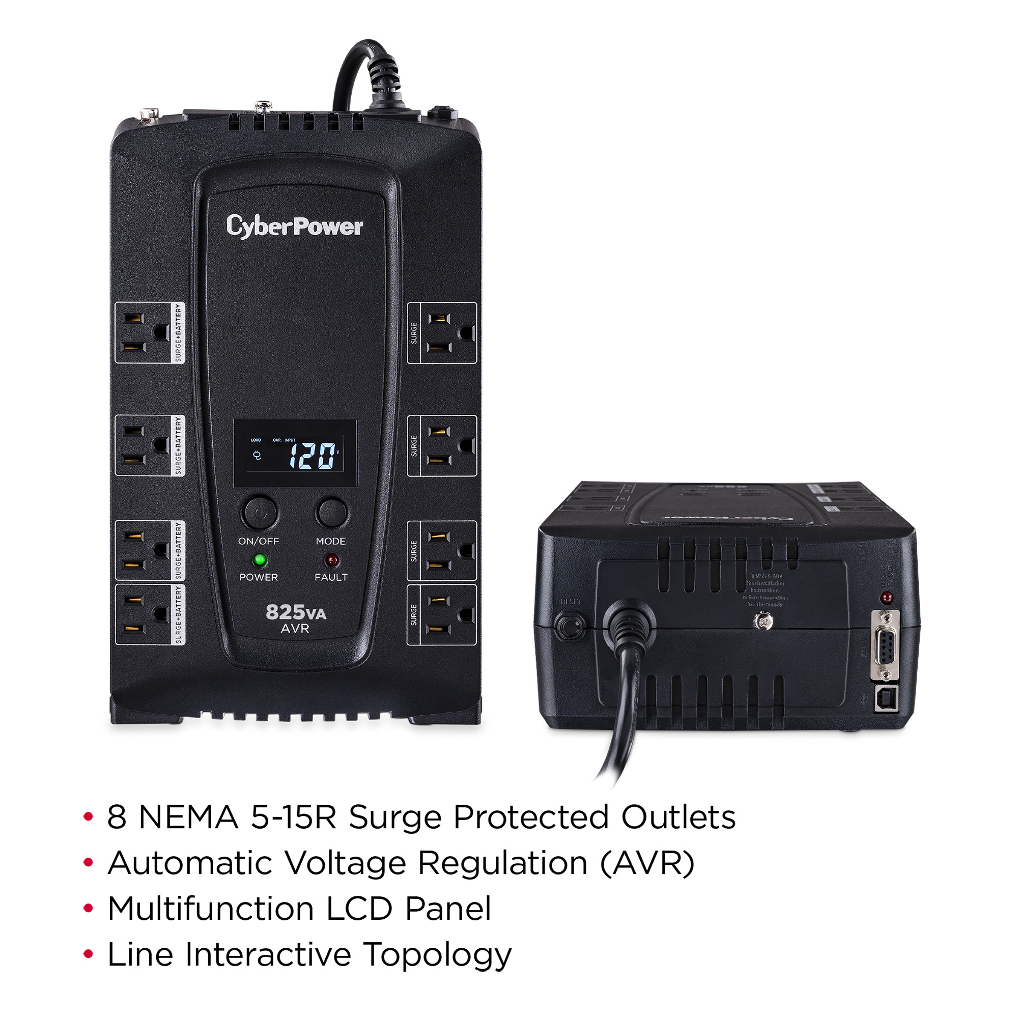 A compact UPS with line-interactive topology, the CyberPower Intelligent LCD CP825AVRLCD provides battery backup (using simulated sine wave output) and surge protection for desktop computers, workstations, networking devices, and home entertainment systems. The CP825AVRLCD uses Automatic Voltage Regulation (AVR) to correct minor power fluctuations without switching to battery power, which extends battery life. AVR is essential in areas where power fluctuations occur frequently. Features include a multifunction LCD panel to provide visibility into power conditions and UPS vitals. The CP825AVRLCD comes with a three-year warranty (including coverage of batteries) and a $200,000 Connected Equipment Guarantee.