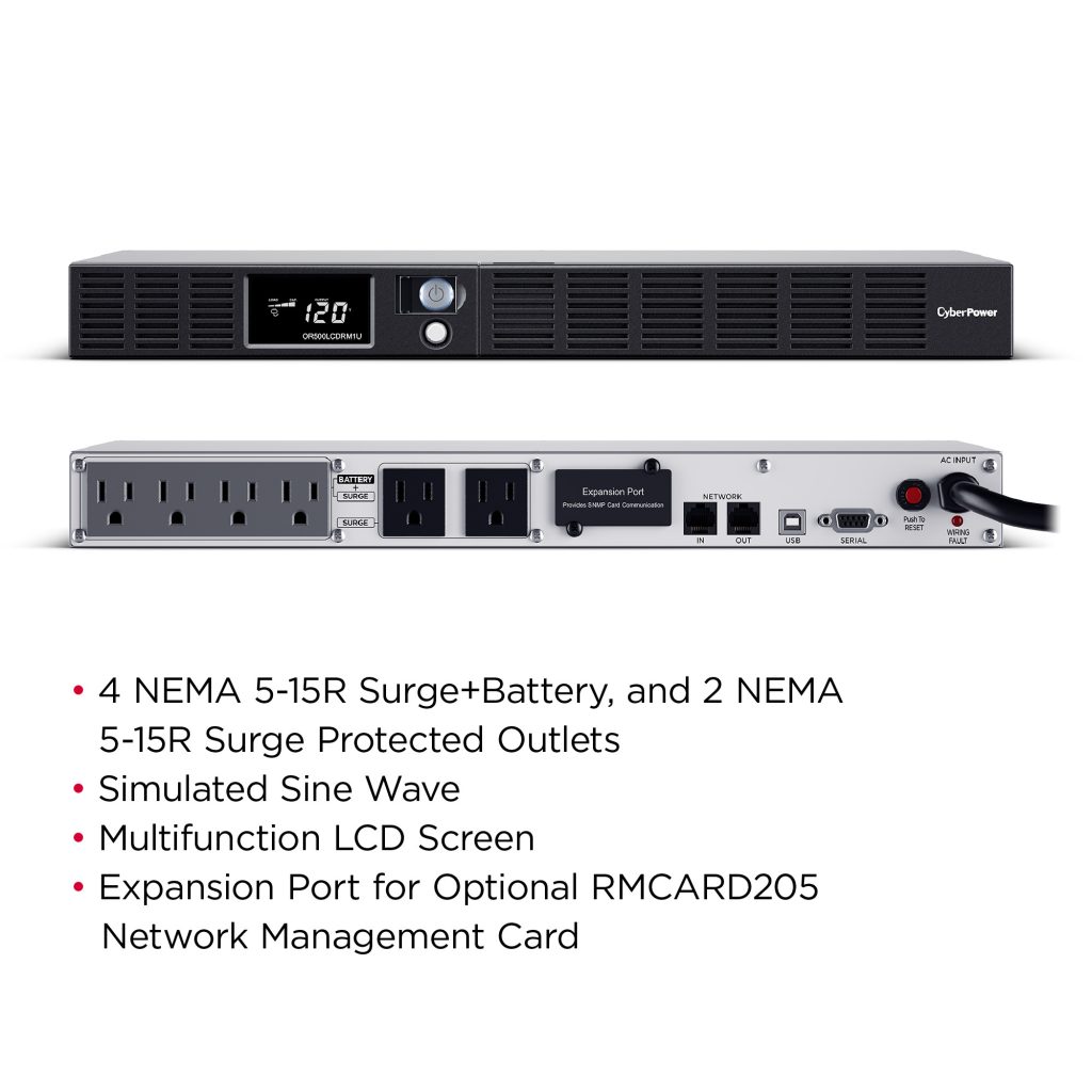 A rackmount UPS with line interactive topology, the CyberPower Smart App LCD OR500LCDRM1U provides battery backup (using simulated sine wave output) and surge protection for department servers, workgroup servers, workstations, network devices, and telecom installations without active PFC power supplies. The OR500LCDRM1U uses Automatic Voltage Regulation (AVR) to correct minor power fluctuations without switching to battery power, which extends battery life. AVR is essential in areas where power fluctuations occur frequently. The OR500LCDRM1U comes with a three-year warranty and a $300,000 Connected Equipment Guarantee.