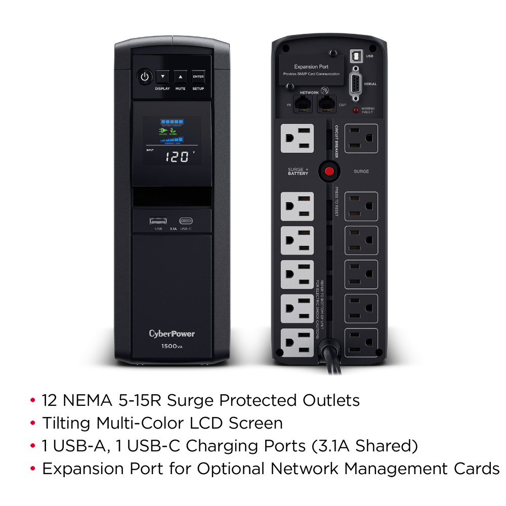 The CP1500PFCLCD features an advanced multifunction control panel with a color LCD to quickly confirm status and alerts at-a-glance. The screen tilts for easy viewing when the UPS is placed in a low position such as under a desk. Two USB charge ports (one Type-A and one Type-C) power portable devices such as mobile phones and tablets, even during a utility power failure.