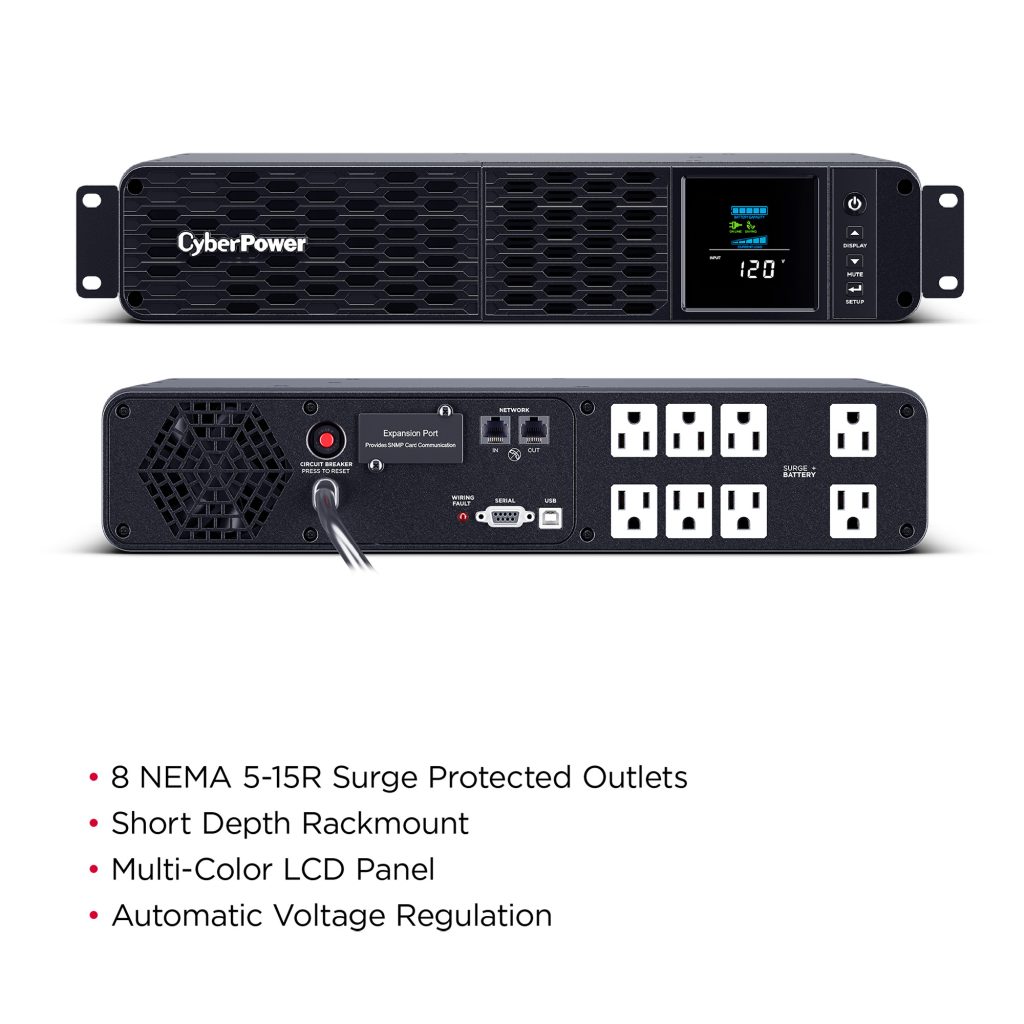 The CP1500PFCRM2U features Automatic Voltage Regulation (AVR), which corrects minor power fluctuations without switching to battery power, and a multifunction control panel with a color LCD to quickly confirm status and alerts at-a-glance. Remote management and/or monitoring is available with optional purchase of a Remote Network Management Card or Cloud Monitoring Card. At only 10.5 inches in depth, the CP1500PFCRM2U fits comfortably in short-depth rack installations where space is at a premium.