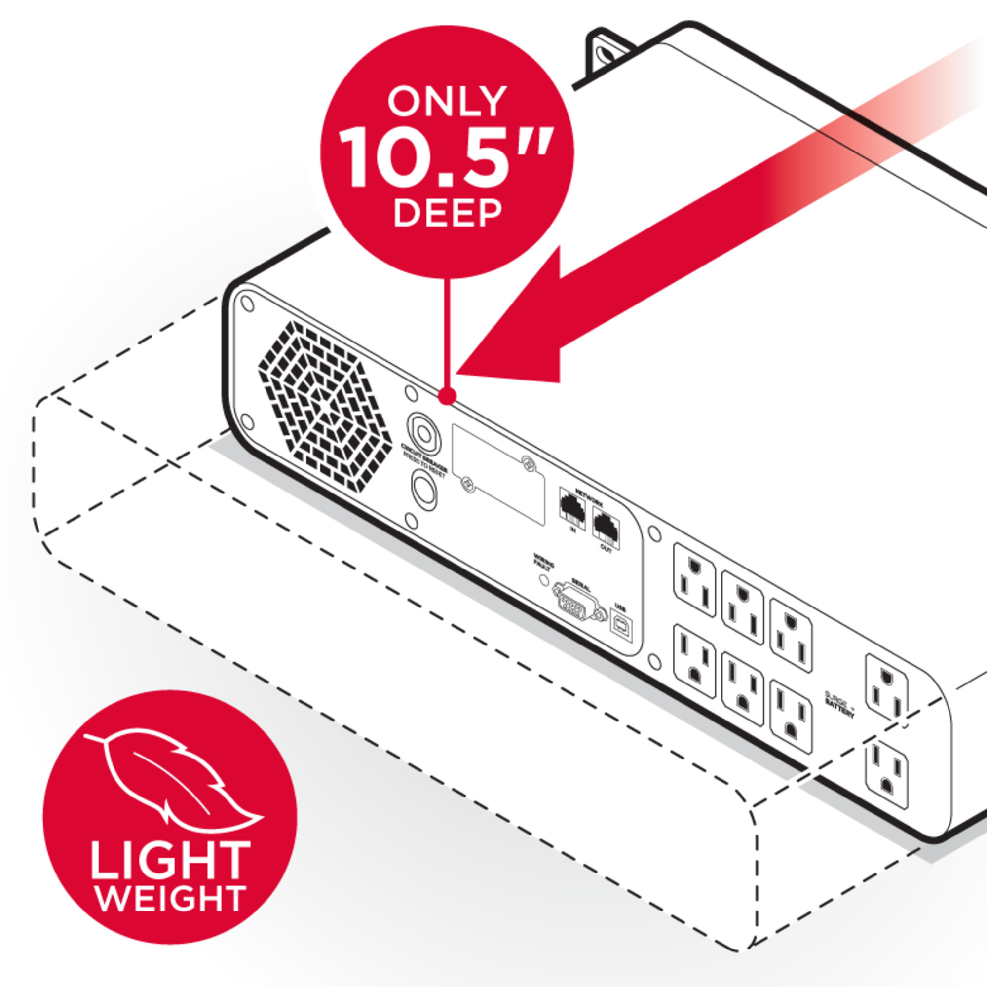 Accomodates transformer-sized plugs without blocking other outlets. - Line Interactive Topology