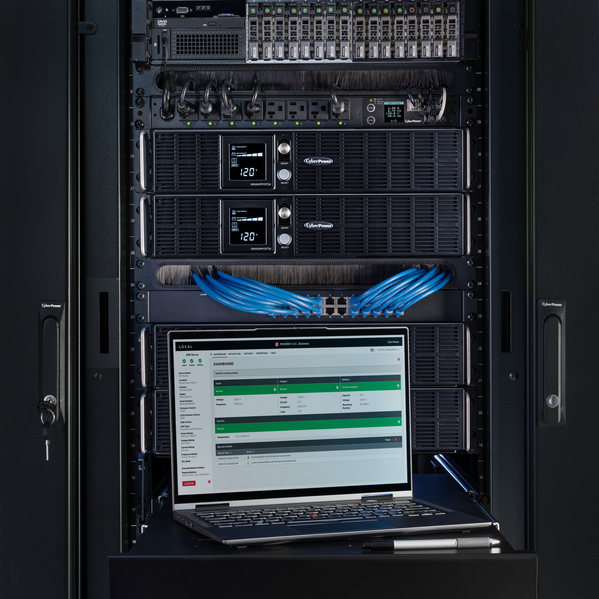 Displays immediate, detailed information on the UPS battery and power conditions, alerting users to potential problems before they can affect critical equipment and cause downtime. The rotatable panel is easily readable whether the UPS is rack mounted or standing as a tower.