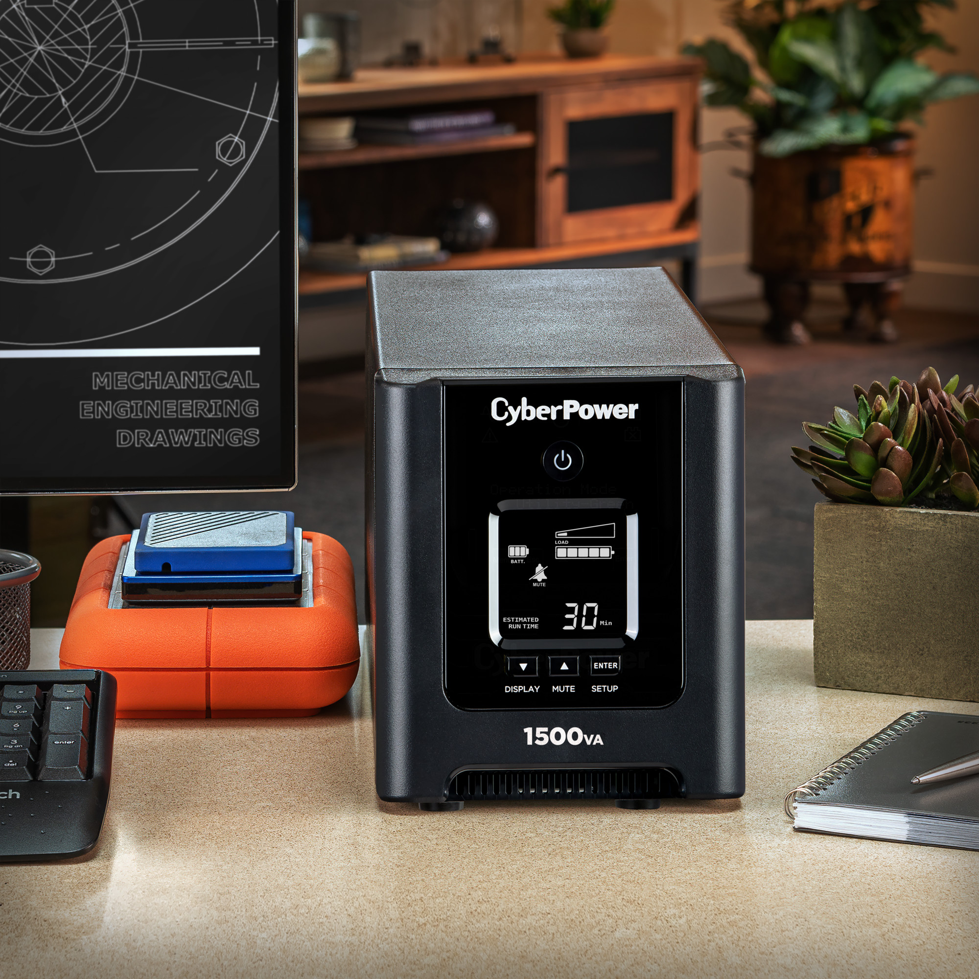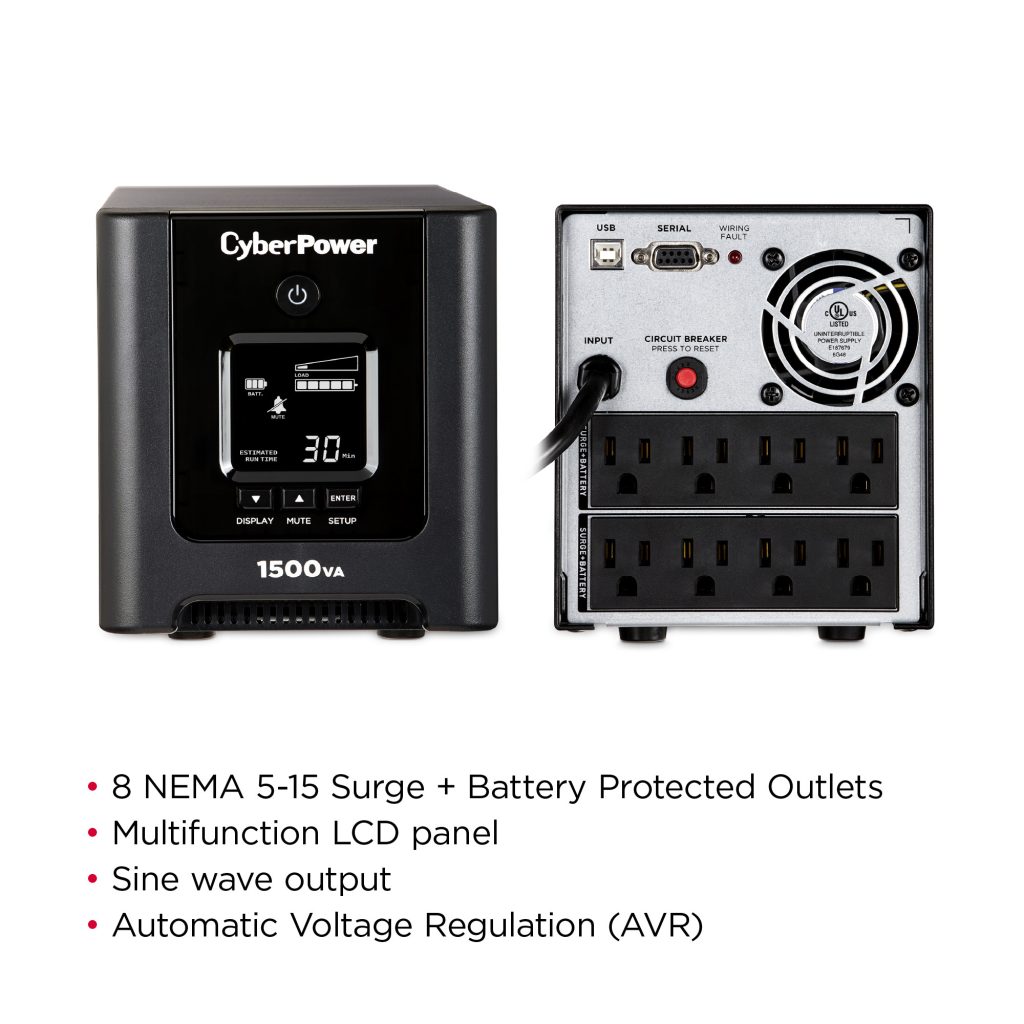 A mini-tower UPS with line interactive topology, the CyberPower PFC Sinewave OR1500PFCLCD provides power protection (using sine wave output) and surge protection for department servers, workgroup servers, network devices, telecom appliances, and high-end audio/video equipment requiring PFC power source compatibility. The OR1500PFCLCD uses Automatic Voltage Regulation (AVR) to correct minor power fluctuations without switching to battery power, which extends battery life. AVR is essential in areas where power fluctuations occur frequently. The OR1500PFCLCD comes with a three-year warranty and a $200,000 Connected Equipment Guarantee.