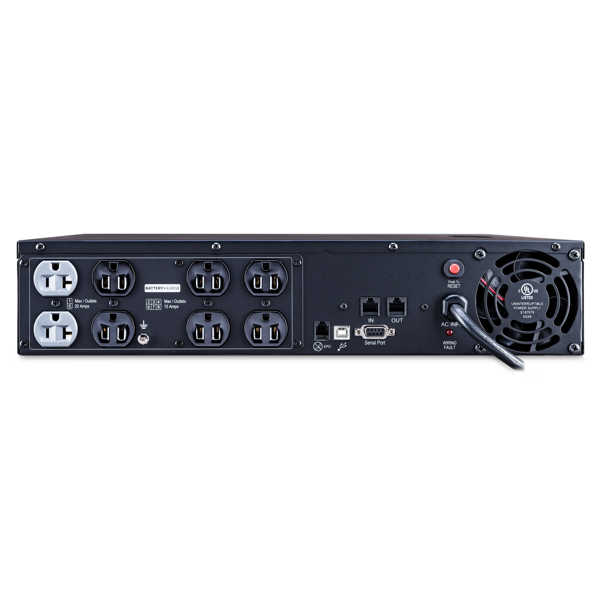 • Outlet types: 2 × NEMA 5-20R, 6 × NEMA 5-15R