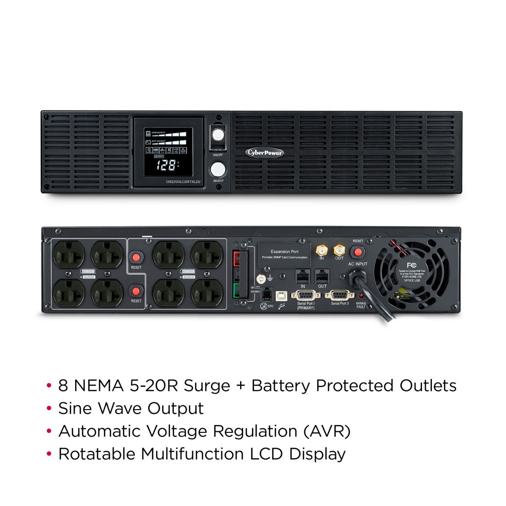 A rack/tower UPS with line interactive topology, the CyberPower PFC Sinewave OR2200PFCRT2U provides power protection (using sine wave output) and surge protection for department servers, workgroup servers, network devices, telecom appliances, and high-end audio/video equipment requiring active PFC power source compatibility. The OR2200PFCRT2U uses Automatic Voltage Regulation (AVR) to correct minor power fluctuations without switching to battery power, which extends battery life. AVR is essential in areas where power fluctuations occur frequently. The OR2200PFCRT2U comes with a three-year warranty and a $300,000 Connected Equipment Guarantee.