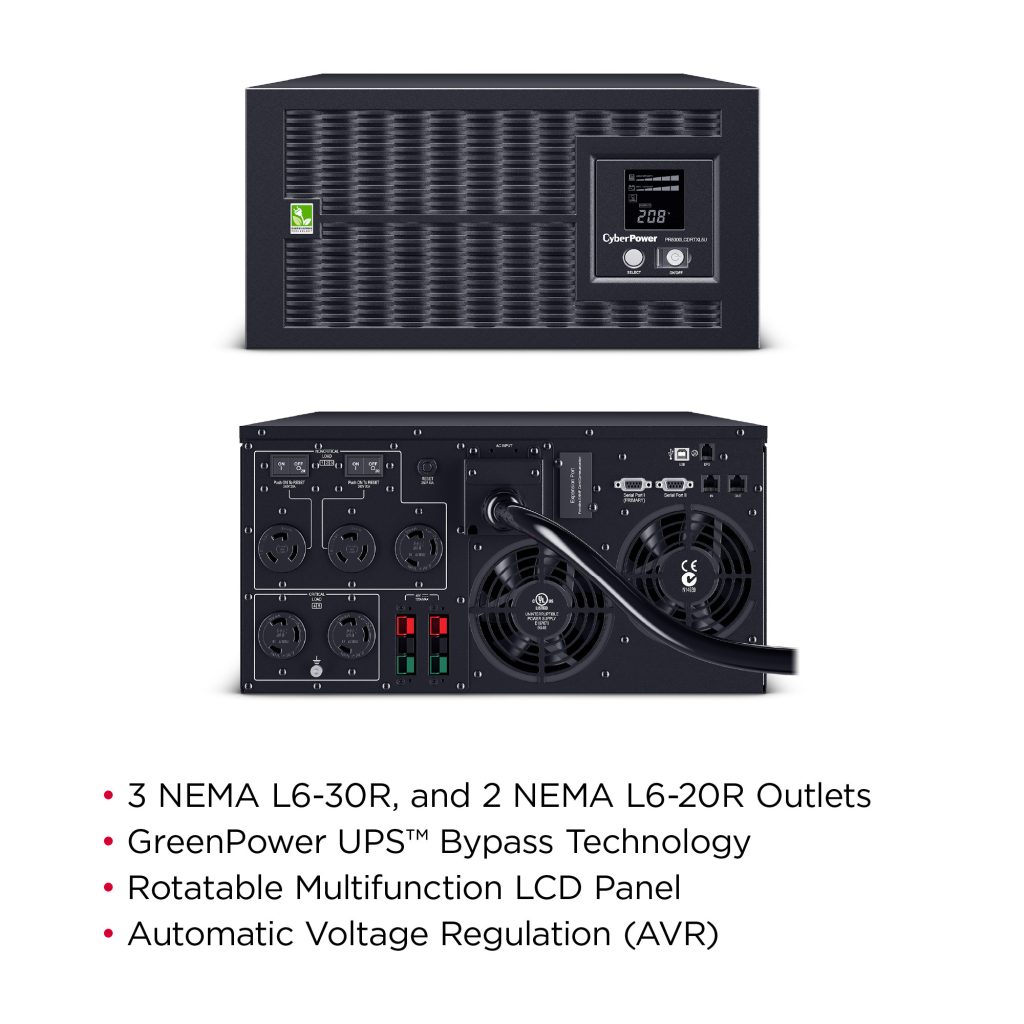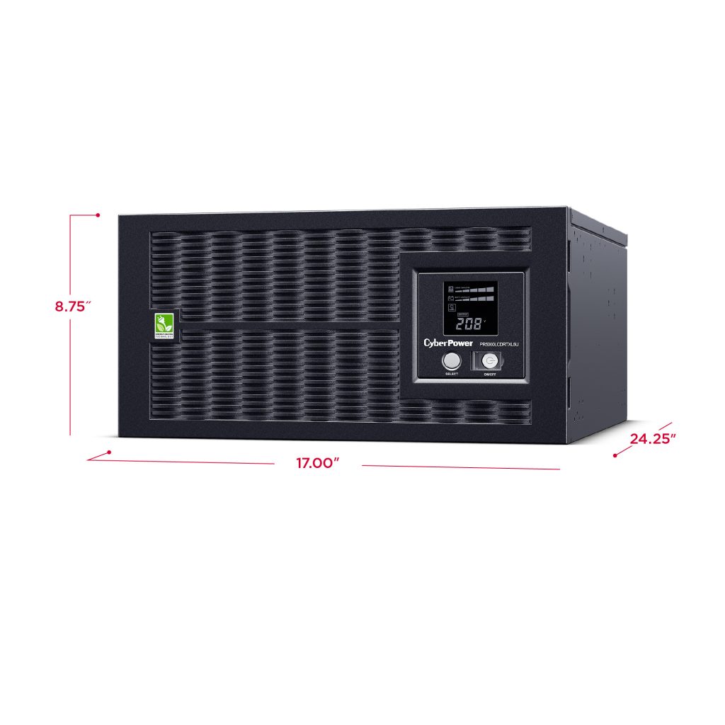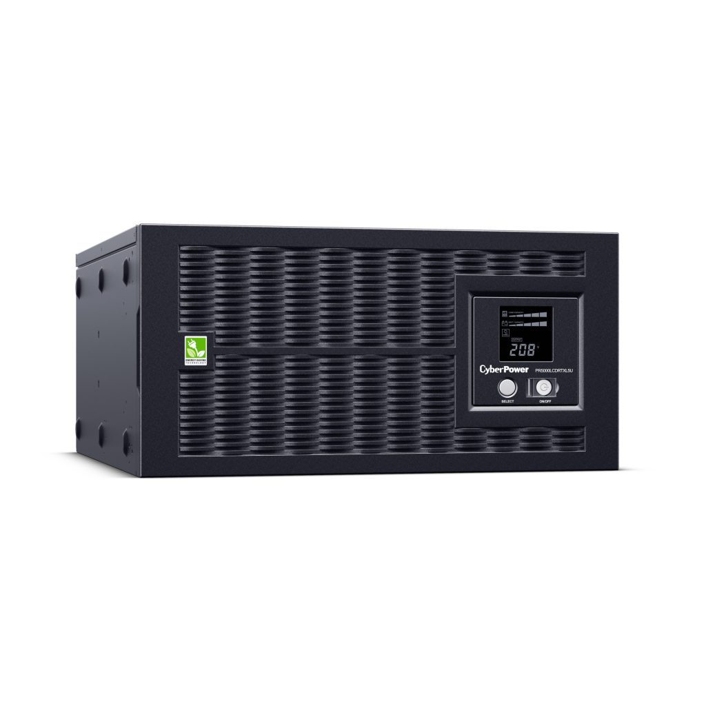 A rack/tower convertible UPS with line interactive topology, the CyberPower Smart App Sinewave PR5000LCDRTXL5U provides battery backup, power protection (using sine wave output), and surge protection for corporate servers, department servers, storage appliances, network devices, and telecom installations requiring Active PFC power source compatibility. The PR5000LCDRTXL5U uses Automatic Voltage Regulation (AVR) to correct minor power fluctuations without switching to battery power, which extends battery life. AVR is essential in areas where power fluctuations occur frequently. The PR5000LCDRTXL5U comes with a three-year warranty (including coverage of batteries) and a $300,000 Connected Equipment Guarantee.