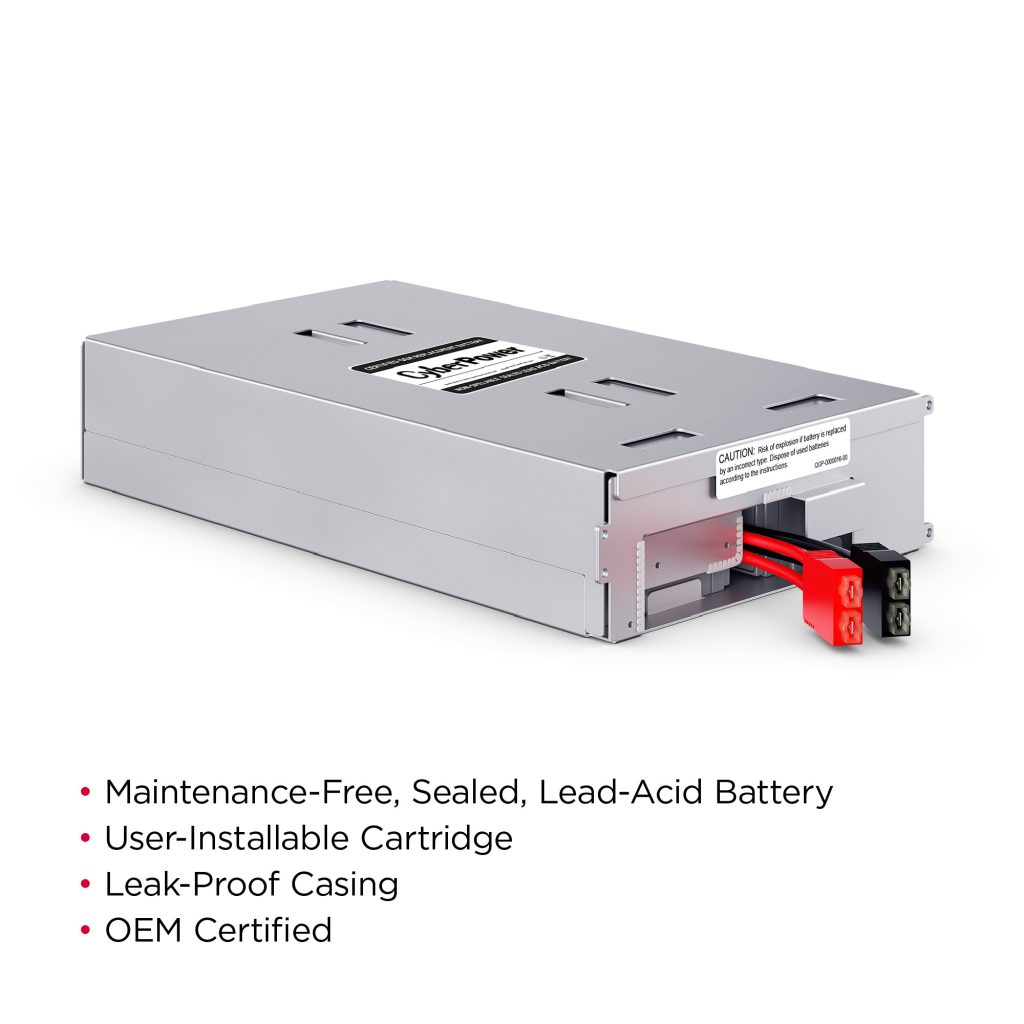 The RB1270X4C UPS Replacement Battery Cartridge restores life to CyberPower UPS systems that have weak or completely depleted internal batteries. The RB1270X4C contains four 12V/7AH replacement batteries, certified to meet or exceed original manufacturer specifications. These leak-proof, sealed lead-acid batteries never require replacement fluid. The pre-assembled cartridge installs easily in your CyberPower UPS system and is shipped with reusable packaging which can be used for delivering expired batteries to a suitable recycling center. The RB1270X4C comes with instructions, recycling information, and an eighteen-month warranty.