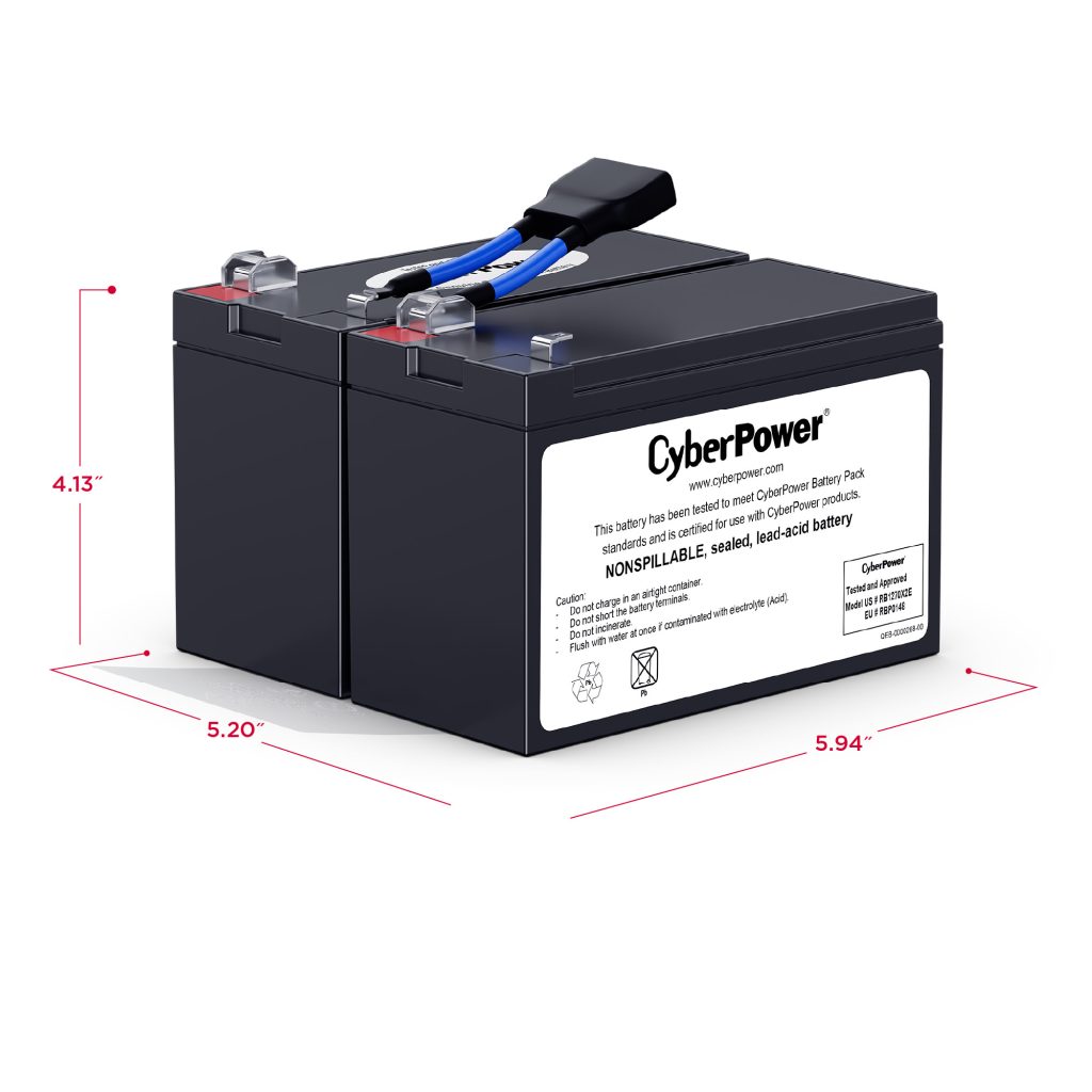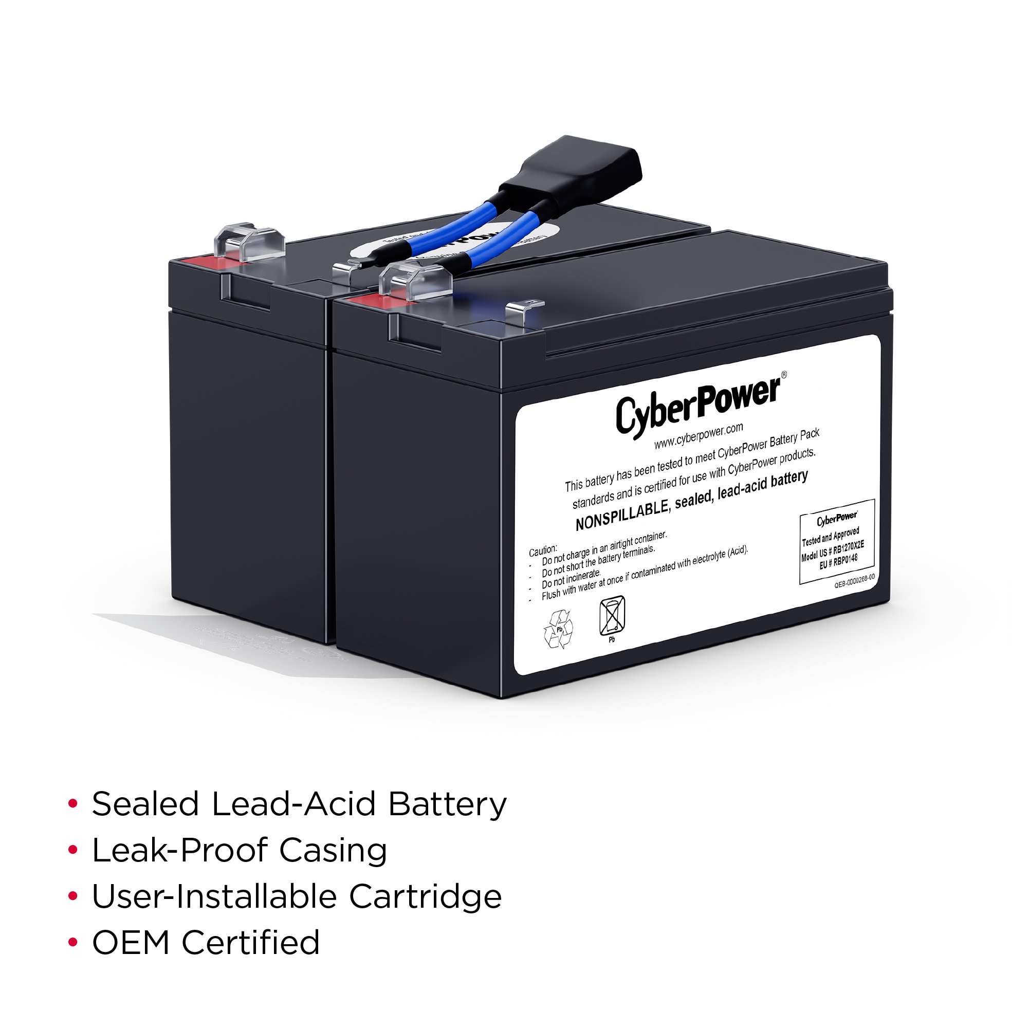The RB1270X2E UPS Replacement Battery Cartridge restores life to CyberPower UPS systems that have weak or completely depleted internal batteries. The RB1270X2E contains two 12V/7Ah batteries, certified to meet or exceed original manufacturer specifications. This leak-proof, sealed lead-acid battery never requires replacement fluid. The pre-assembled cartridge installs easily into your CyberPower UPS system and is shipped with reusable packaging for delivering expired batteries to a suitable recycling center. The RB1270X2E comes with instructions, recycling information, and an eighteen-month warranty.