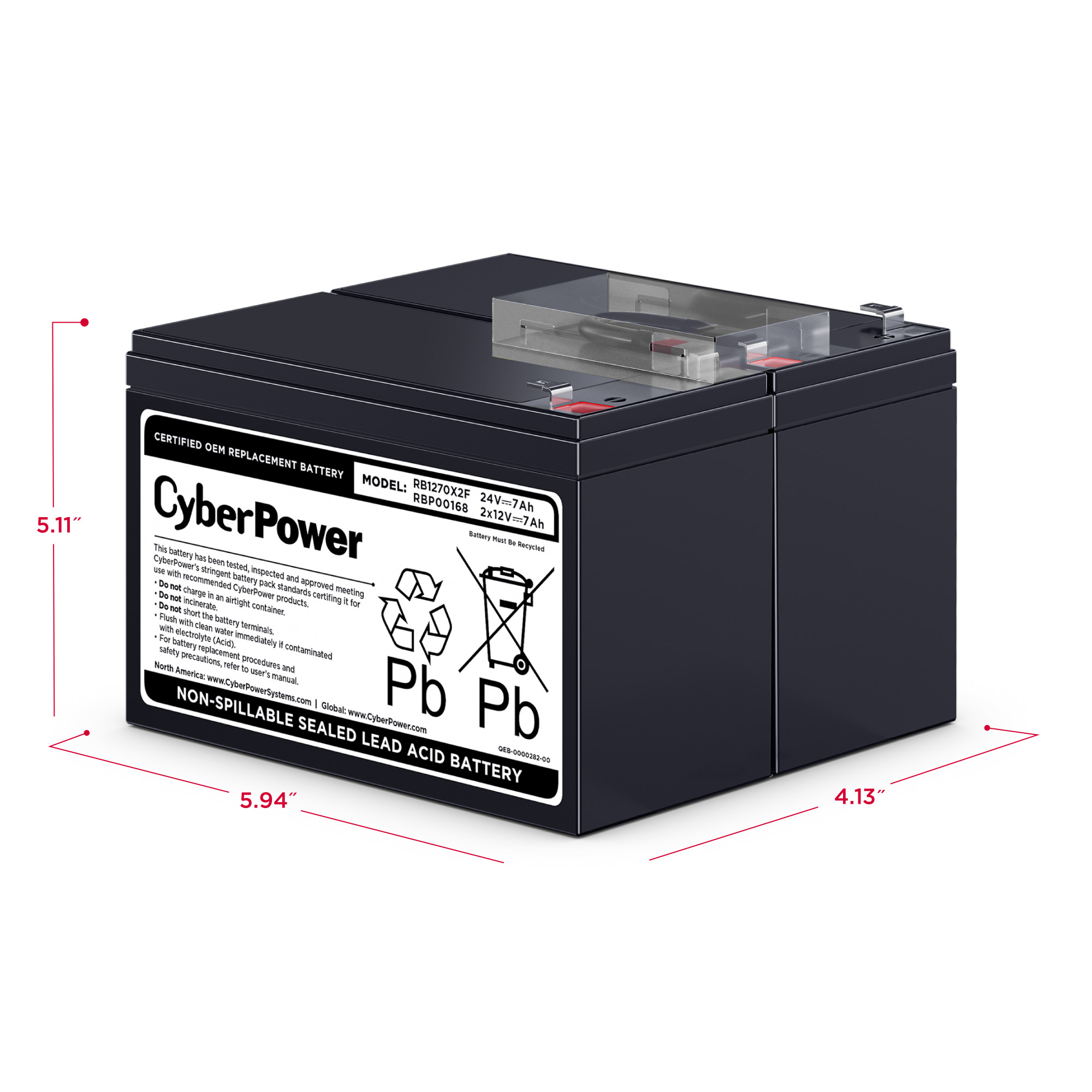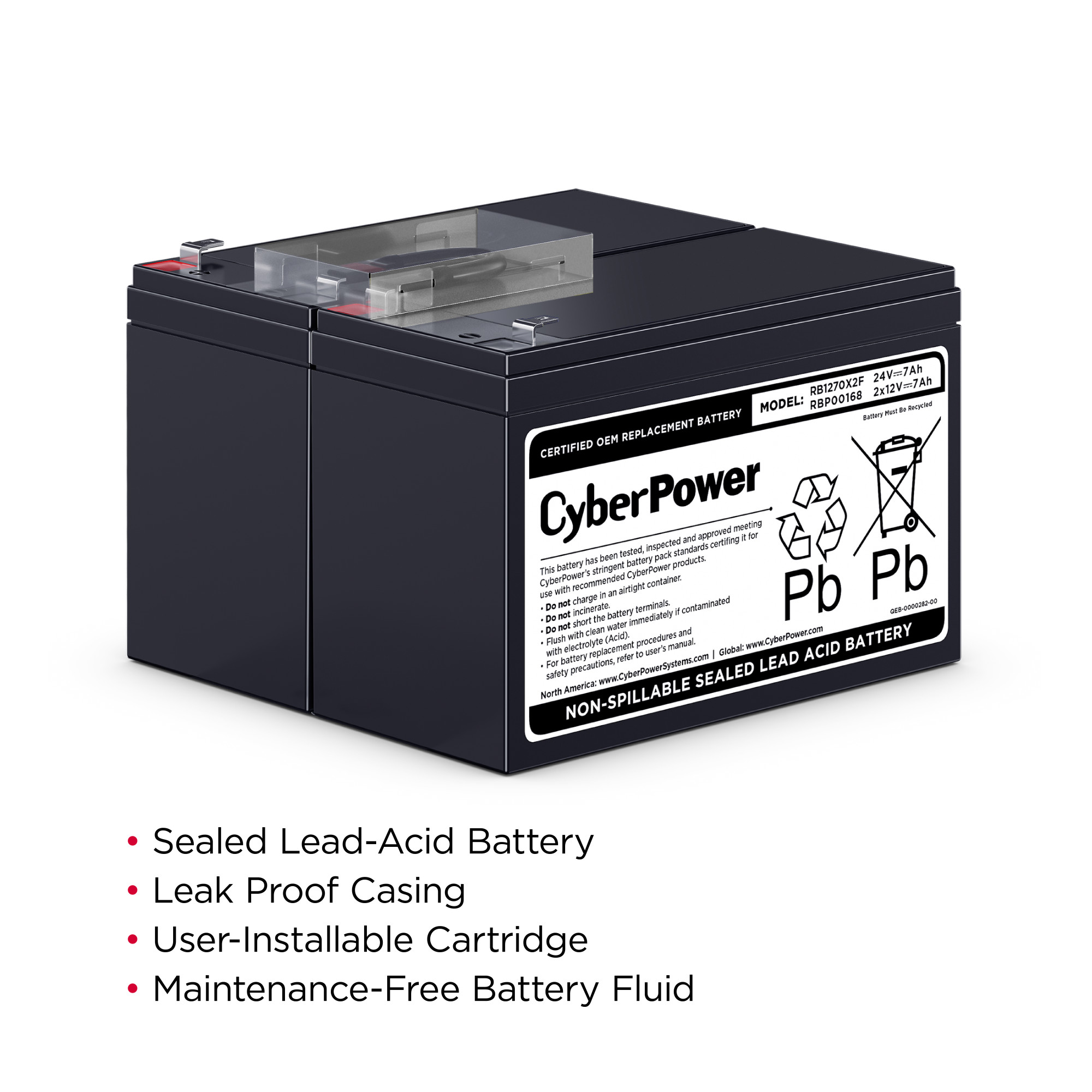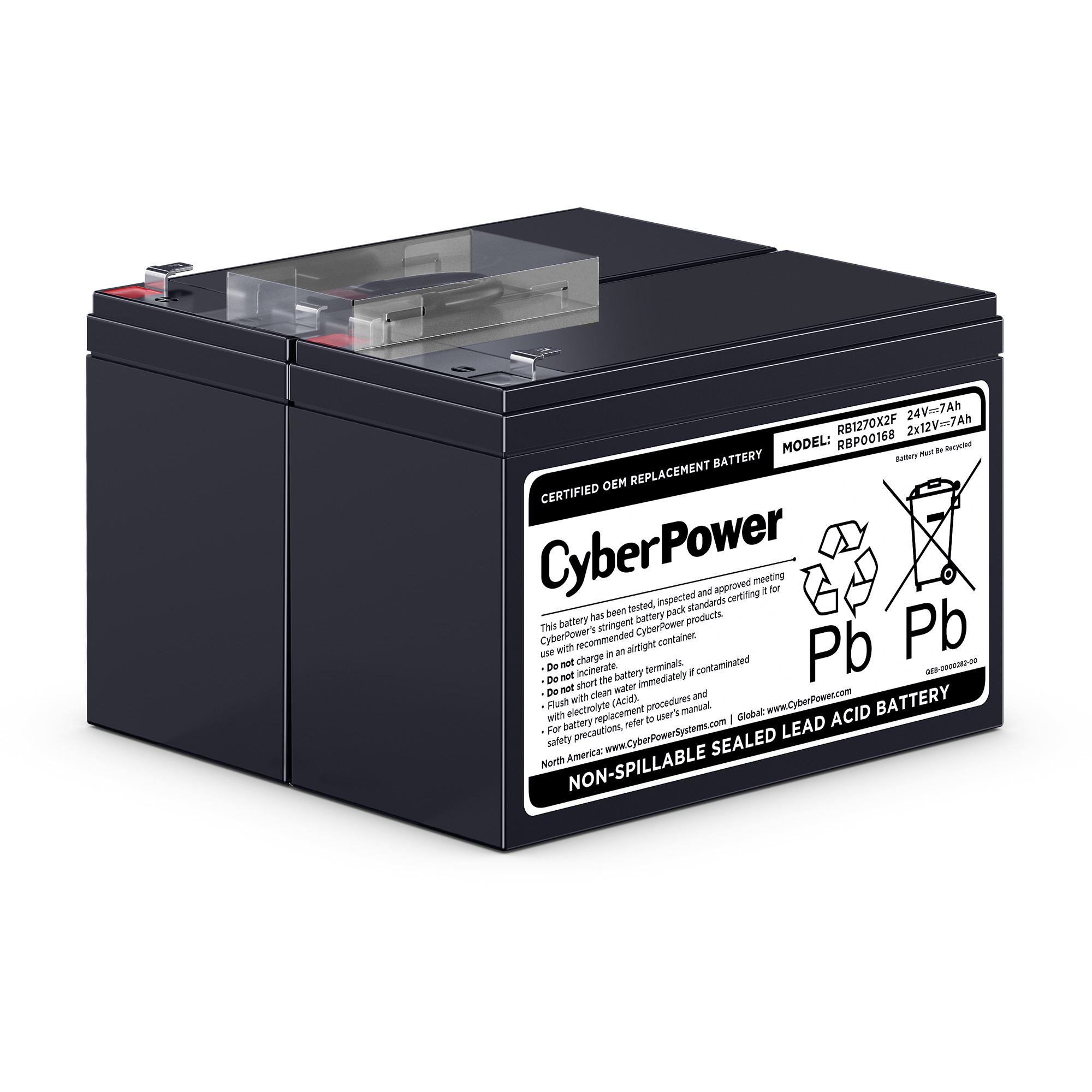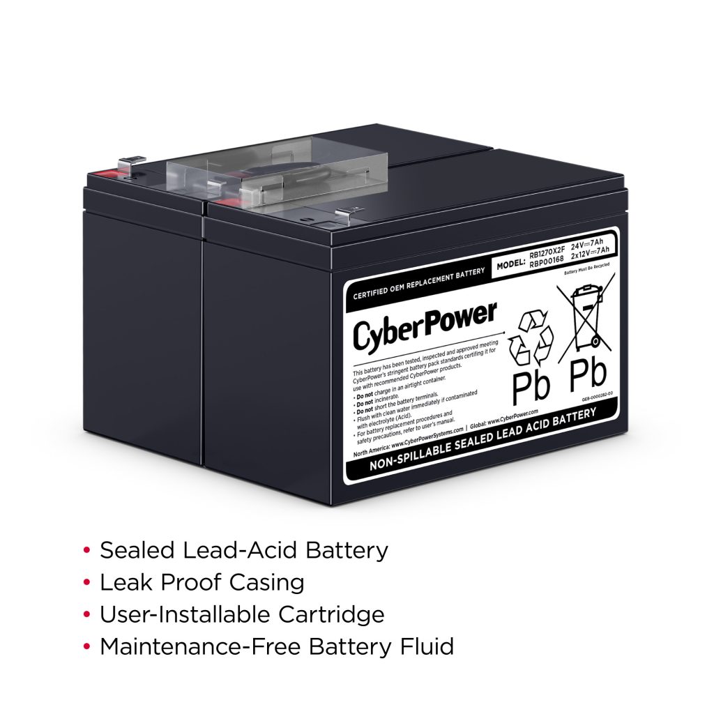 The RB1270X2F UPS Replacement Battery Cartridge restores life to CyberPower UPS systems that have weak or completely depleted internal batteries. The RB1270X2F contains two 12V/7AH replacement batteries, certified to meet or exceed original manufacturer specifications. These leak-proof, sealed lead-acid batteries never require replacement fluid. The pre-assembled cartridge installs easily into your CyberPower UPS system and is shipped with reusable packaging for delivering expired batteries to a suitable recycling center. The RB1270X2F comes with instructions, recycling information, and an eighteen-month warranty.