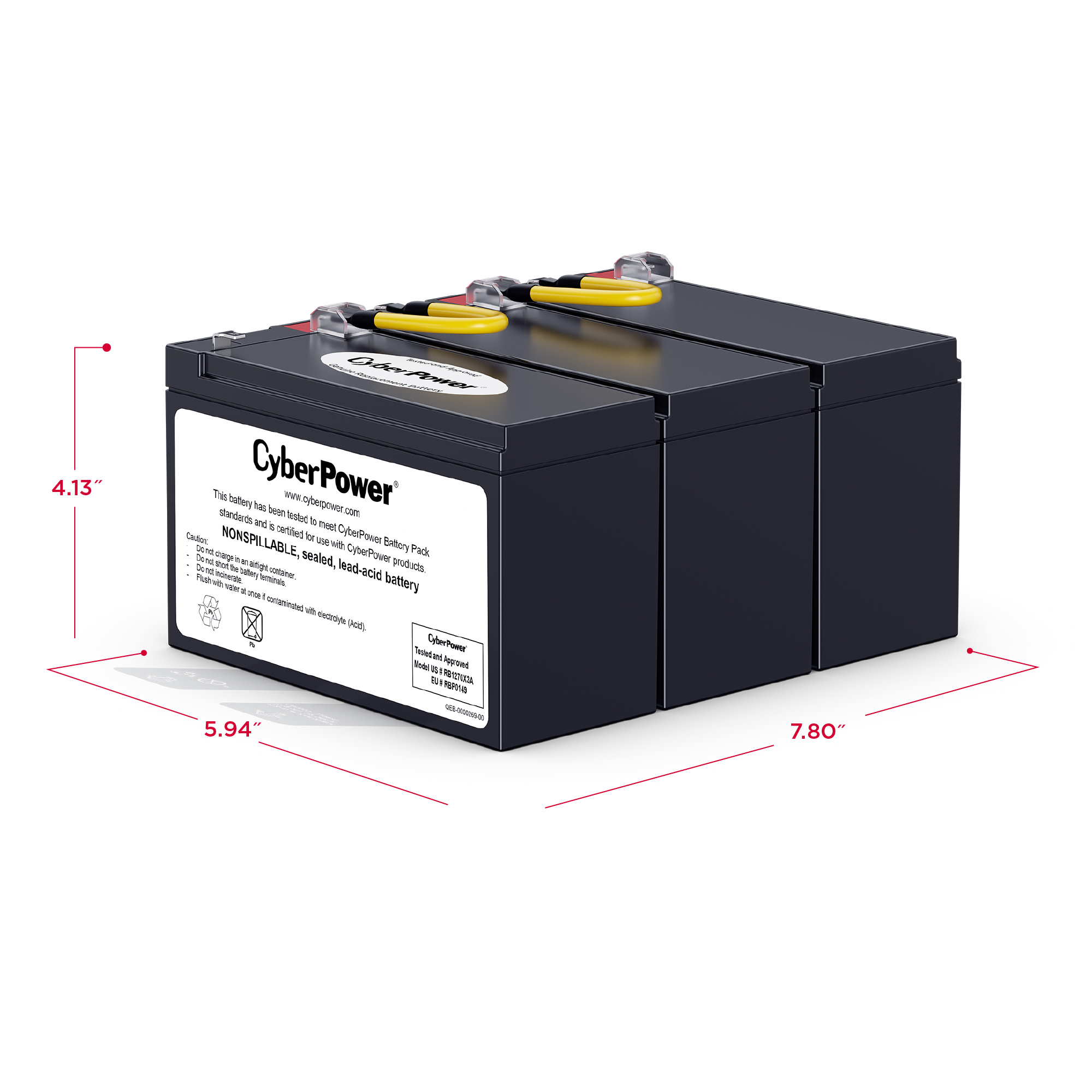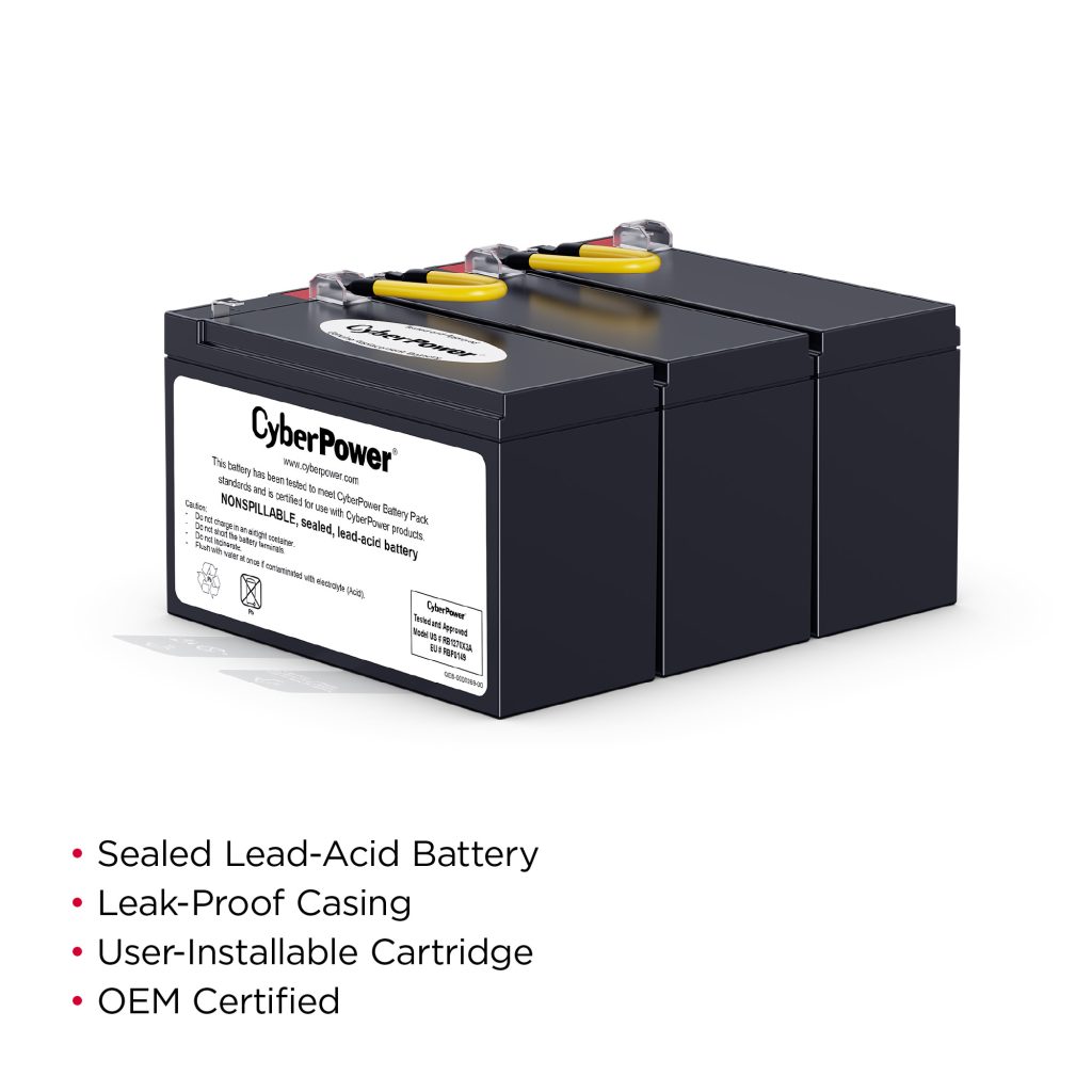 The RB1270X3A UPS Replacement Battery Cartridge restores life to CyberPower UPS systems that have weak or completely depleted internal batteries. The RB1270X3A contains three 12V/7Ah batteries, certified to meet or exceed original manufacturer specifications. This leak-proof, sealed lead-acid battery never requires replacement fluid. The pre-assembled cartridge installs easily into your CyberPower UPS system and is shipped with reusable packaging for delivering expired batteries to a suitable recycling center. The RB1270X3A comes with instructions, recycling information, and an eighteen-month warranty.