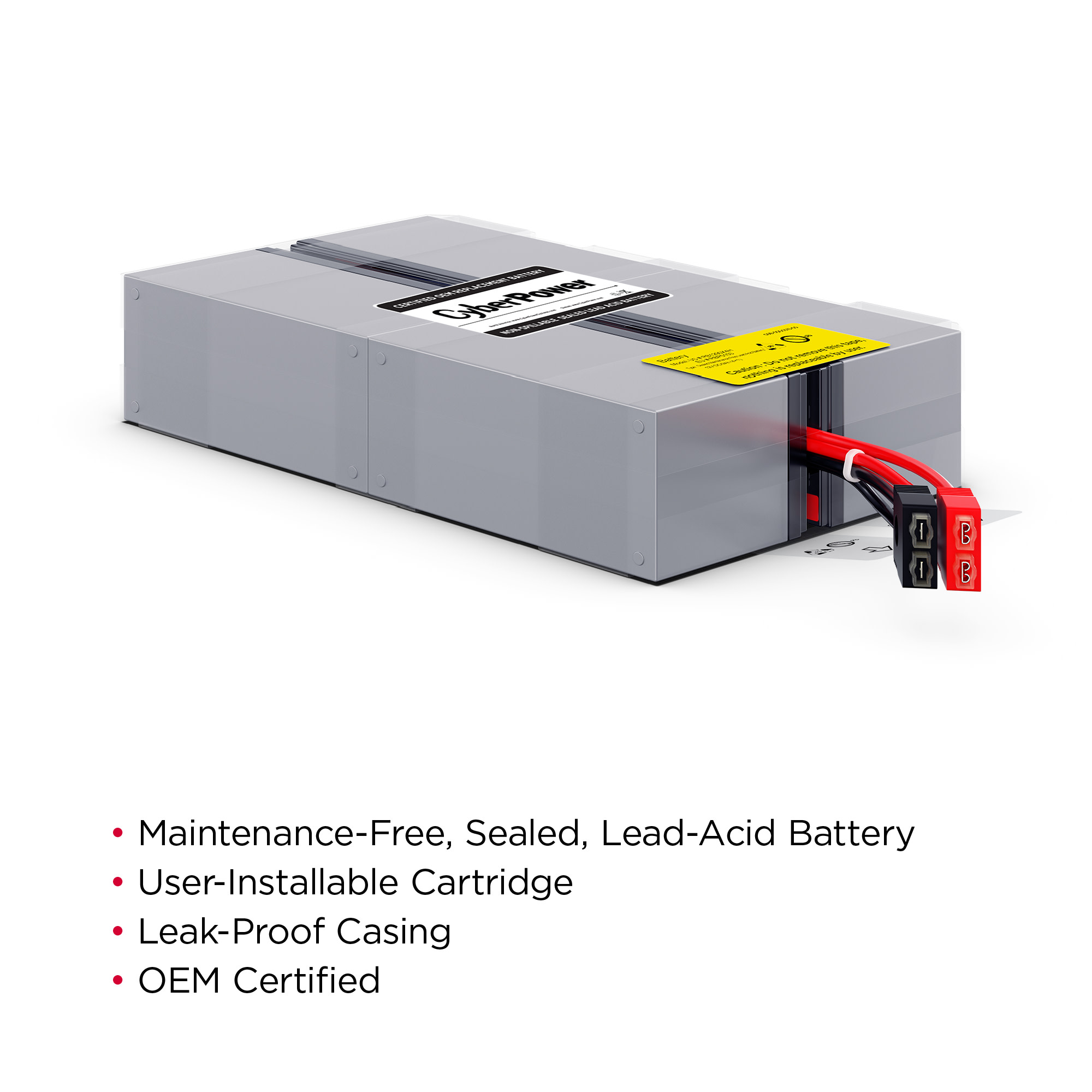 The RB1290X4H UPS Replacement Battery Cartridge restores life to CyberPower UPS systems that have weak or completely depleted internal batteries. The RB1290X4H contains four 12V/9Ah batteries, certified to meet or exceed original manufacturer specifications. This leak-proof, sealed lead-acid battery never requires replacement fluid. The pre-assembled cartridge installs easily into your CyberPower UPS system and is shipped with reusable packaging for delivering expired batteries to a suitable recycling center. The RB1290X4H comes with instructions, recycling information, and an eighteen-month warranty.