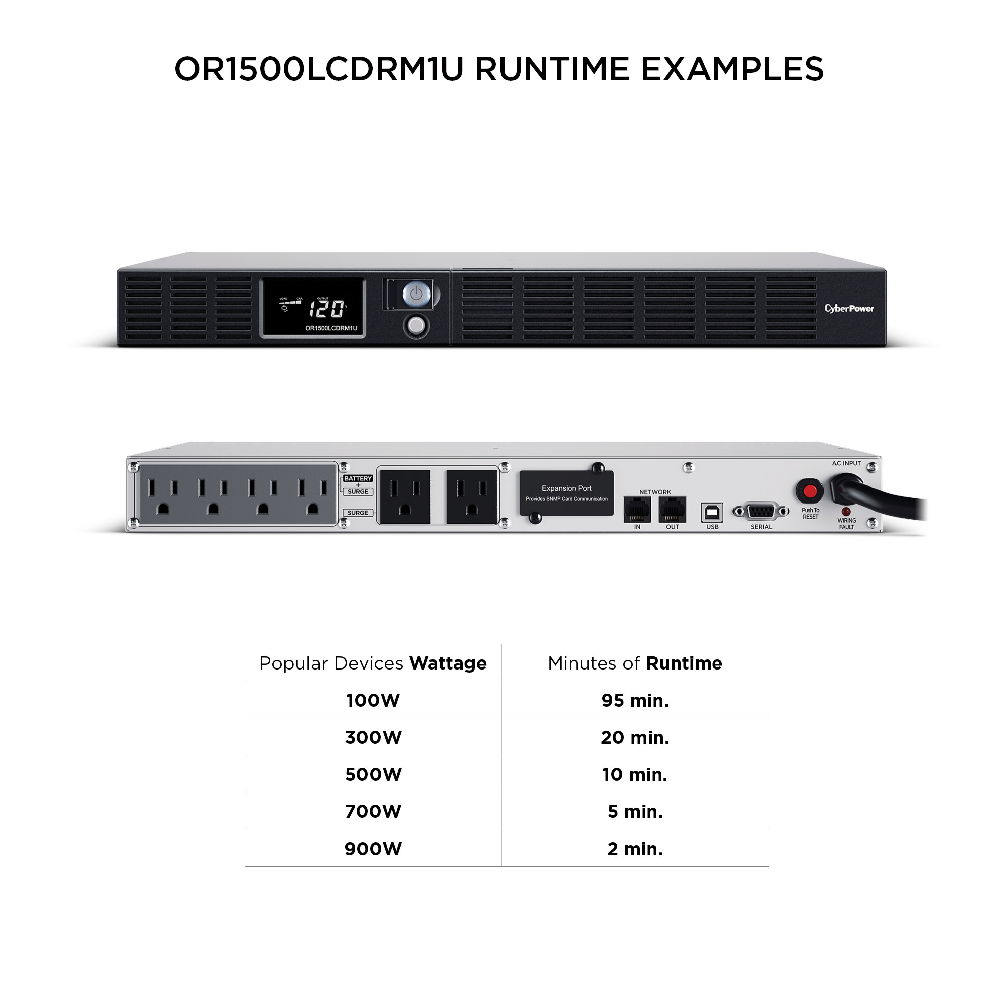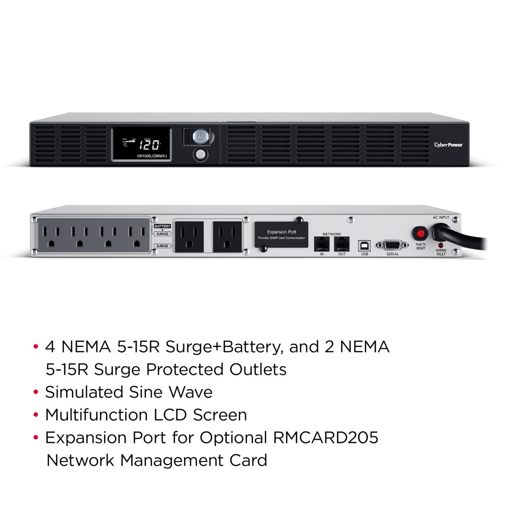 This model accepts the RMCARD205 network management card for remote management and control via a standard web browser or network management system. The OR1500LCDRM1U comes with a three-year warranty and a $300,000 Connected Equipment Guarantee.