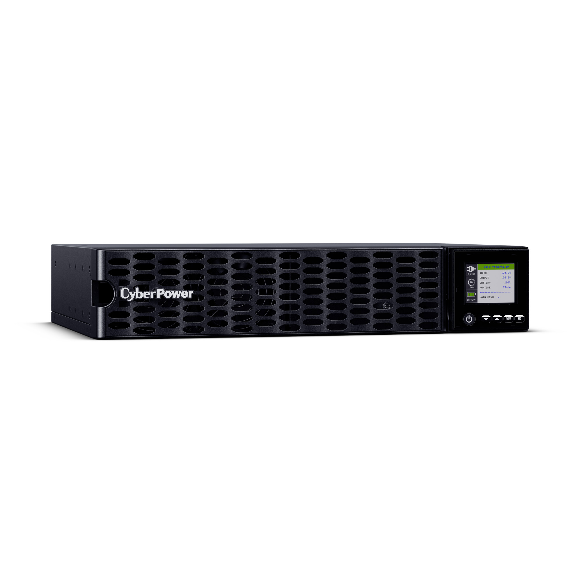 Auto-rotating, multi-function color LCD screen clearly shows status of UPS and power (green for normal, yellow for warning, and red for power failure and fault notices). LCD provides UPS status, controls, most recent event logs, and diagnostics. -