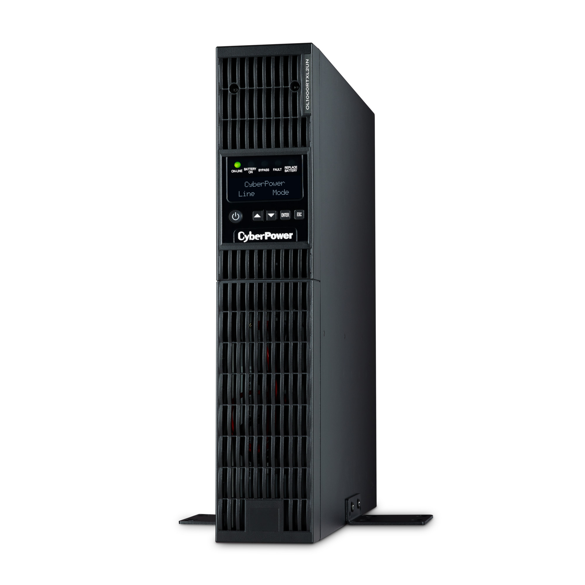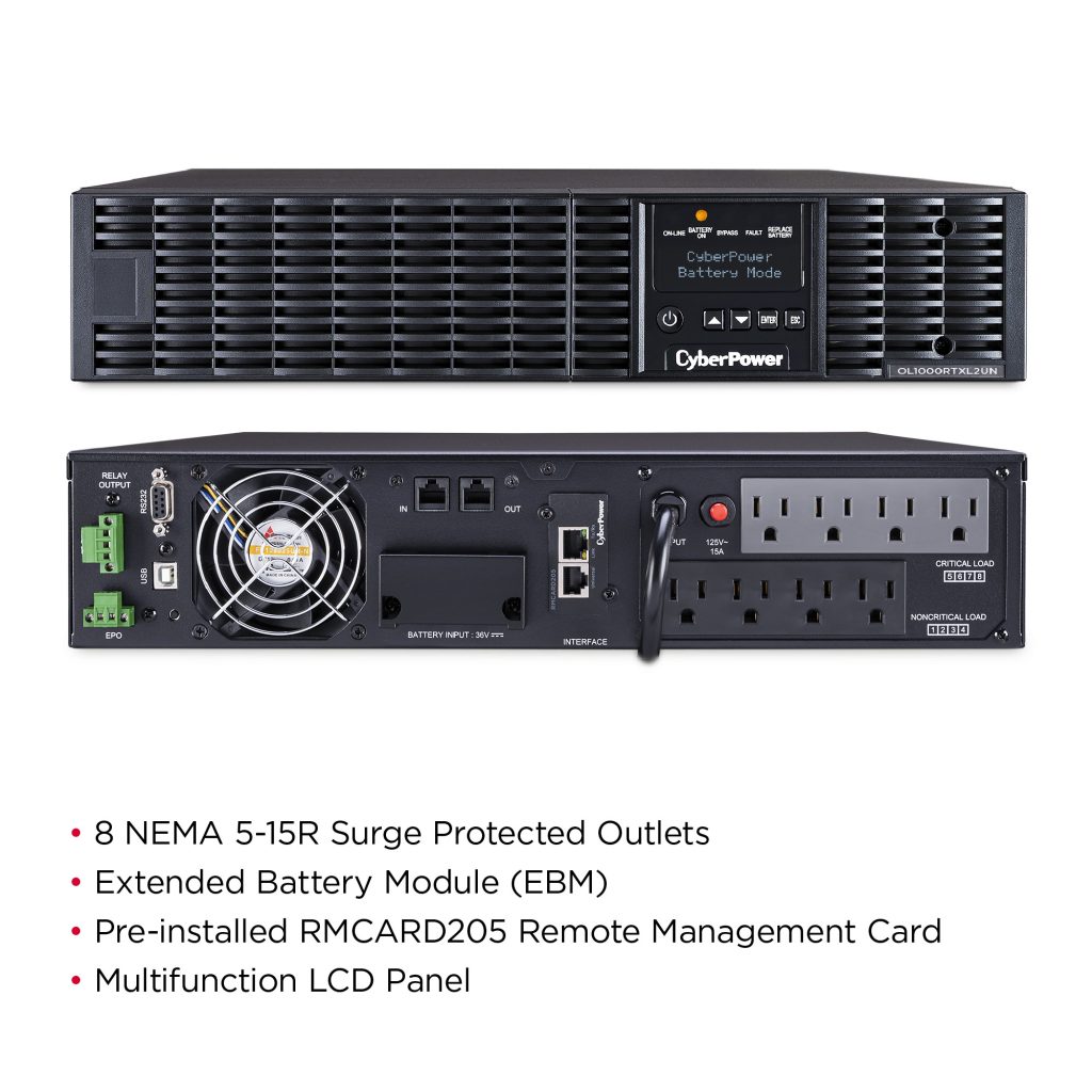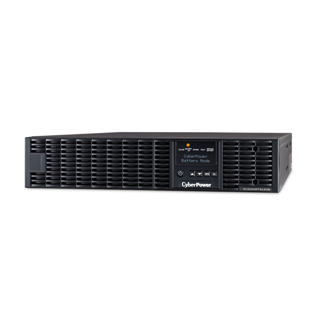 The CyberPower OL1000RTXL2UN is a rack/tower UPS with double conversion topology. It provides sine wave output to critical applications and equipment that require seamless power correction. The Extended Battery Module (EBM) expands runtime, and Fast Charge Technology restores full backup power faster. This model comes with an extendable LCD control panel, Smart Battery Management charging technology, and energy-saving GreenPower UPS™ ECO Mode.
