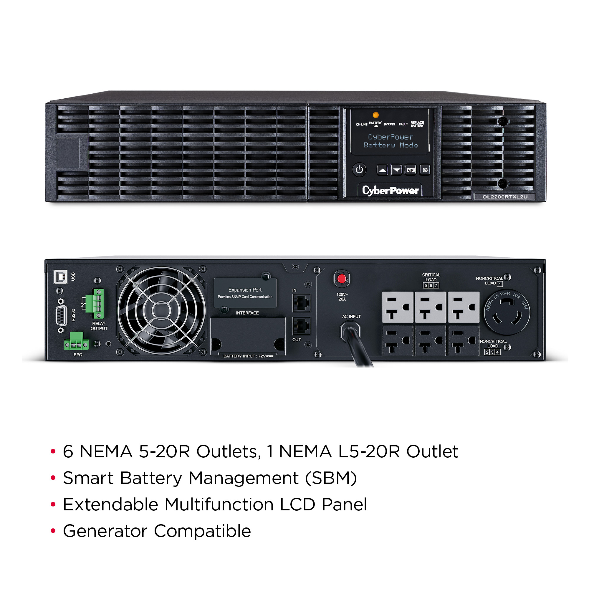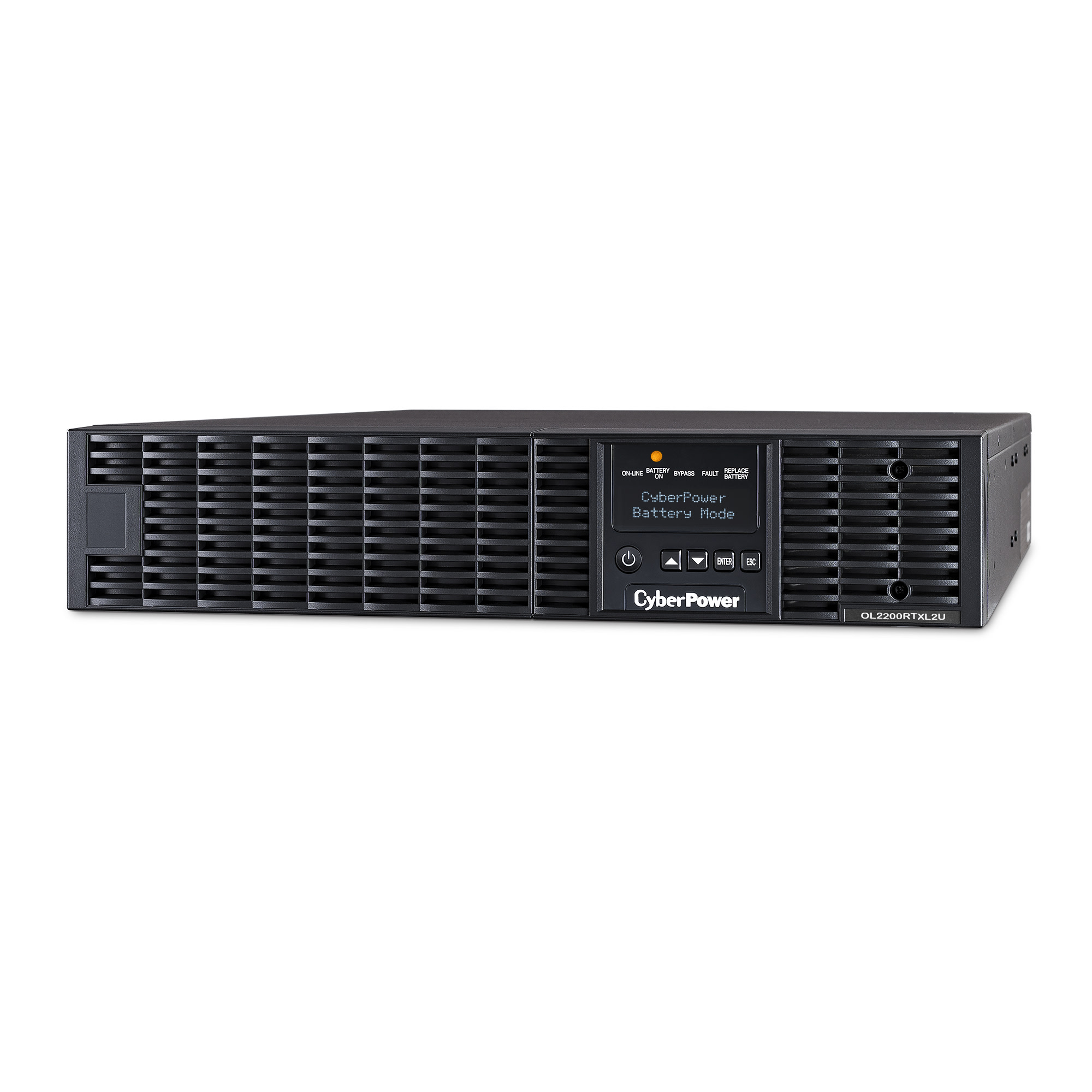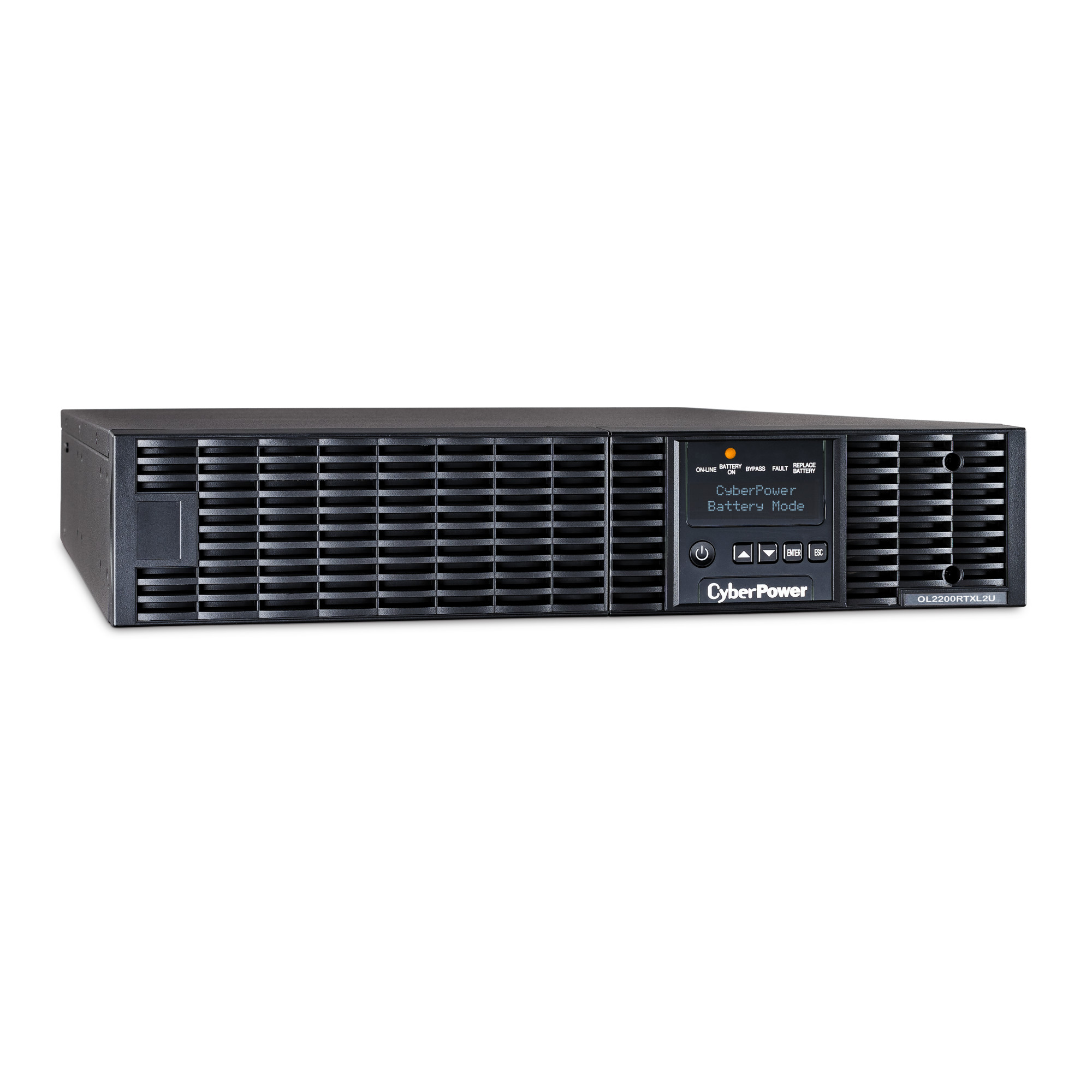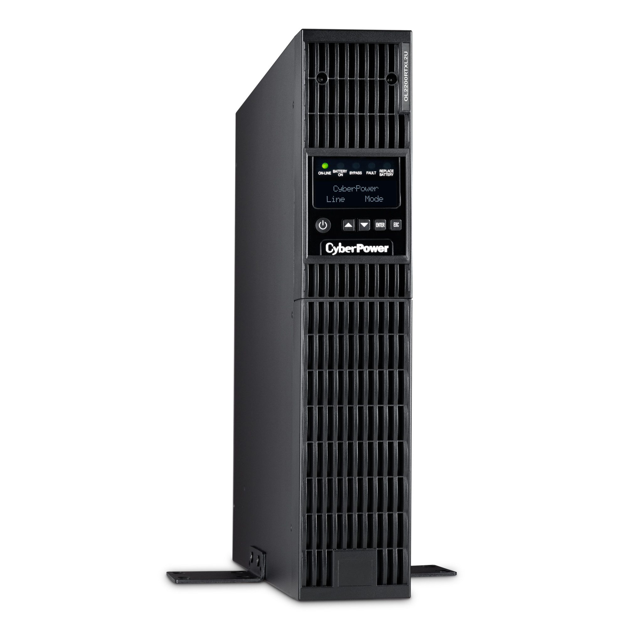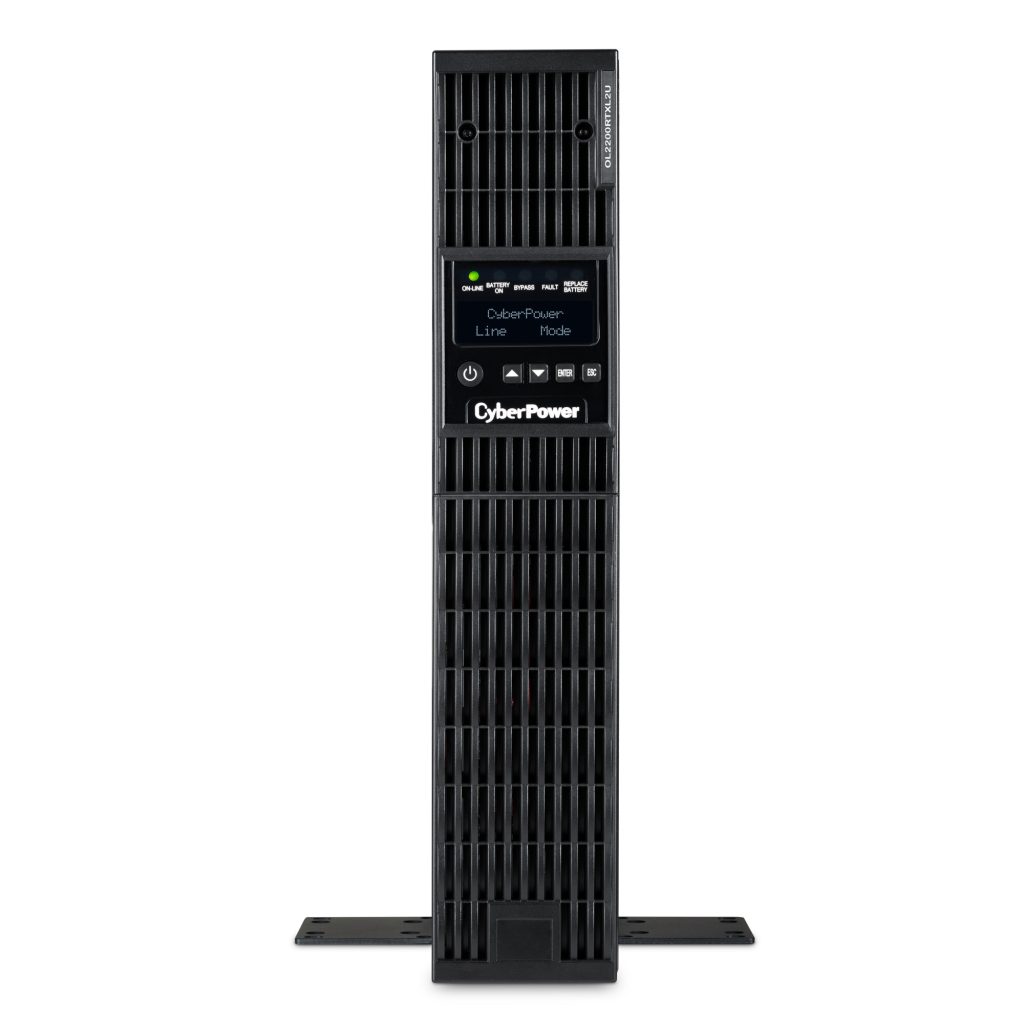 The CyberPower OL2200RTXL2U is a rack/tower UPS with double conversion topology. It provides sine wave output to critical applications and equipment that require seamless power correction. The Extended Battery Module (EBM) expands runtime, and Fast Charge Technology restores full backup power faster. This model comes with an extendable LCD control panel, Smart Battery Management charging technology, and energy-saving GreenPower UPS™ ECO Mode.