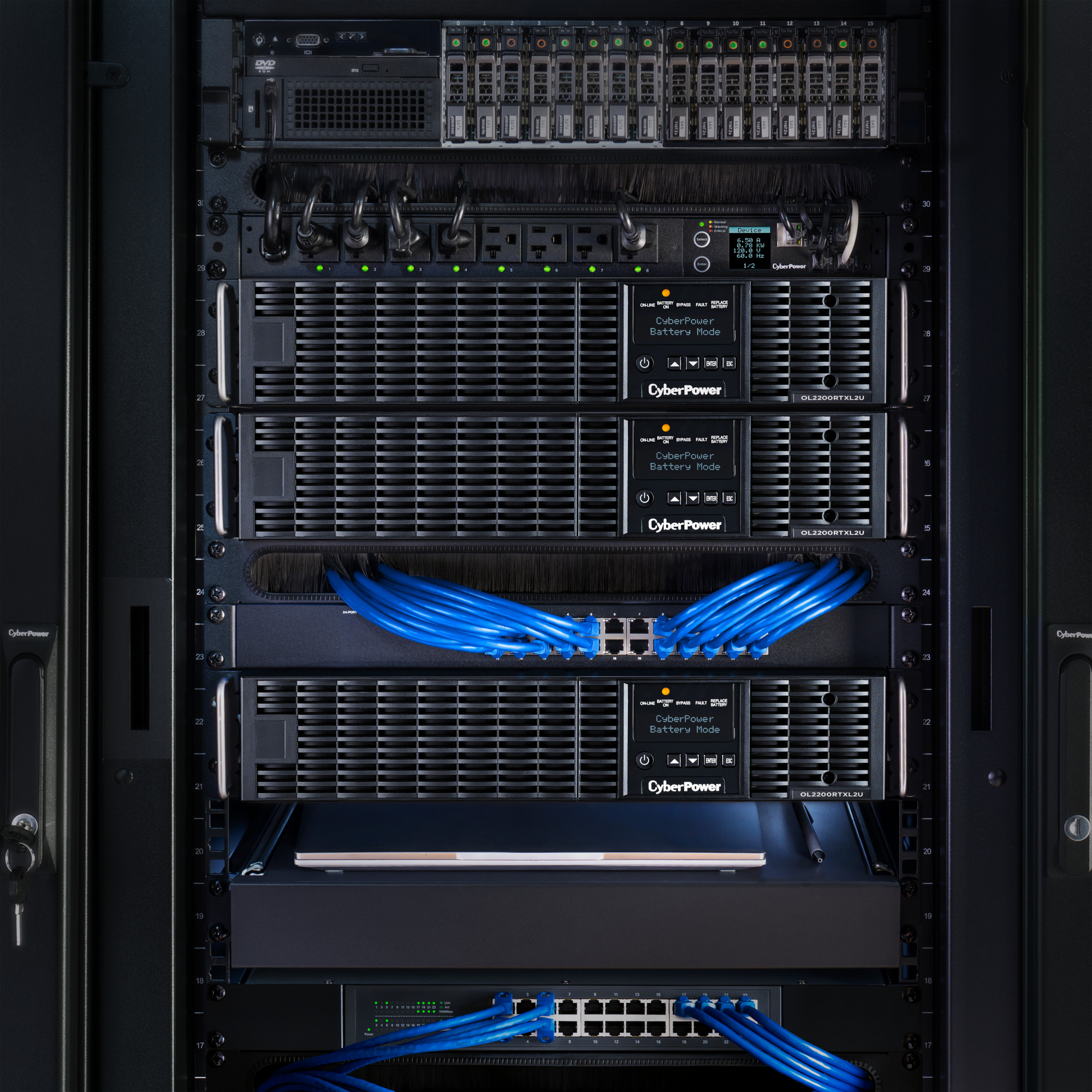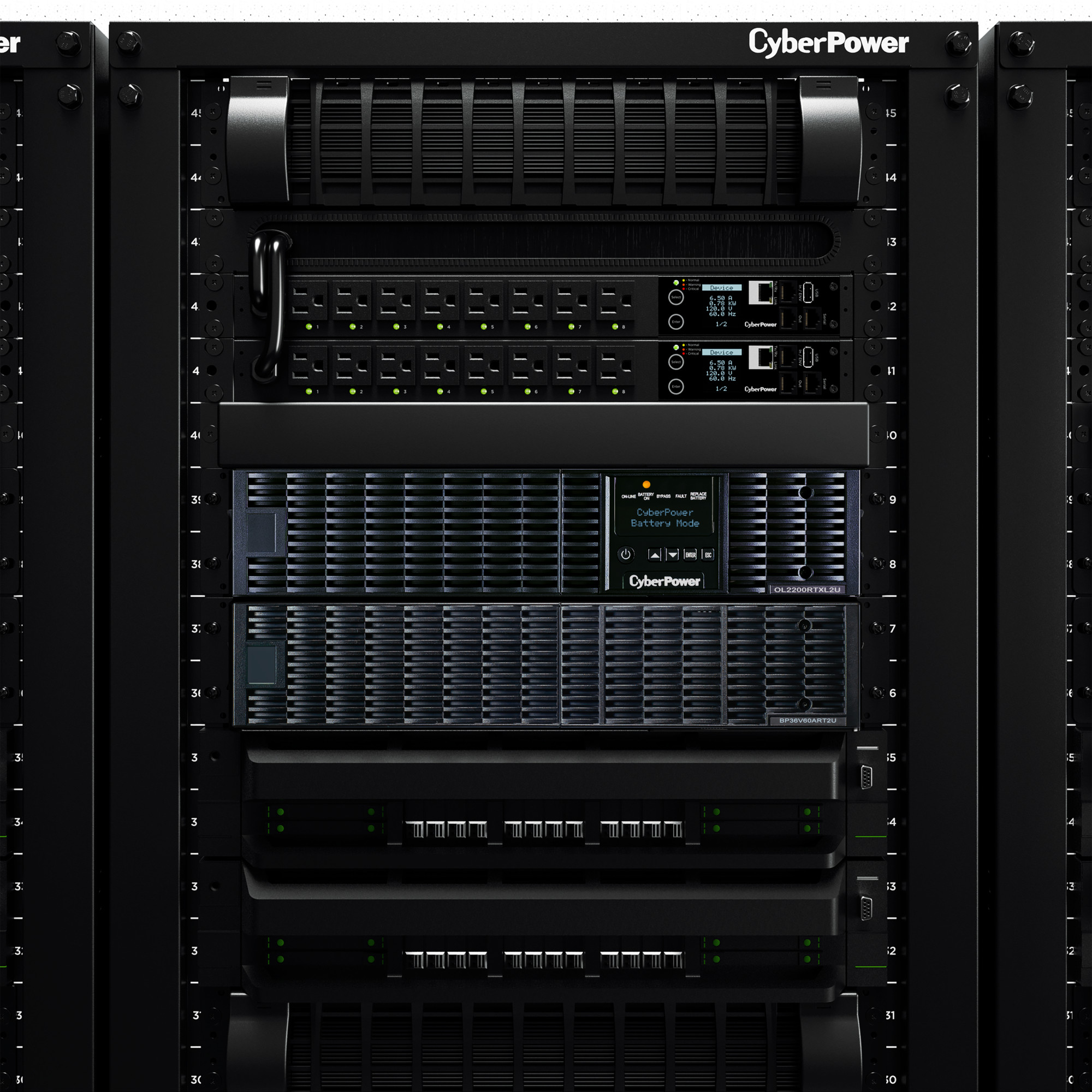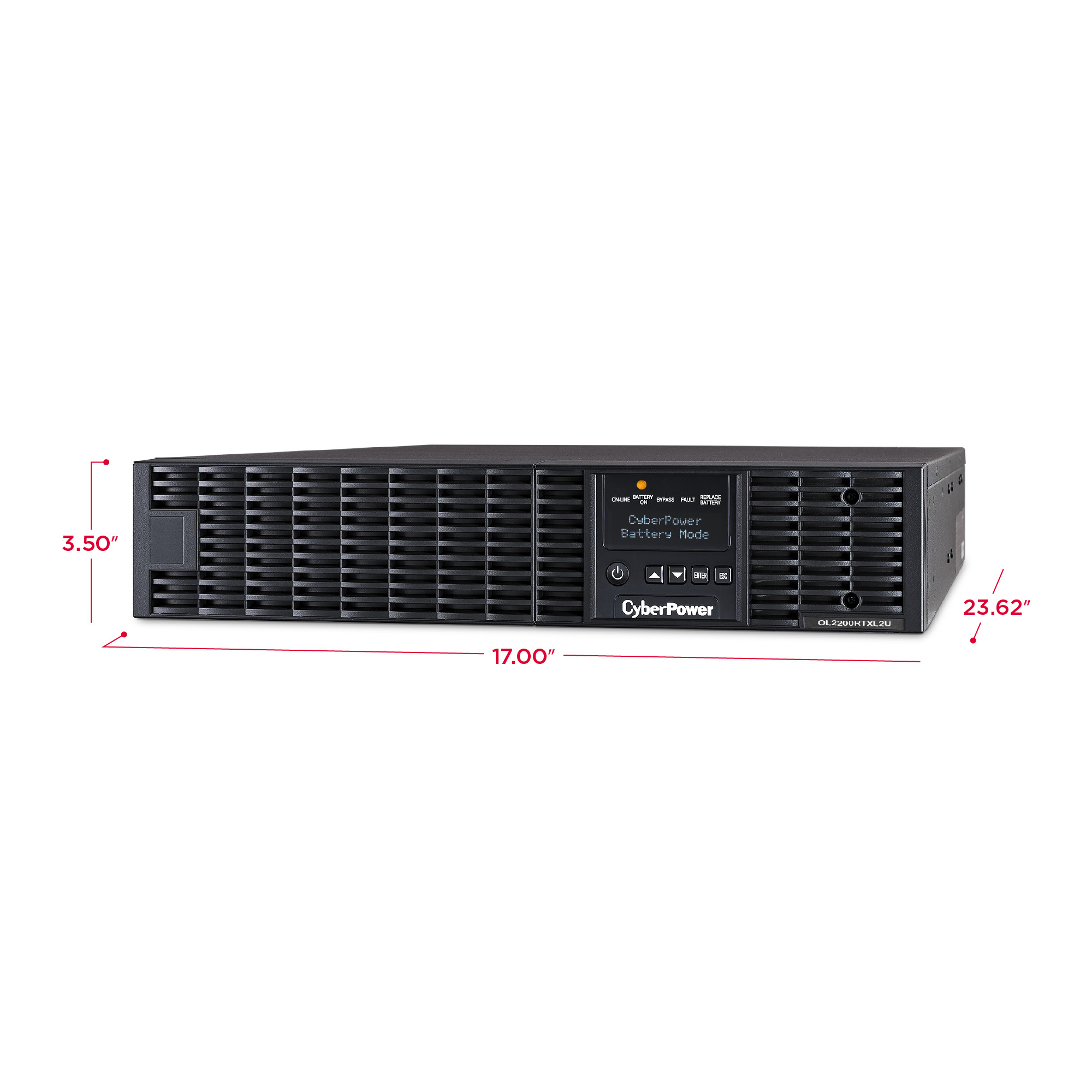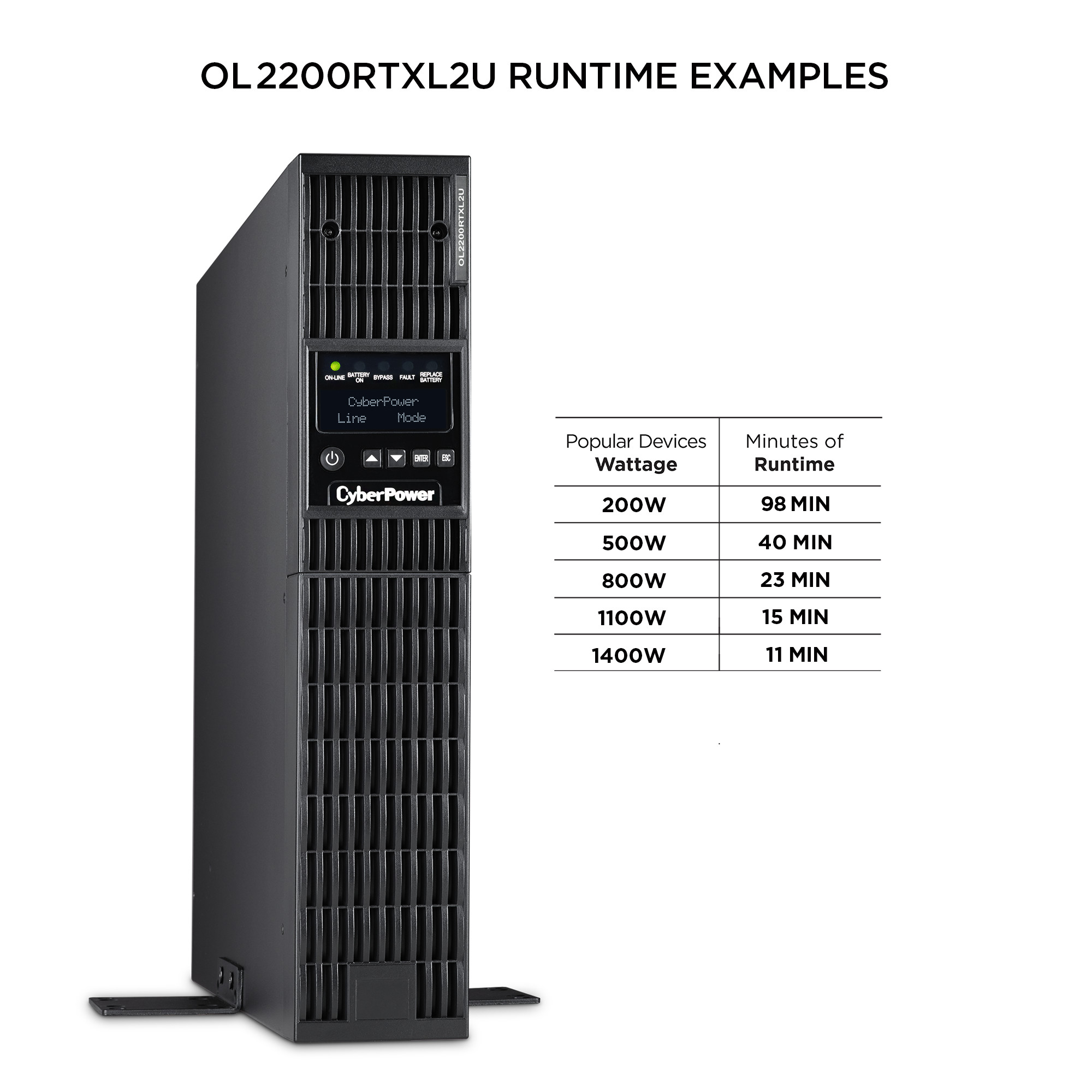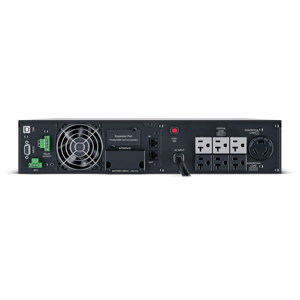 The CyberPower OL2200RTXL2U is a rack/tower UPS with double conversion topology. It provides sine wave output to critical applications and equipment that require seamless power correction. The Extended Battery Module (EBM) expands runtime, and Fast Charge Technology restores full backup power faster. This model comes with an extendable LCD control panel, Smart Battery Management charging technology, and energy-saving GreenPower UPS™ ECO Mode.