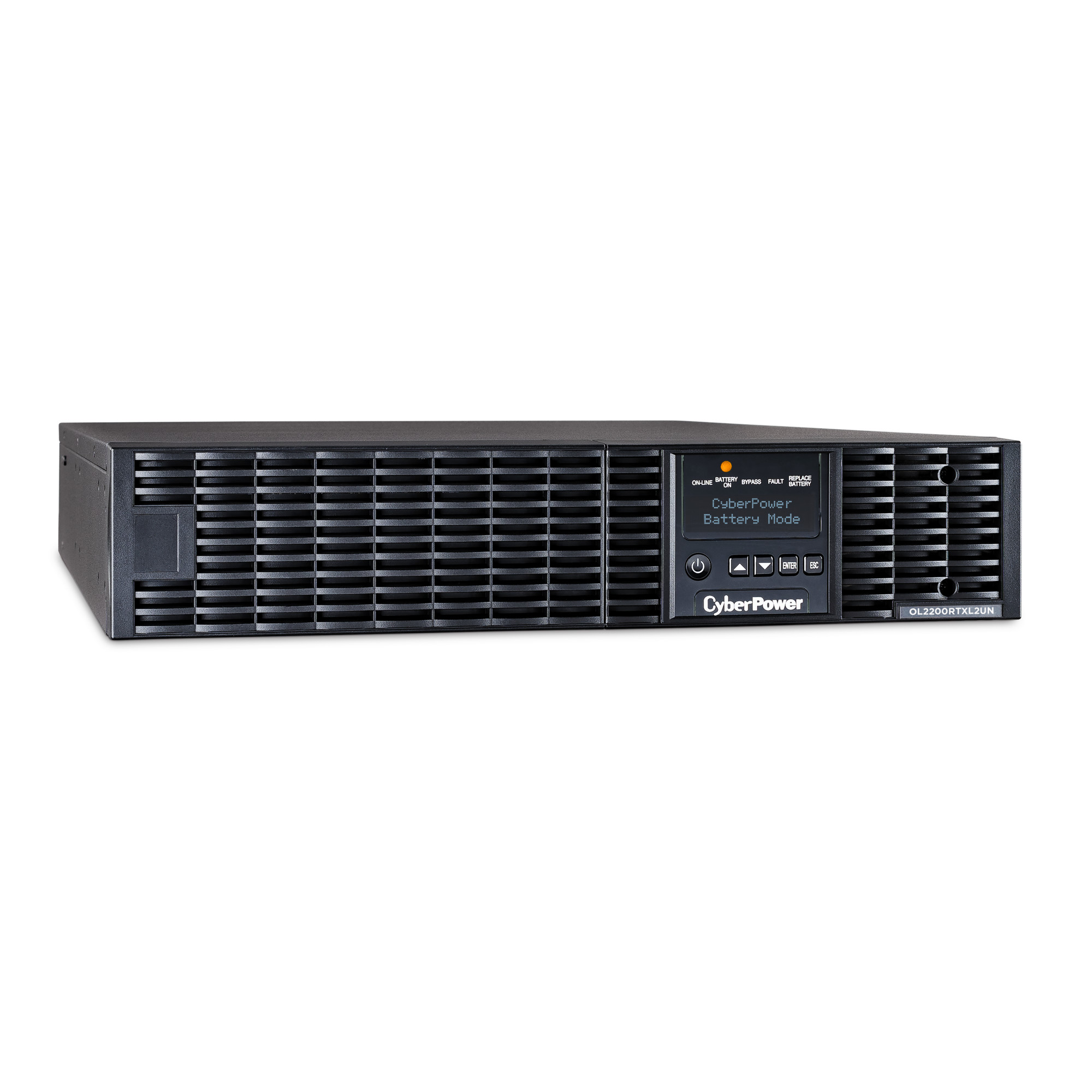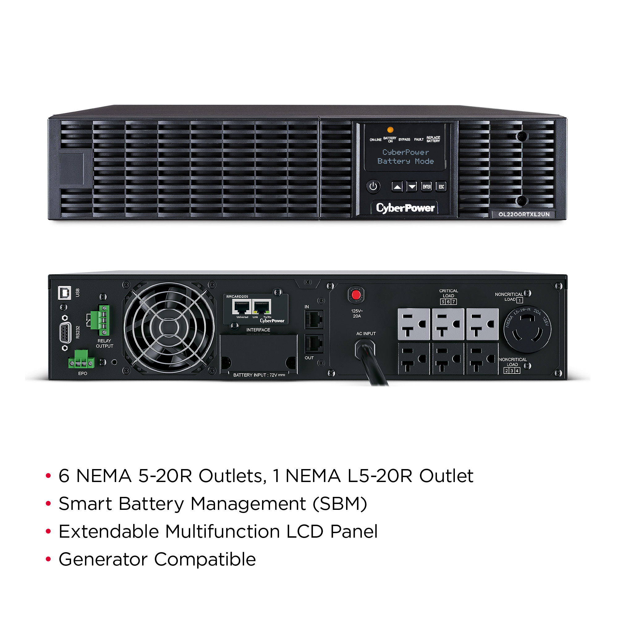 The CyberPower OL2200RTXL2UN is a rack/tower UPS with double conversion topology. It provides sine wave output to critical applications and equipment that require seamless power correction. The Extended Battery Module (EBM) expands runtime, and Fast Charge Technology restores full backup power faster. This model comes with an extendable LCD control panel, Smart Battery Management charging technology, and energy-saving GreenPower UPS™ ECO Mode.