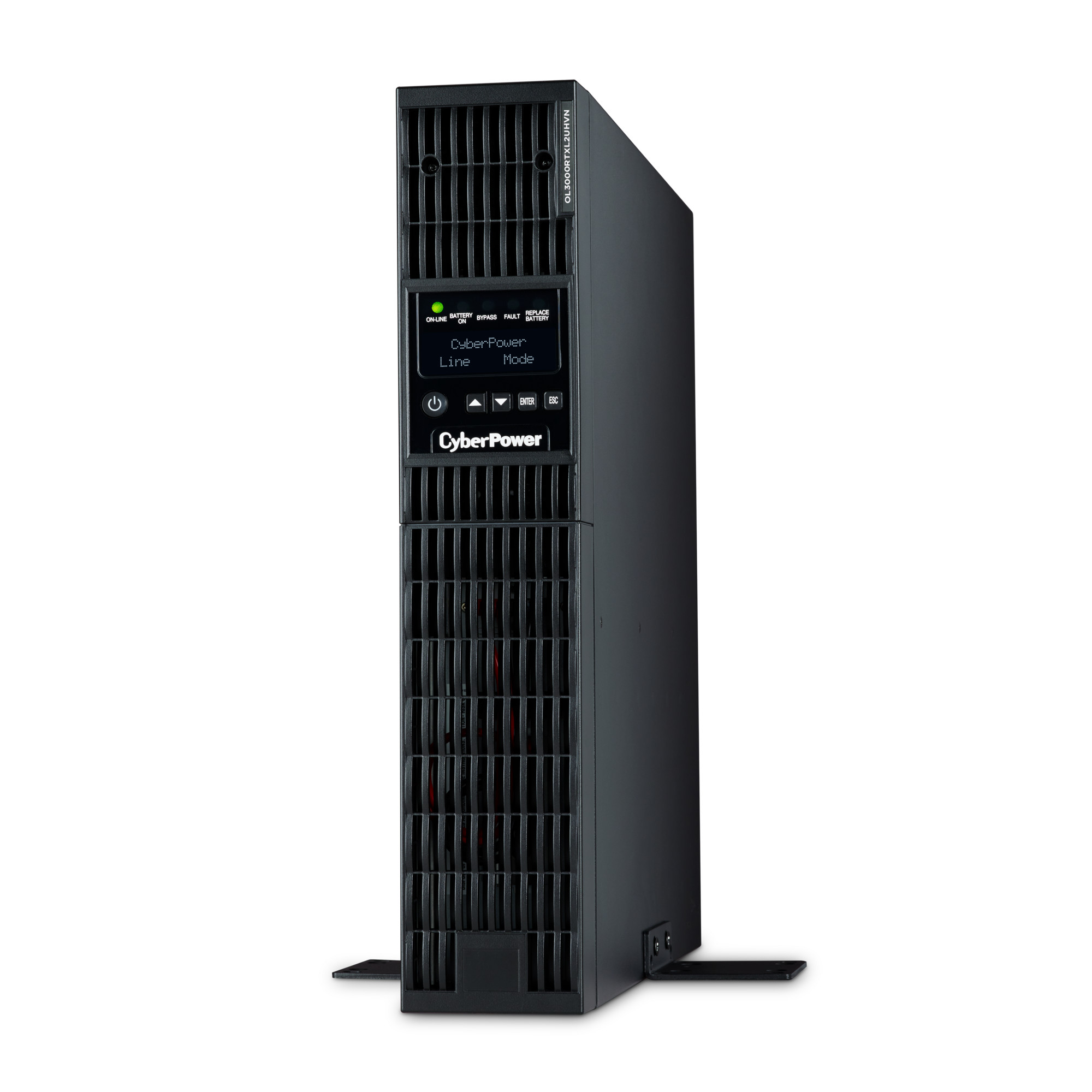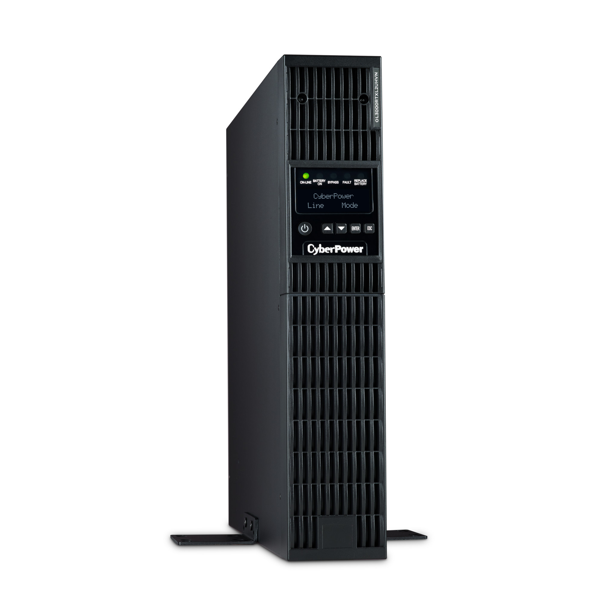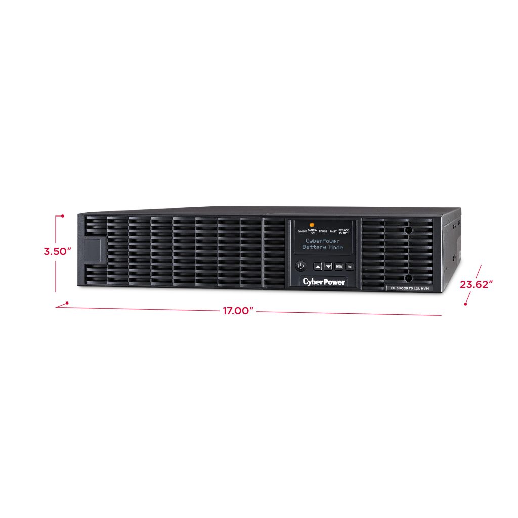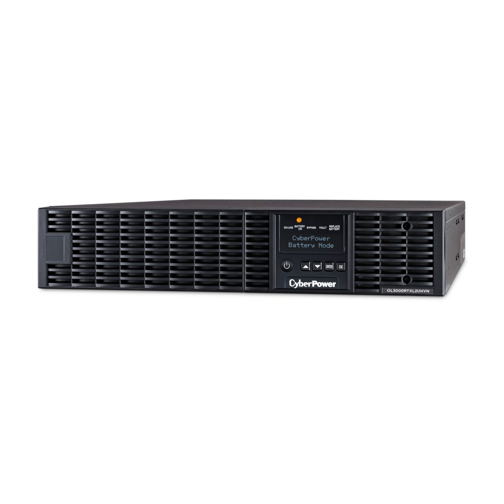 The CyberPower OL3000RTXL2UHVN is a rack/tower UPS with double conversion topology. It provides sine wave output to critical applications and equipment that require seamless power correction. The Extended Battery Module (EBM) expands runtime, and Fast Charge Technology restores full backup power faster. This model comes with an extendable LCD control panel, Smart Battery Management charging technology, and energy-saving GreenPower UPS™ ECO Mode.
